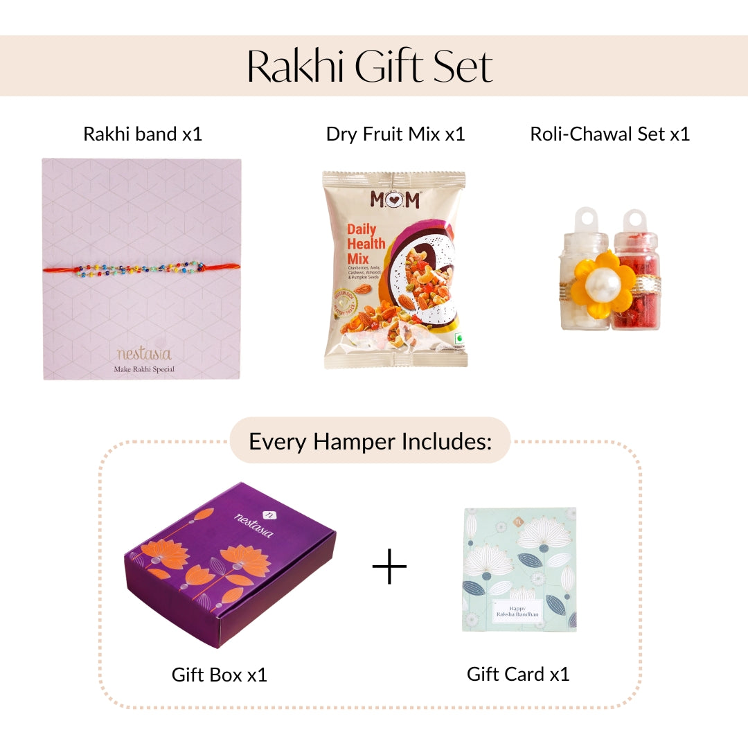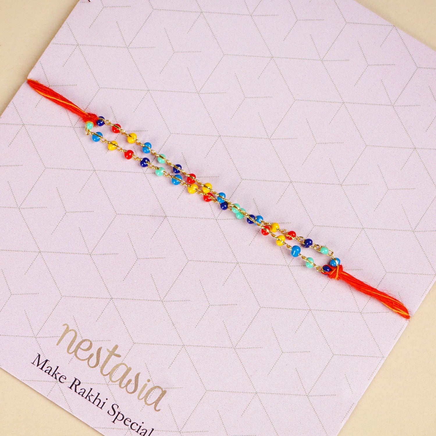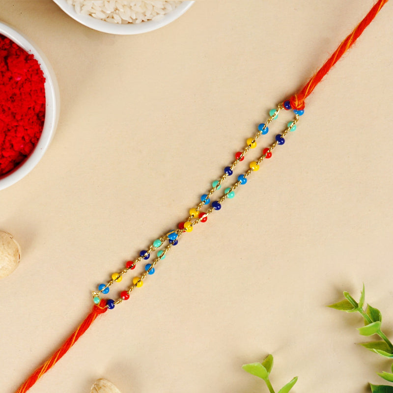 A charming play of coral, turquoise, olive, and ruby tones, this Rakhi features two delicate strands of multi-coloured beads connected with a soft red thread. The double-layered design adds dimension while keeping it light and festive. The set includes 1 rakhi band, 1 roli chawal bottle set, 1 pack of mixed dry fruits (free gift), 1 gift box, and 1 wish card.