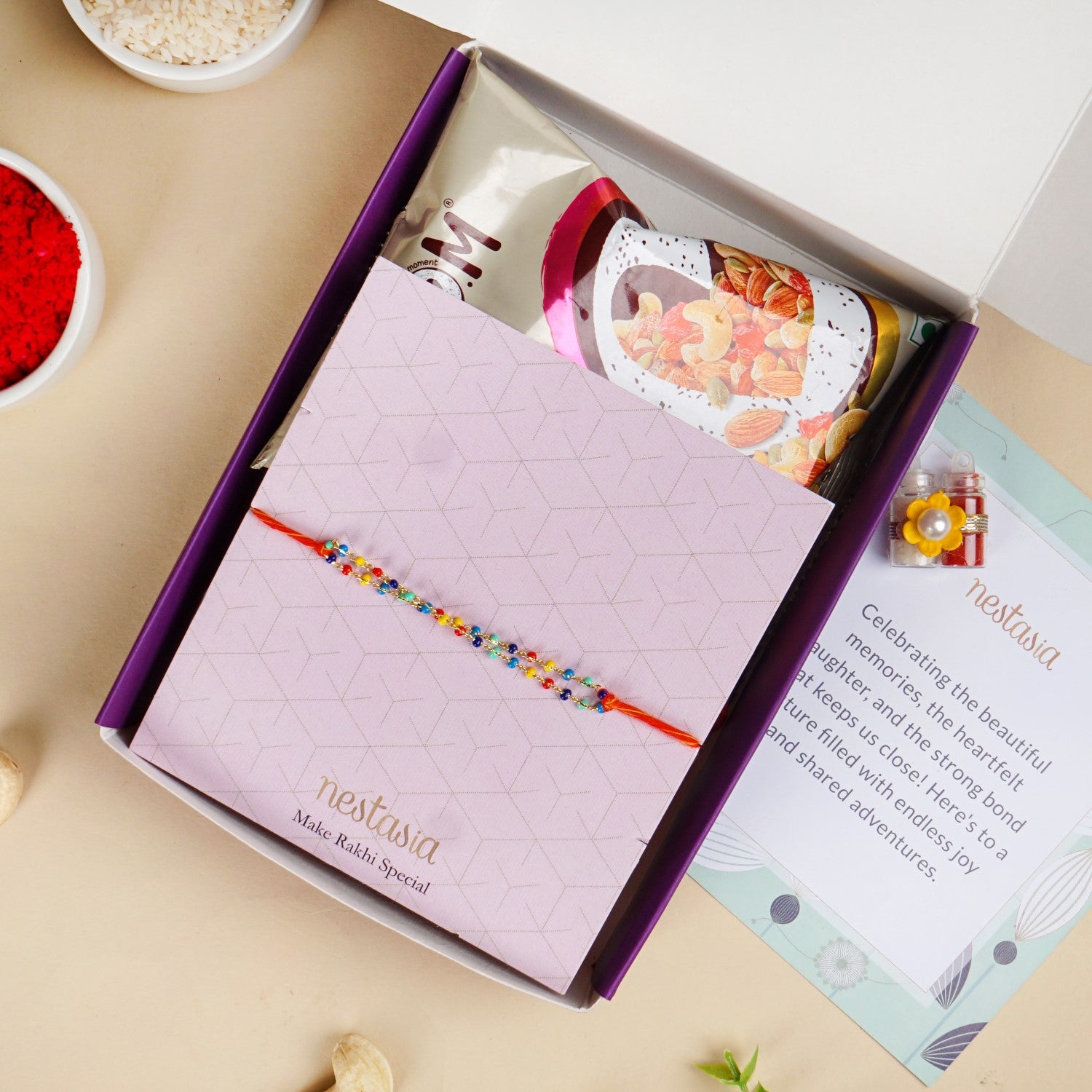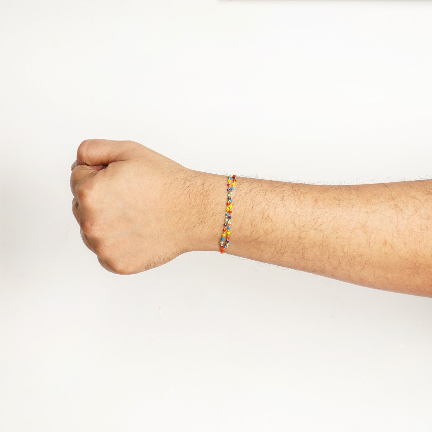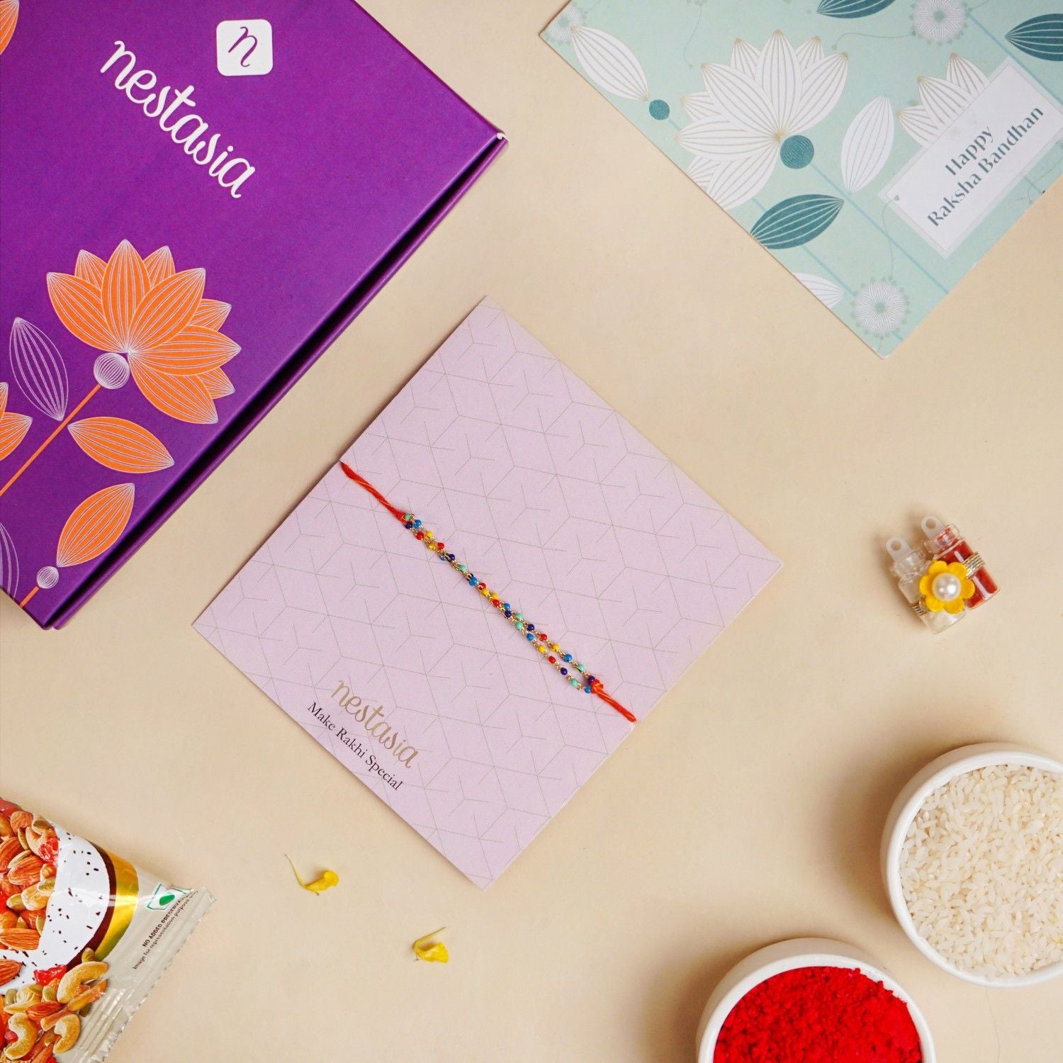 A charming play of coral, turquoise, olive, and ruby tones, this Rakhi features two delicate strands of multi-coloured beads connected with a soft red thread. The double-layered design adds dimension while keeping it light and festive. The set includes 1 rakhi band, 1 roli chawal bottle set, 1 pack of mixed dry fruits (free gift), 1 gift box, and 1 wish card.