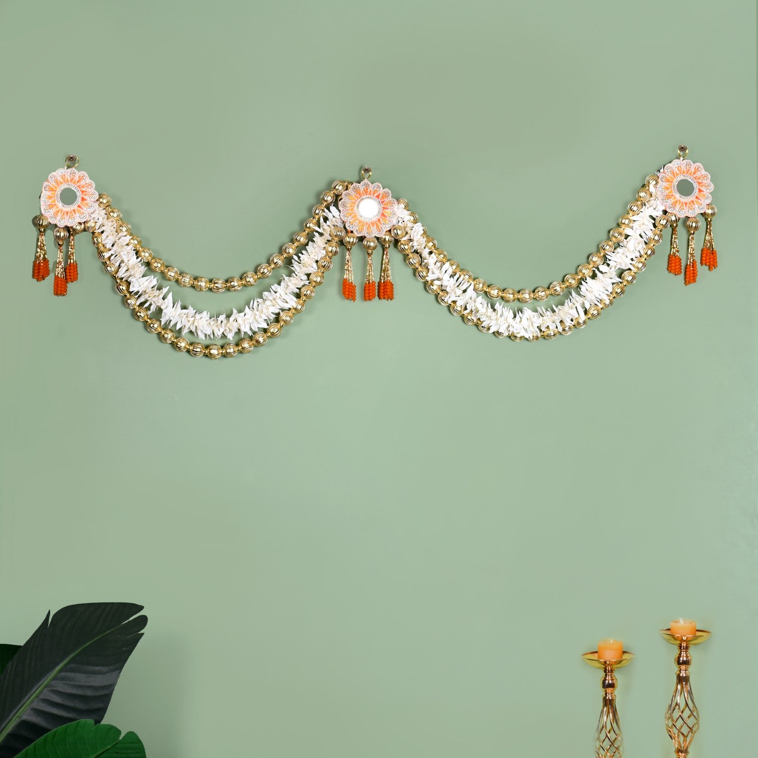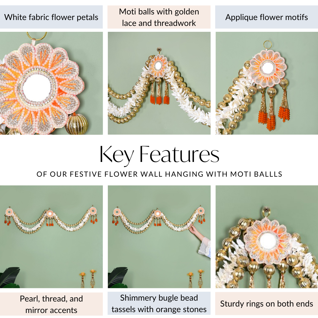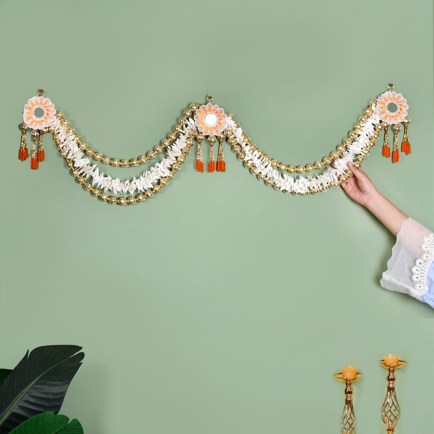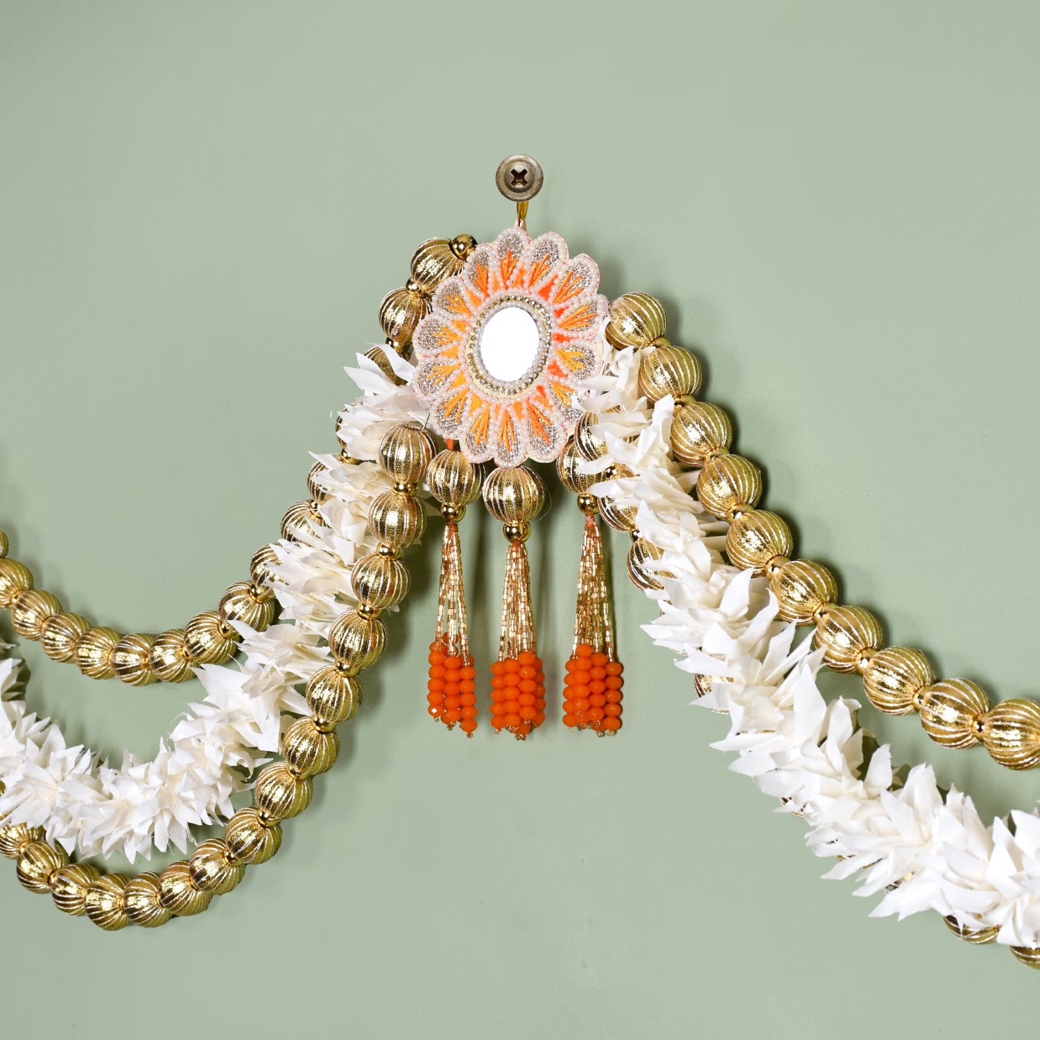 Design: The wall hanging features 3 strands with 2 featuring sparkly golden moti balls and beads and the other showcasing fluffy white fabric flowers, resembling a fresh flower mala. The centre and the two ends showcase applique flowers with threadwork, artificial pearls, and mirror inlays. Sporting 2 sturdy hooks on either end, this charming bandarwar is a breeze to install.