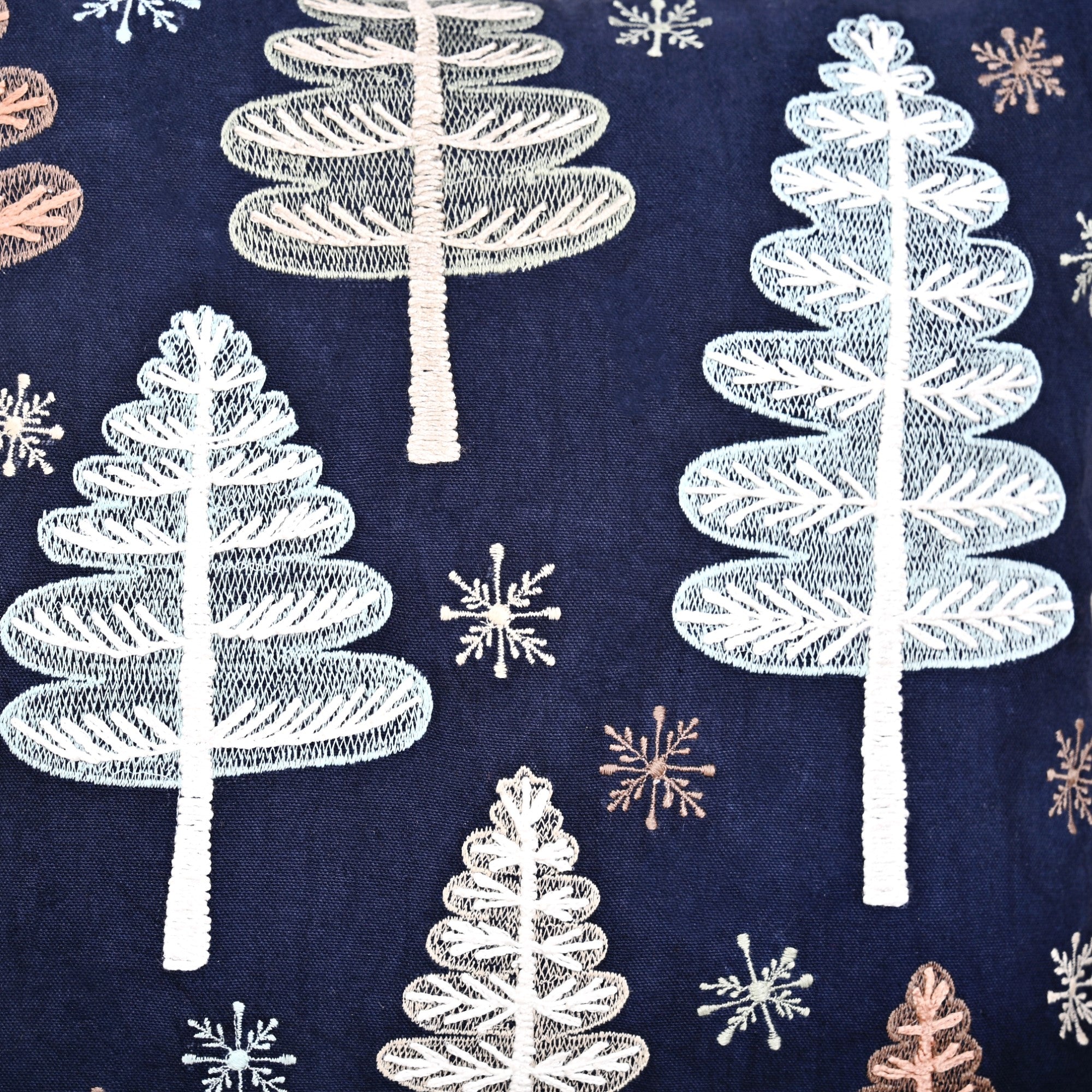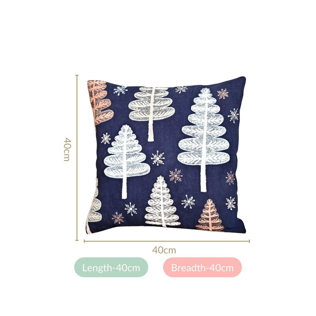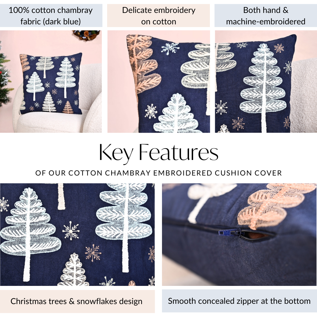 Design: Crafted with a delightful Christmas theme, the sofa cushion cover features a harmonious blend of hand and machine embroidery, showcasing intricate Christmas trees and snowflakes. The rich, dark blue chambray background makes the embroidery pop, adding an elegant seasonal touch to your Christmas decorations. A smooth, concealed bottom zipper ensures easy insert removal while maintaining a seamless look.