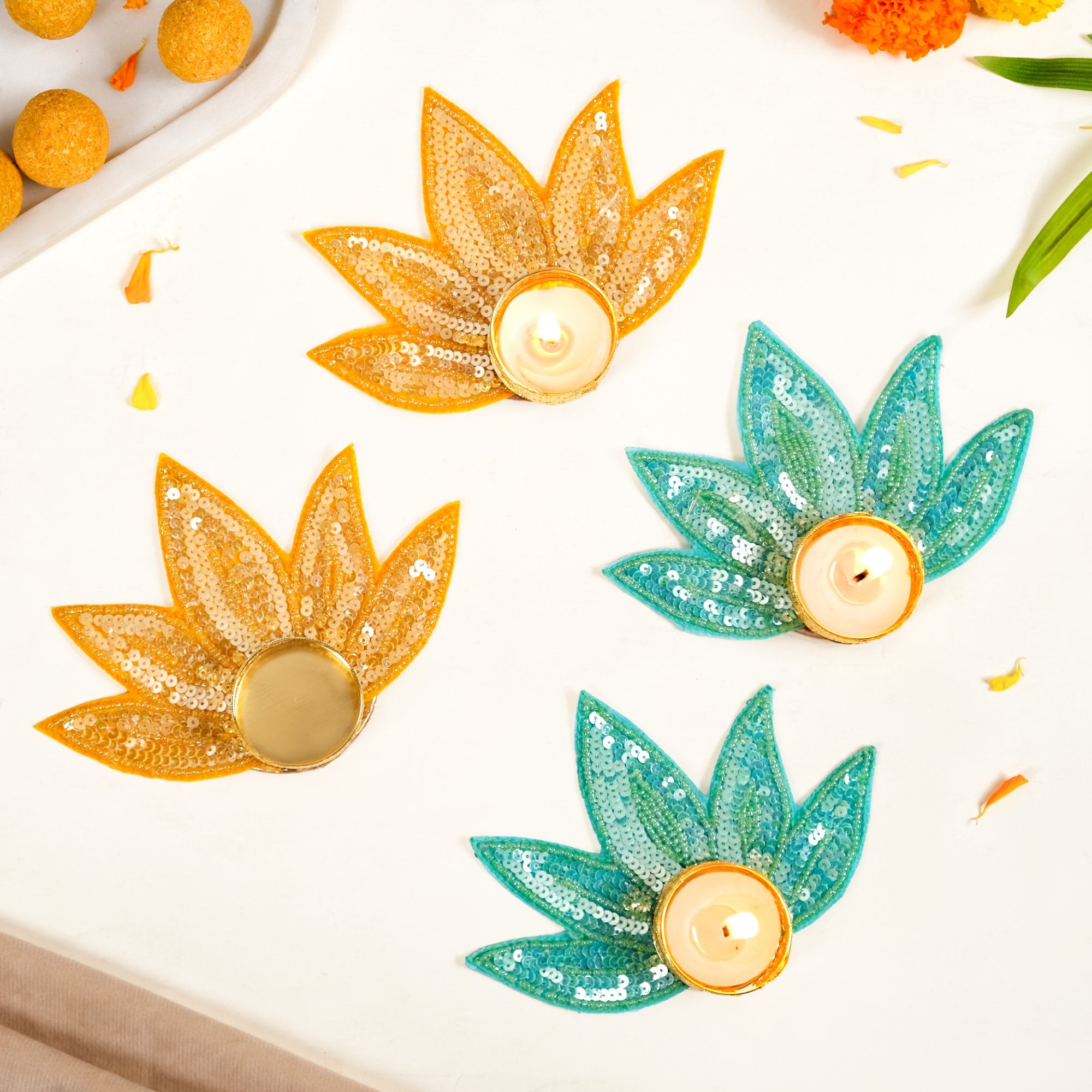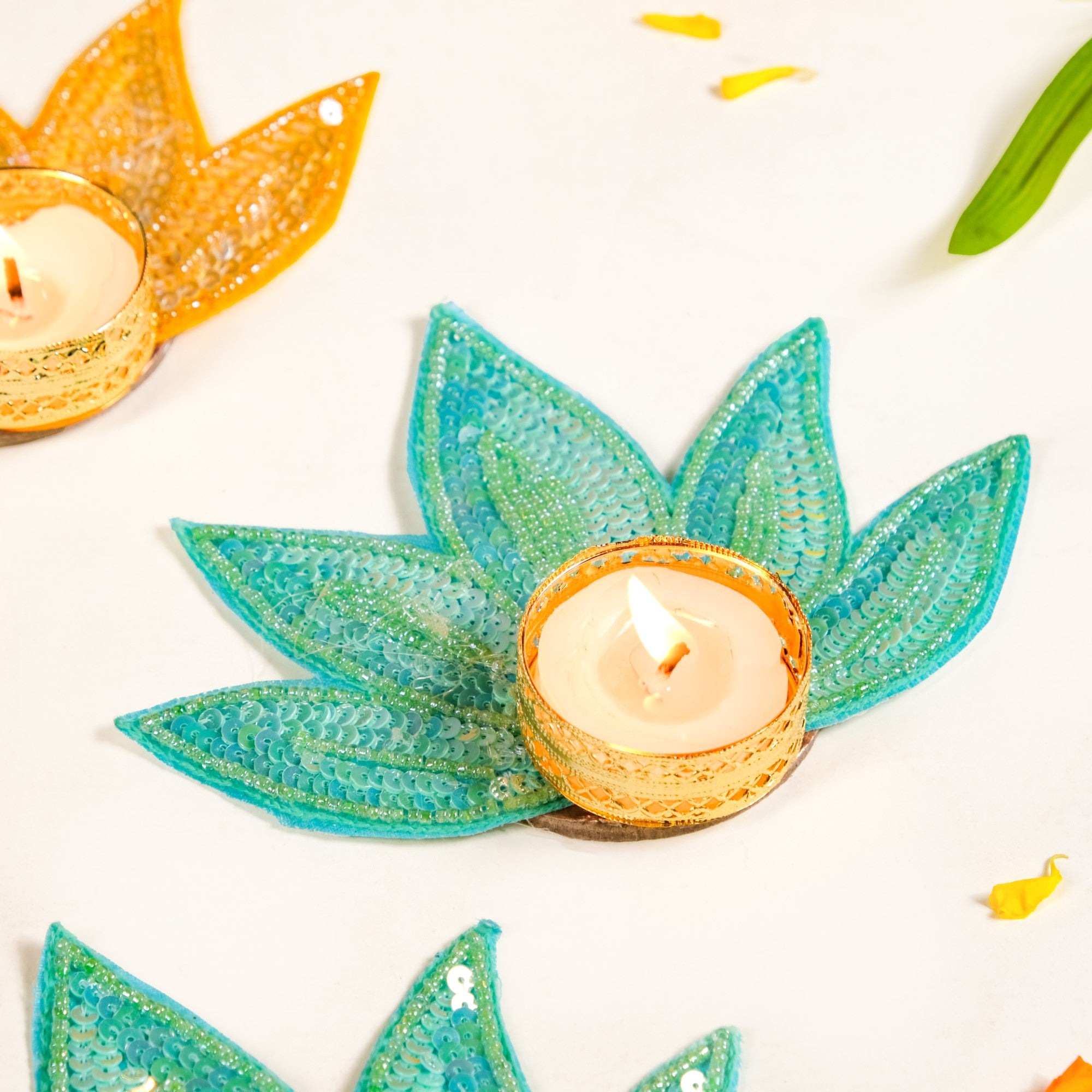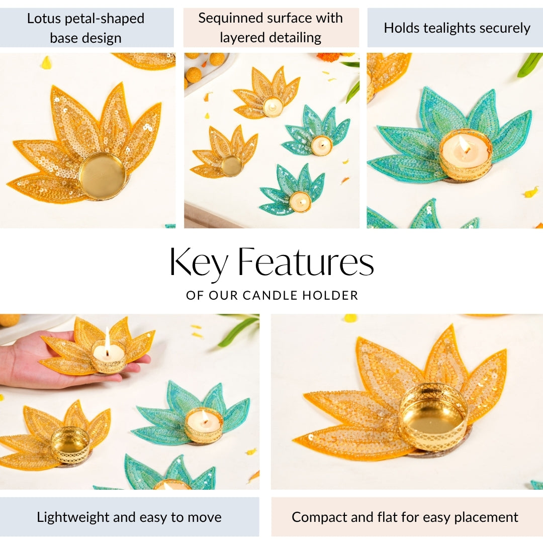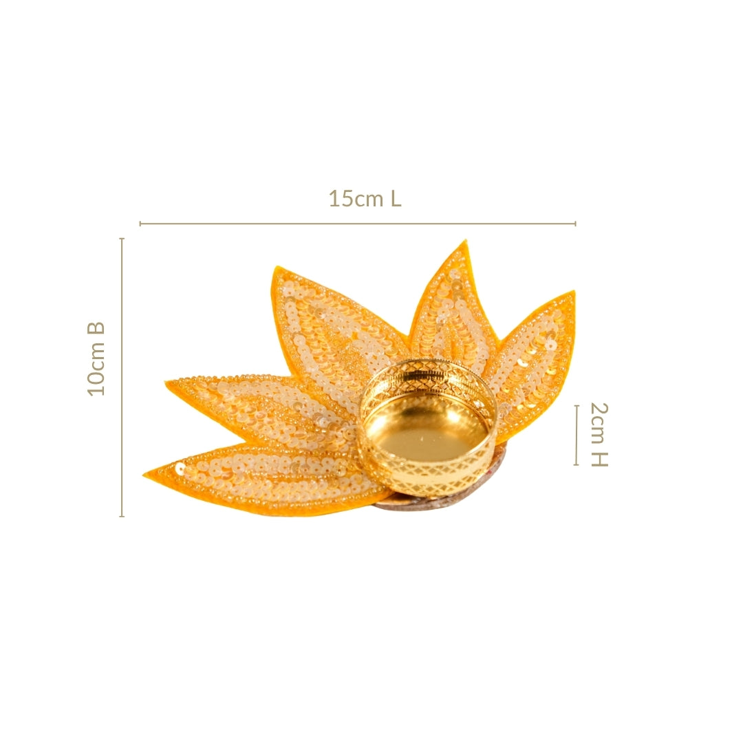 Design: This tea light holder set features a lotus petal-shaped base with layered sequin work that catches light from every angle. Available in two vibrant colours, yellow and green, each piece is designed with a round centre to securely hold a tea light. Glossy threadwork adds definition while a fabric base lends structure and durability. The compact size ensures easy placement on tabletops, shelves, or rangoli set-ups.