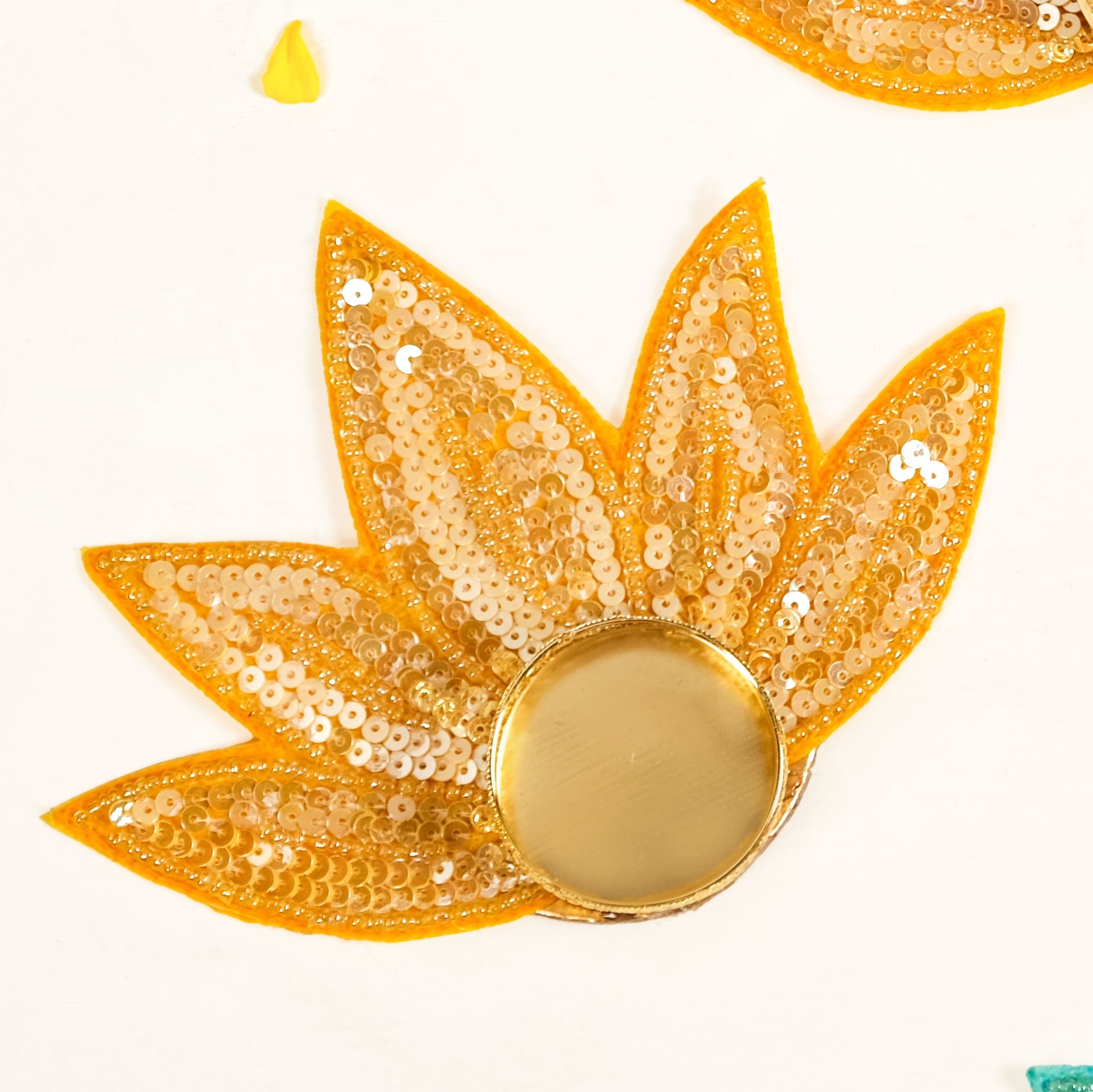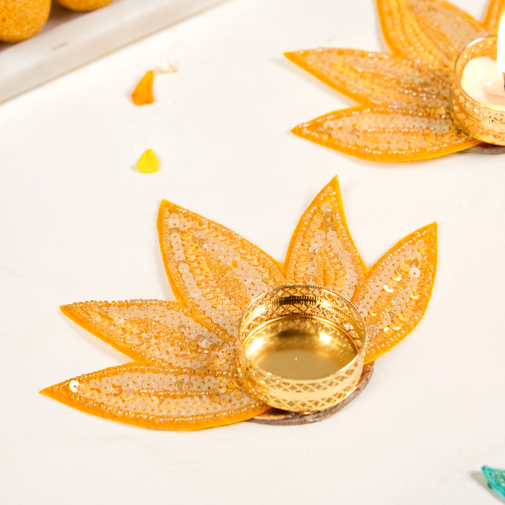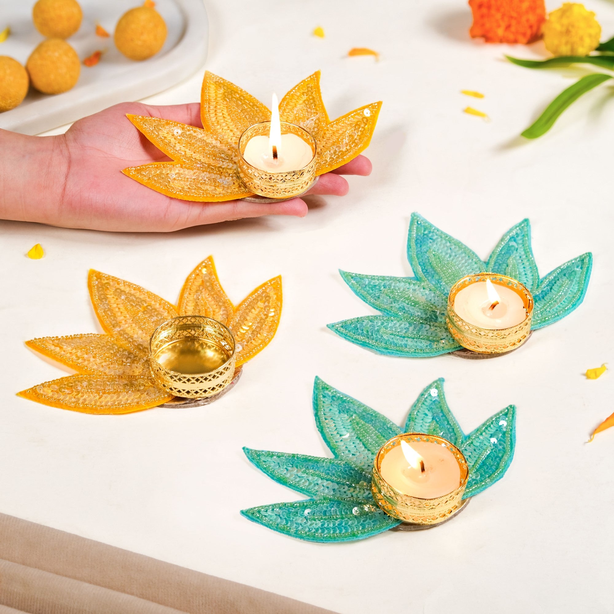 Design: This tea light holder set features a lotus petal-shaped base with layered sequin work that catches light from every angle. Available in two vibrant colours, yellow and green, each piece is designed with a round centre to securely hold a tea light. Glossy threadwork adds definition while a fabric base lends structure and durability. The compact size ensures easy placement on tabletops, shelves, or rangoli set-ups.