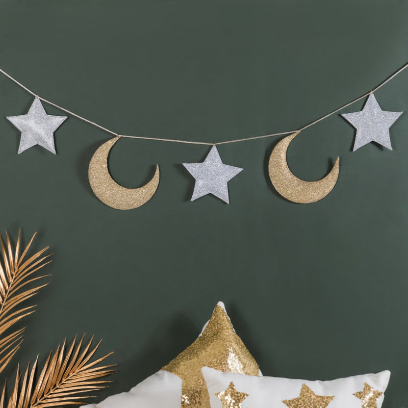 The stunning wall bunting featuring glittery silver stars and golden crescent moons is the perfect festive wall decor. The beautiful wall decoration will add a touch of celestial magic to any room or event. The bunting is made up of a series of alternating shimmering silver star and golden crescent moon. The metallic finish of the stars and moons catches the light, creating a dazzling effect that is sure to capture everyone's attention. This wall bunting decoration is perfect for adding a touch of glamour to the living room wall decor. The glittery stars and golden crescent moons are versatile enough to be used for a range of occasions, Eid celebrations, birthday parties or any themed soirees. The bunting features a sturdy satin string which is easy to hang. The lightweight fabric and glittery stars and moons are durable, ensuring that the bunting decoration can be used for several occasions.
