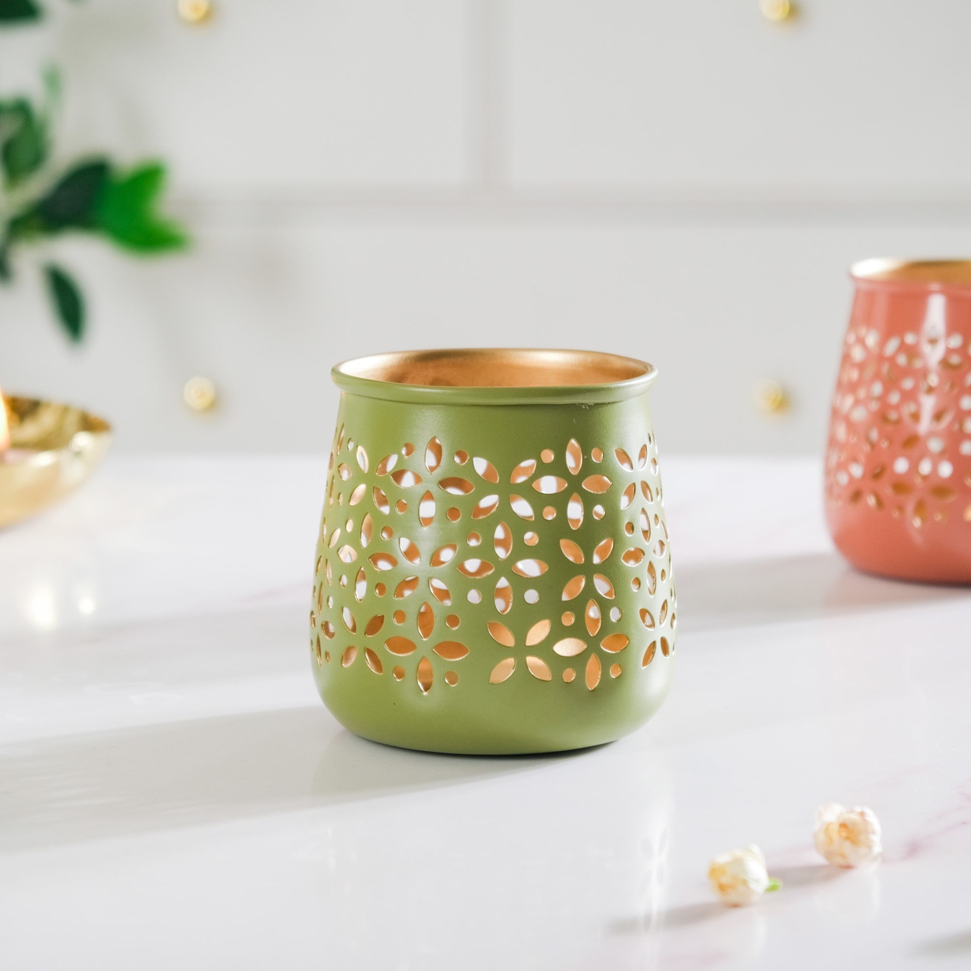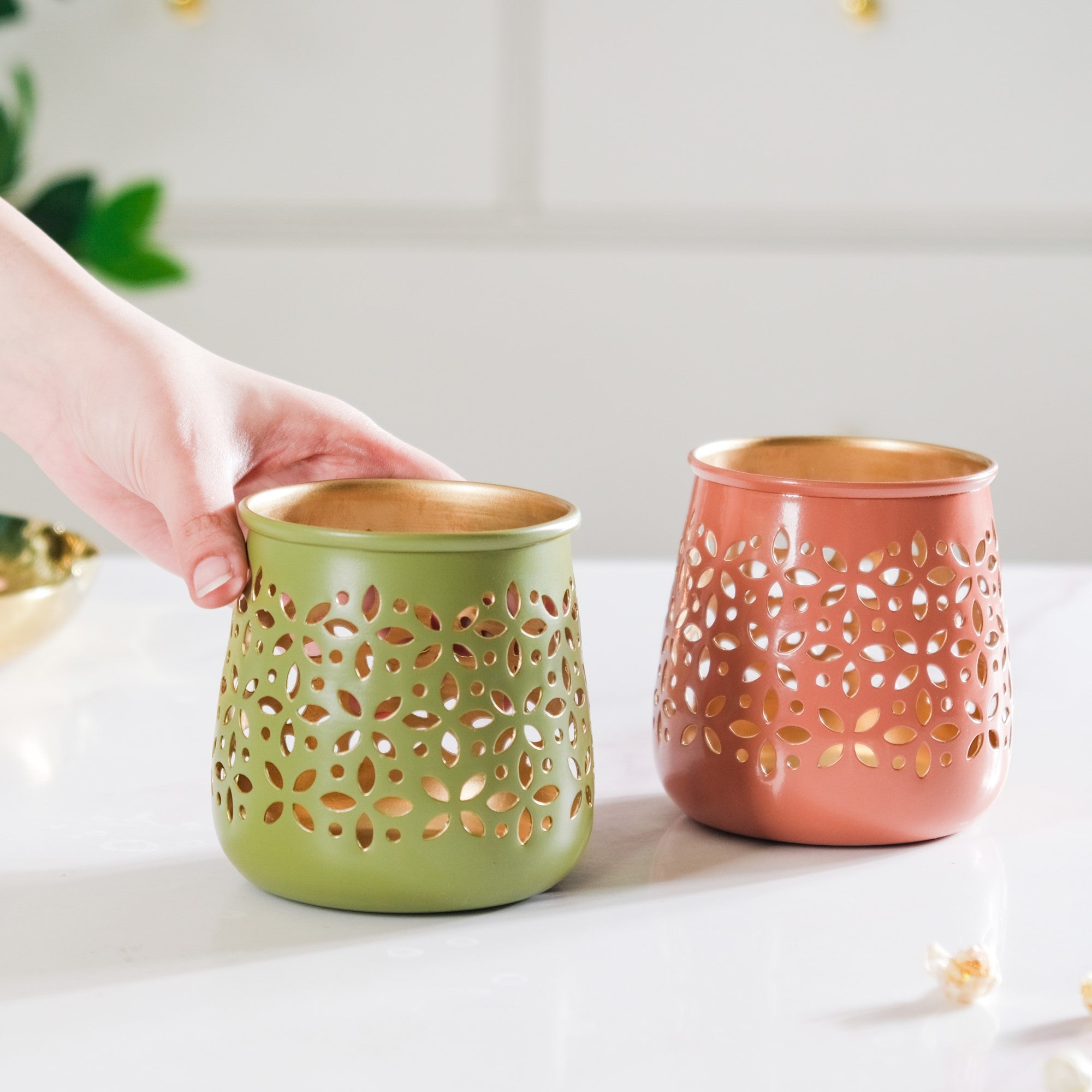 Create a mesmerizing atmosphere with our captivating set of 5 metal cut-work design tealight holders. Crafted with meticulous attention to detail, these holders showcase intricate cut-out patterns that come to life when illuminated by flickering tealights. With five meta candle holders included in the set, you have endless possibilities for arranging and decorating your space. Made from premium-quality metal, these tealight holders are not only visually stunning but also built to last. Whether for cozy evenings at home or special occasions, these tealight holders add an exquisite touch of sophistication and elegance to any setting.