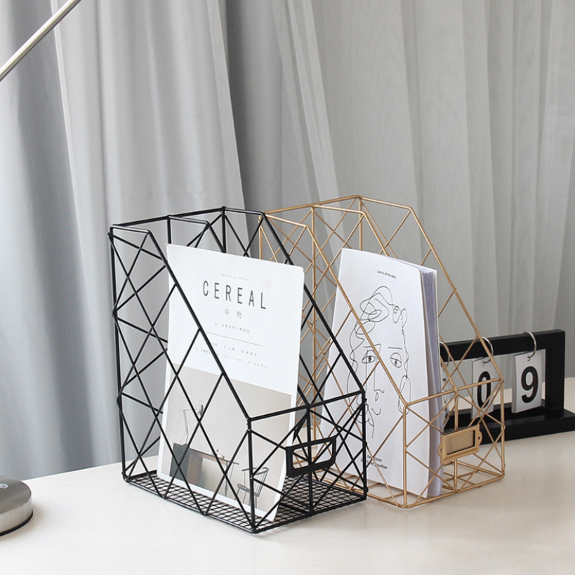 The large file rack is a double magazine holder made of gold metal wire in a triangular pattern. The organiser can be an addition to a home, study, living space or office to neatly sort magazines, newspapers, letters and more.