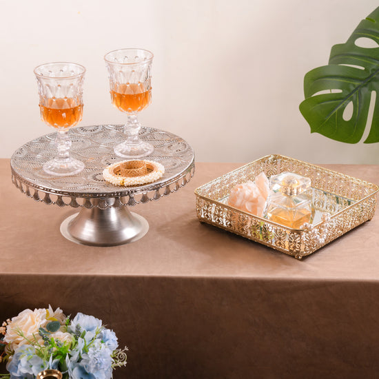 Elevate your dessert presentation with our exquisite metal cake stand. Meticulously crafted with premium quality metal, this stand boasts unrivalled durability and rust resistance. The intricate filigree metalwork showcases expert craftsmanship, exuding timeless elegance. Adorned with a high-sheen silver finish, it radiates sophistication. The sturdy design ensures stability, while the detachable base offers versatility in use and storage. Whether for lavish gatherings or intimate celebrations, the cake stand iis an deal choice for showcasing and serving desserts with unmatched flair.