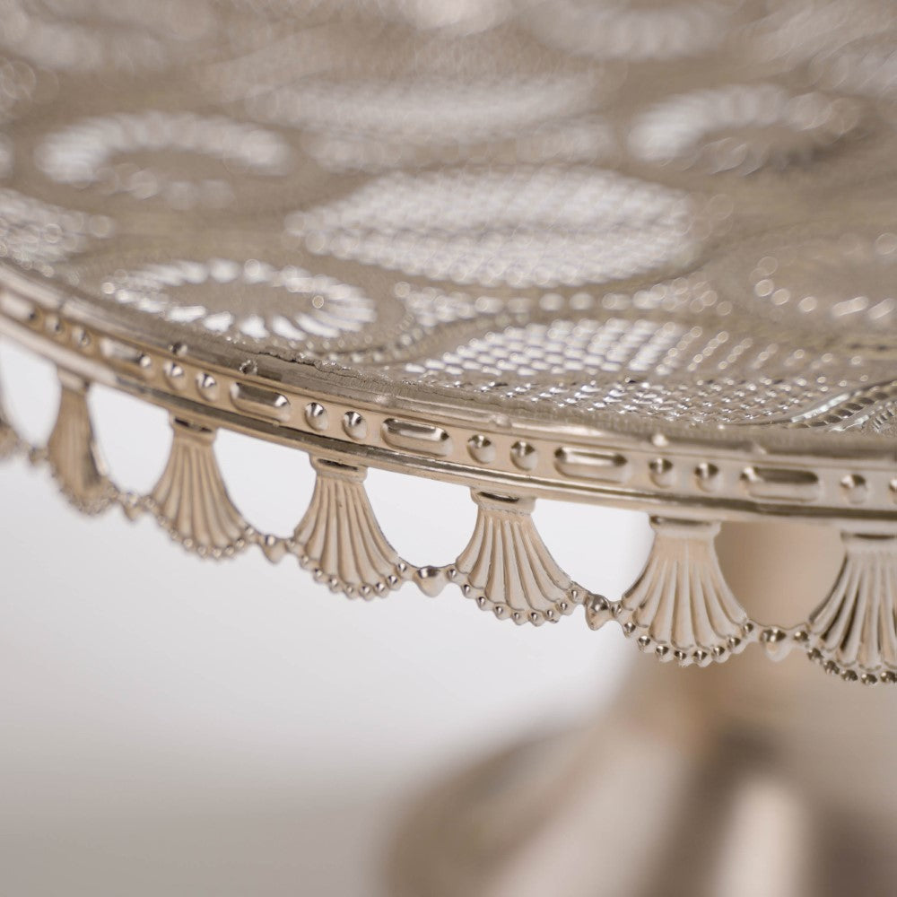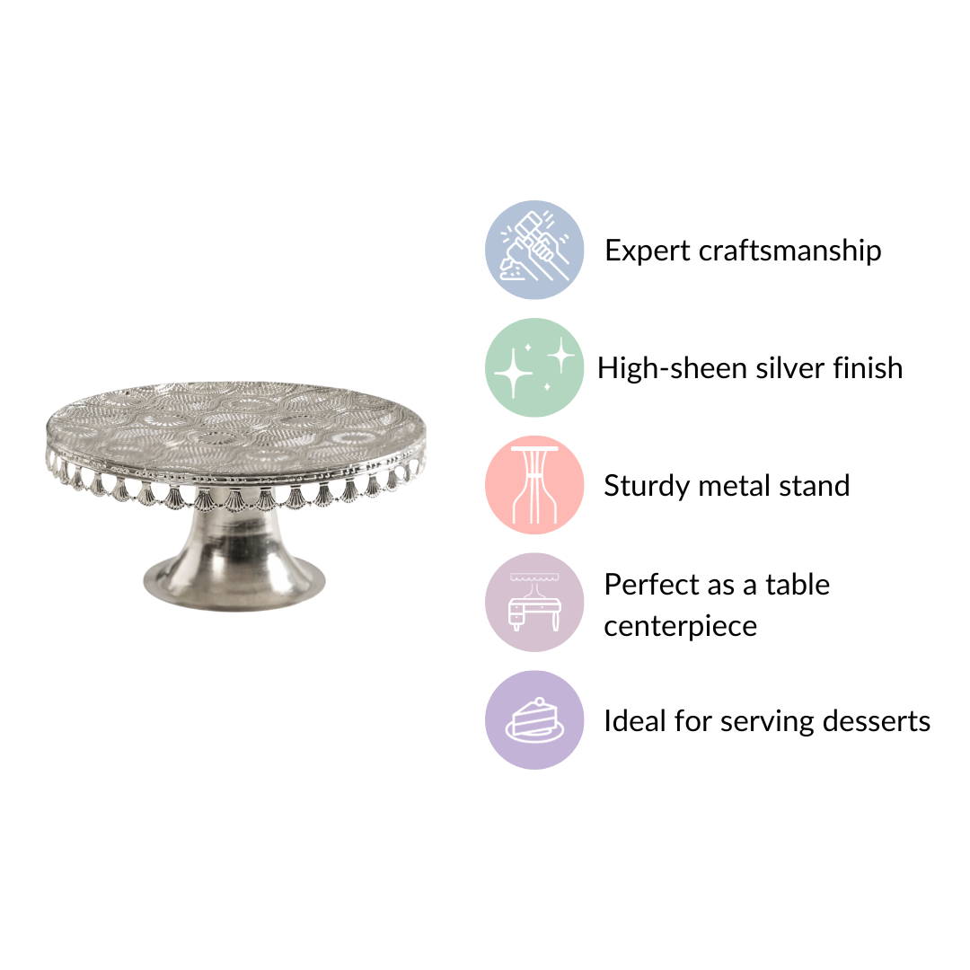 Elevate your dessert presentation with our exquisite metal cake stand. Meticulously crafted with premium quality metal, this stand boasts unrivalled durability and rust resistance. The intricate filigree metalwork showcases expert craftsmanship, exuding timeless elegance. Adorned with a high-sheen silver finish, it radiates sophistication. The sturdy design ensures stability, while the detachable base offers versatility in use and storage. Whether for lavish gatherings or intimate celebrations, the cake stand iis an deal choice for showcasing and serving desserts with unmatched flair.