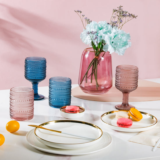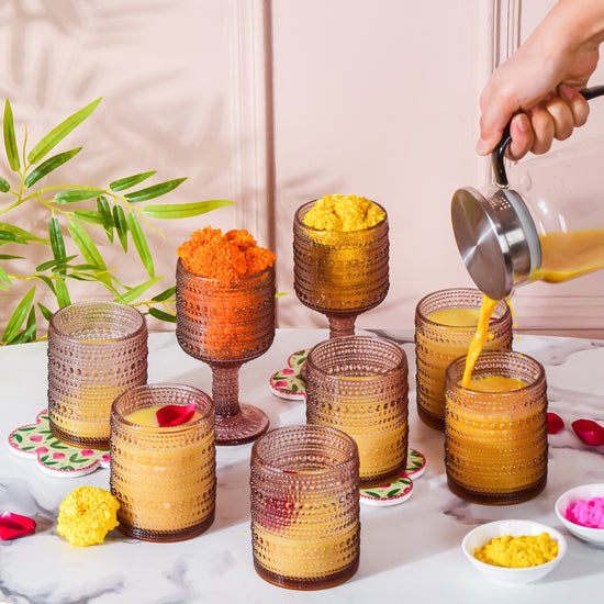 If you are tired of using plain ordinary water glasses, the unique and stunning designs of our glassware pieces can be an ideal alternative to add an elegant charm to your table decor for a fine dining experience. The expertly handcrafted designs of our stemmed drinking glasses offer a superior grip to avoid slips and spills while adding to the aesthetic appeal of the drinkware pieces. Since our drinking glasses are multipurpose, you can use them to serve water, cocktails, soft drinks, juices, and other refreshments to your guests.