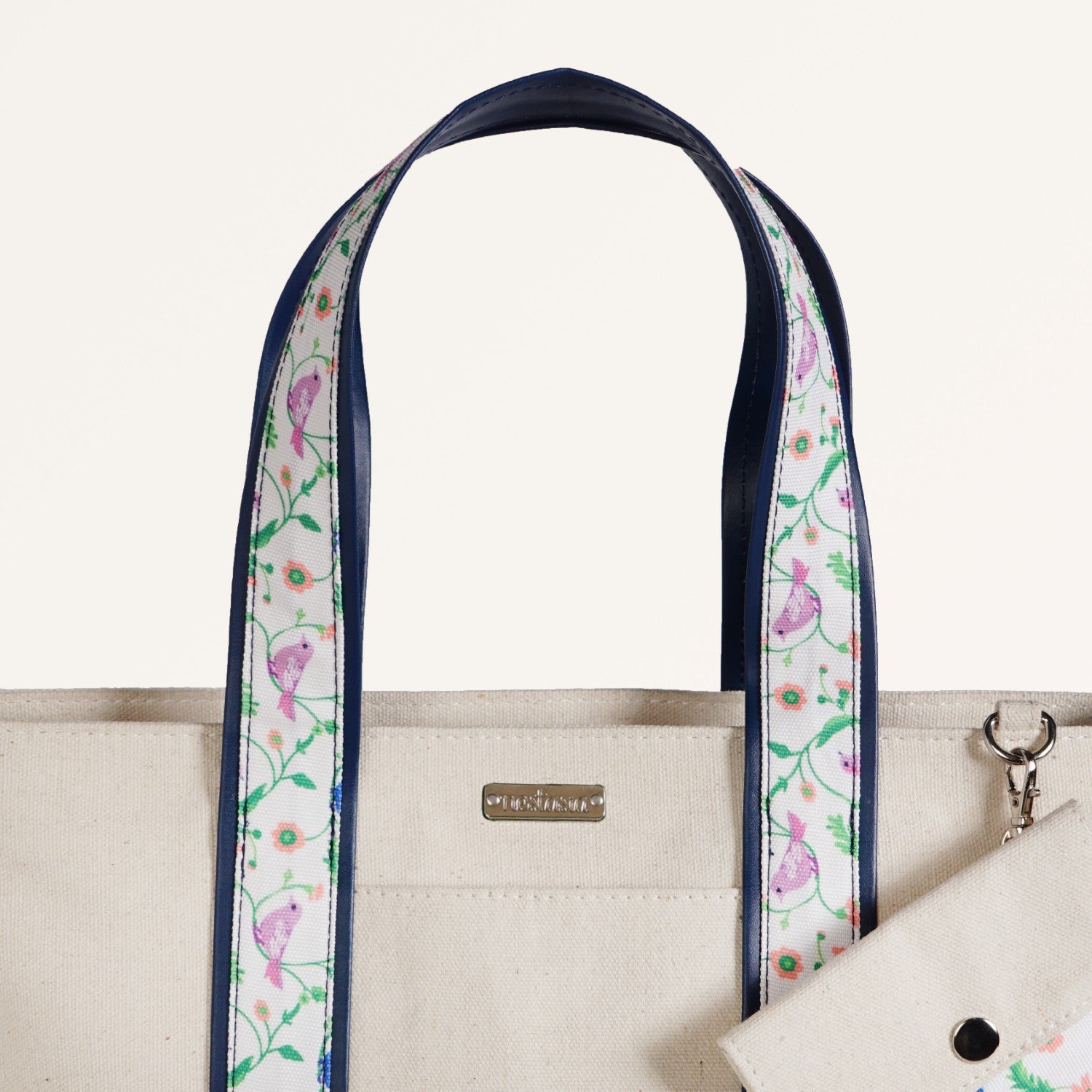 Design: This compact handbag features an off-white cotton canvas body with a dark blue vegan leather base. Dual short top handles include colourful floral and bird print. The structured silhouette stands upright. A matching coin pouch attaches via a metal ring for the coordinated storage of small daily essentials.