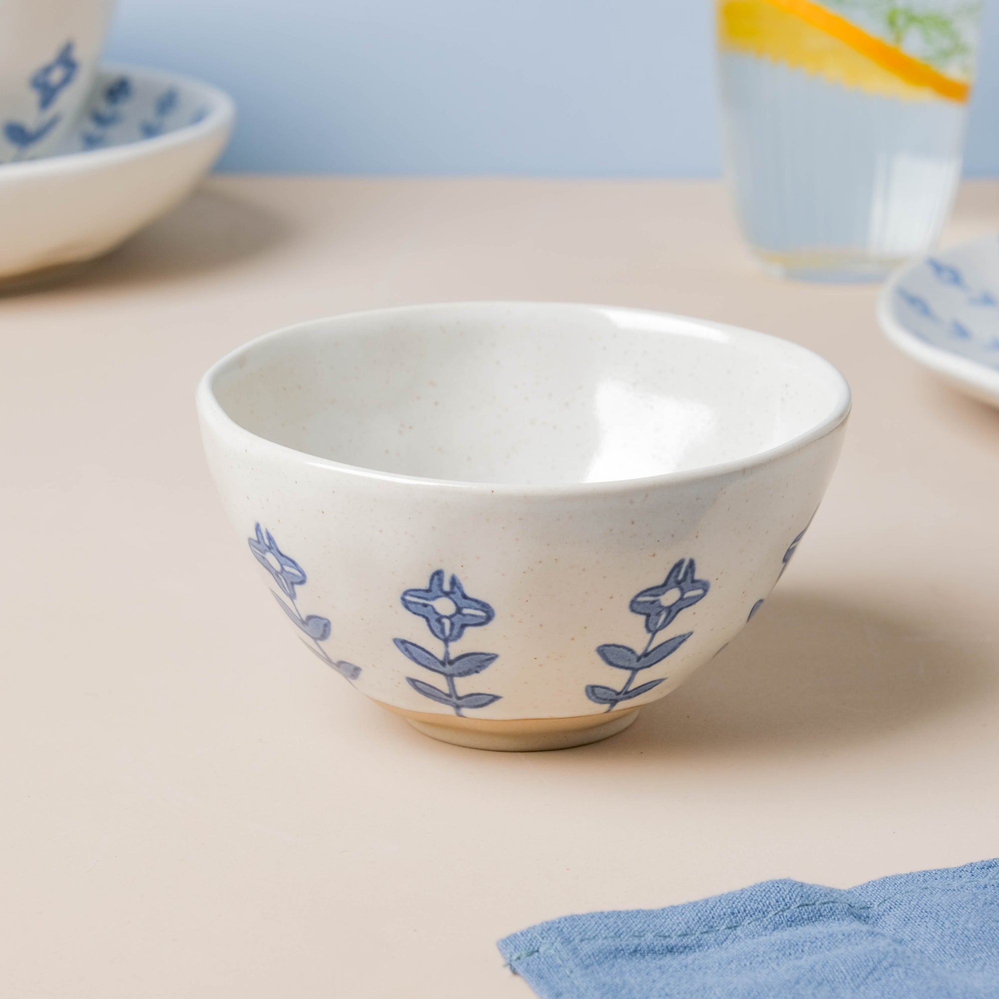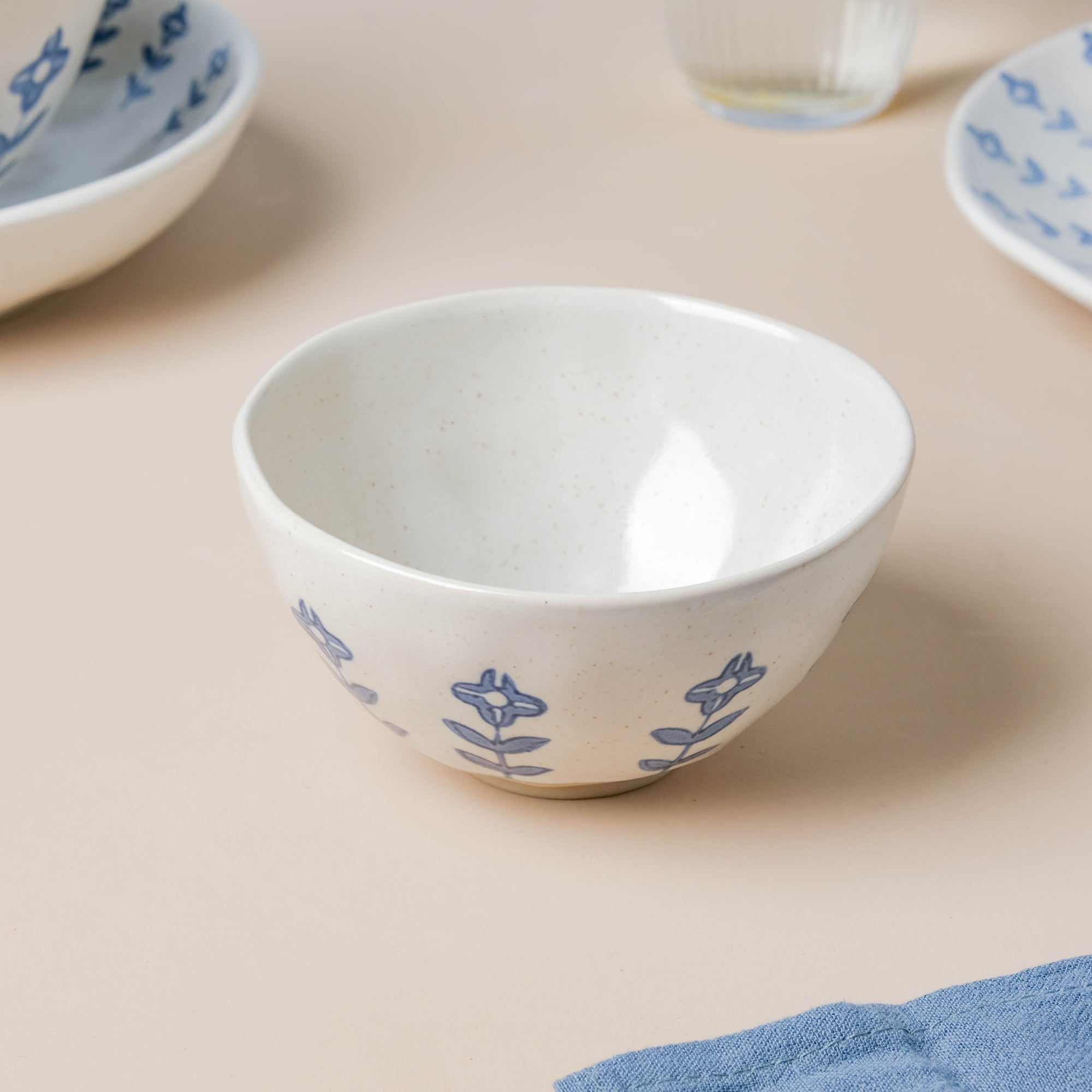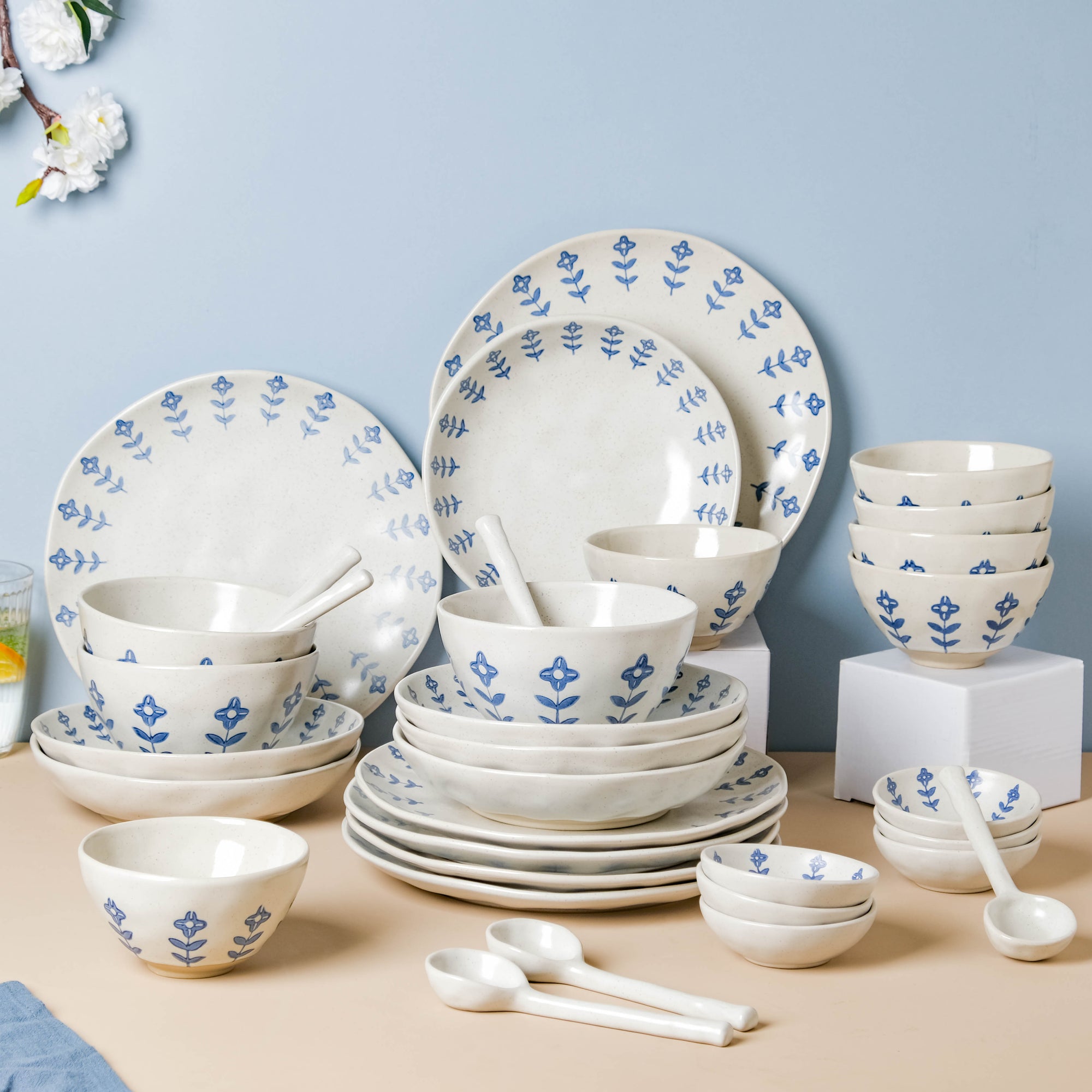 Our Flora collection of crockery in blue and white features a ring of floral pattern exuding minimalistic beauty in its modern, sophisticated look. The Flora tableware set is made of the finest ceramic ware, with a bright white finish and subtle floral designs that allow it to go well with informal lunch setups as well as celebratory get-togethers with ease. Our Flora collection, which includes 6 dinner plates, 6 appetizer plates, 6 dip dishes, 6 soup snack bowls, 6 soup spoons, and 3 serving bowls, is a collection that will help you prepare a fashionable and classy table for any occasion. The set is bound to make the loveliest addition to any pantry or tablescape. The calming hues of the collection make them apt to incorporate floral table mats in striking hues into the setup.