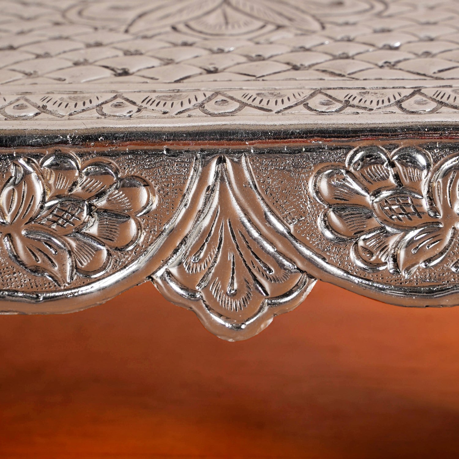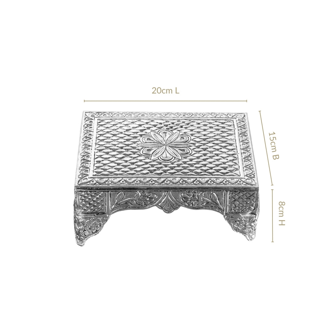 Design: This pure brass with silver polish puja chowki is crafted in a circular form that highlights traditional Indian artistry with skilled craftsmanship. The embossed floral carvings on the top are framed by engraved borders with patterned detailing. Its smooth, polished finish creates a subtle shine and the medium weight offers durability. Compact in size, the chowki easily fits into any altar or puja space.