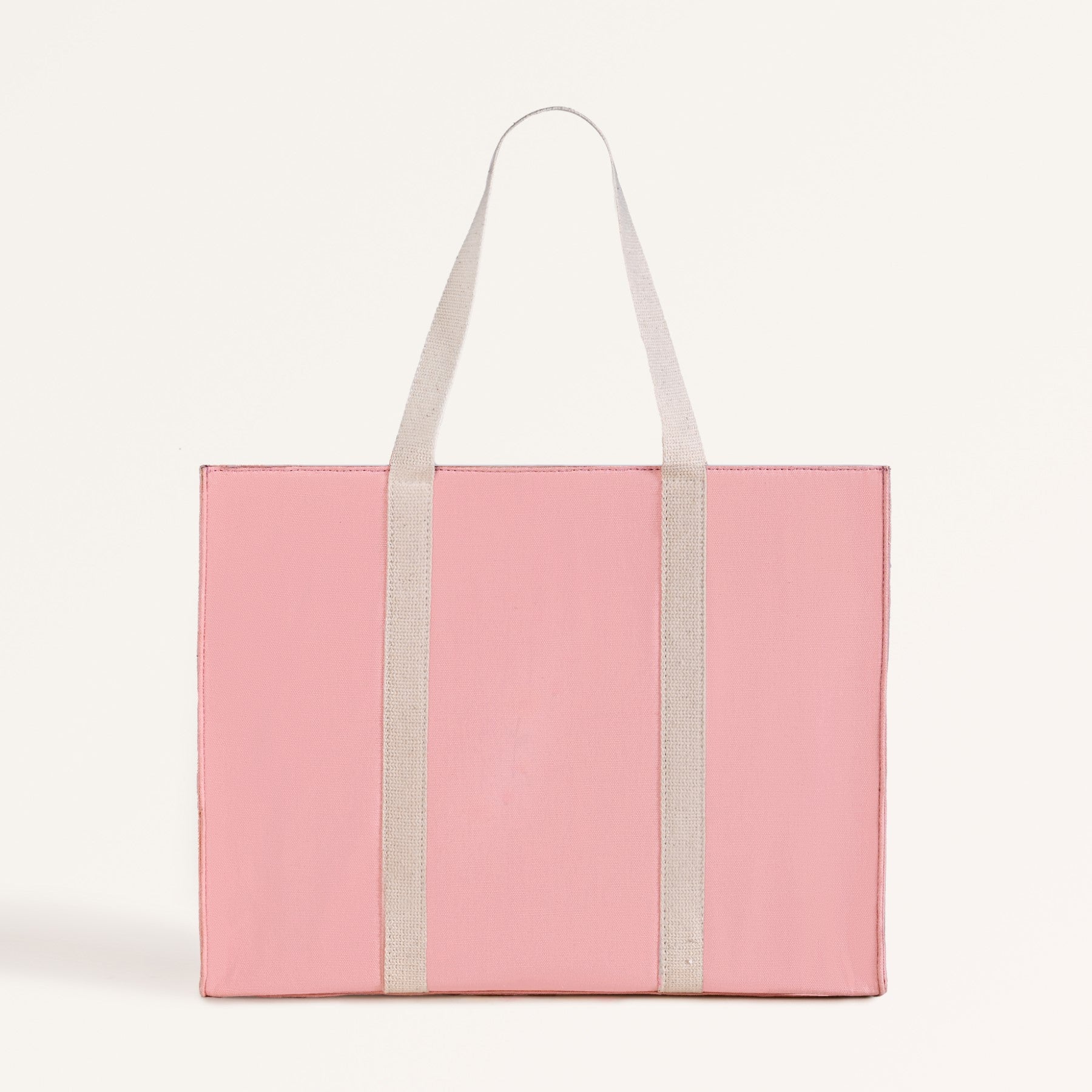 Design: This tote bag is made from durable canvas material with a crisp, structured body. The blush pink exterior is paired with a central watercolour like floral pattern for visual contrast. Neutral handles, a rectangular, spacious shape, reinforced flat base, neat stitch lines, and a subtle metallic logo define its clean finish.