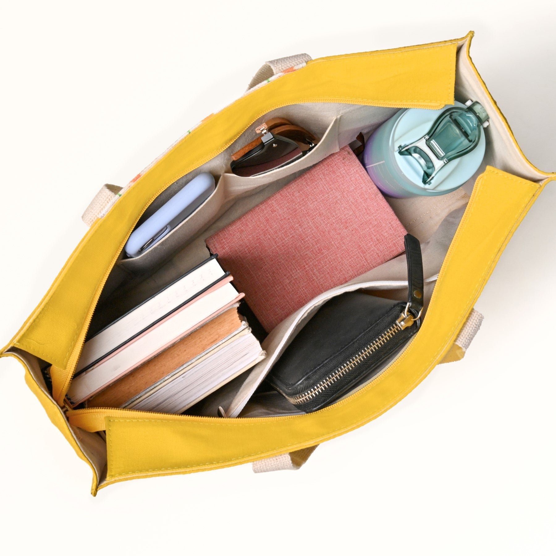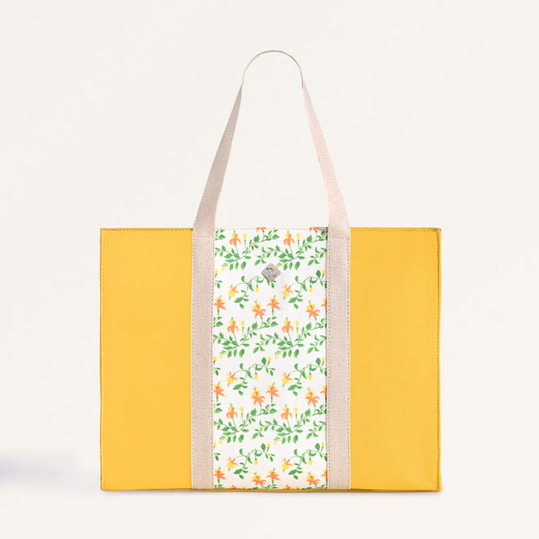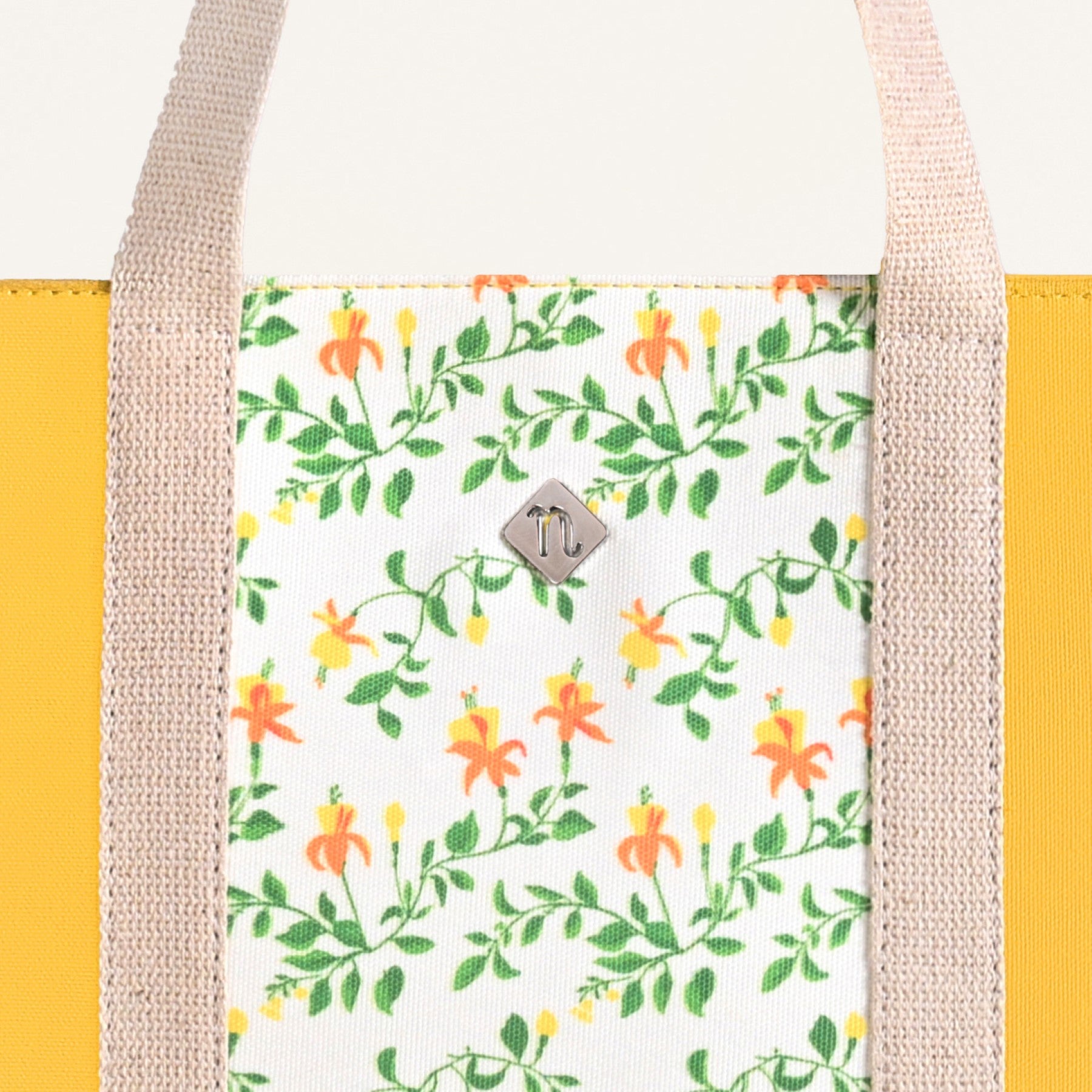 Design: This stylish tote is crafted from a durable outer canvas material in bright yellow. The center provides an eye-catching contrast with its light floral vine pattern, accented by small orange and white flowers. Two sturdy, neutral beige shoulder handles are securely attached. The bag boasts a spacious silhouette with a secured zipper line.