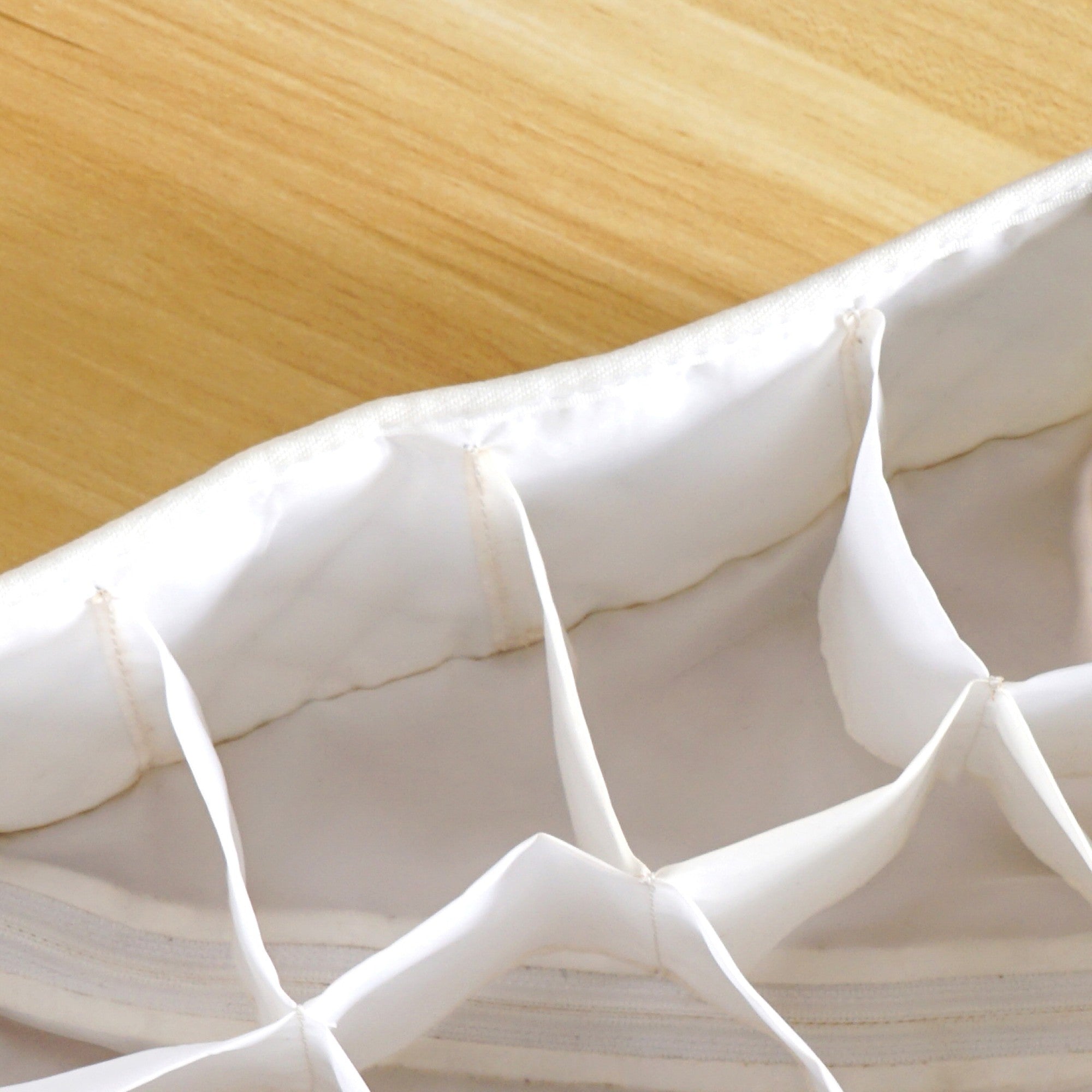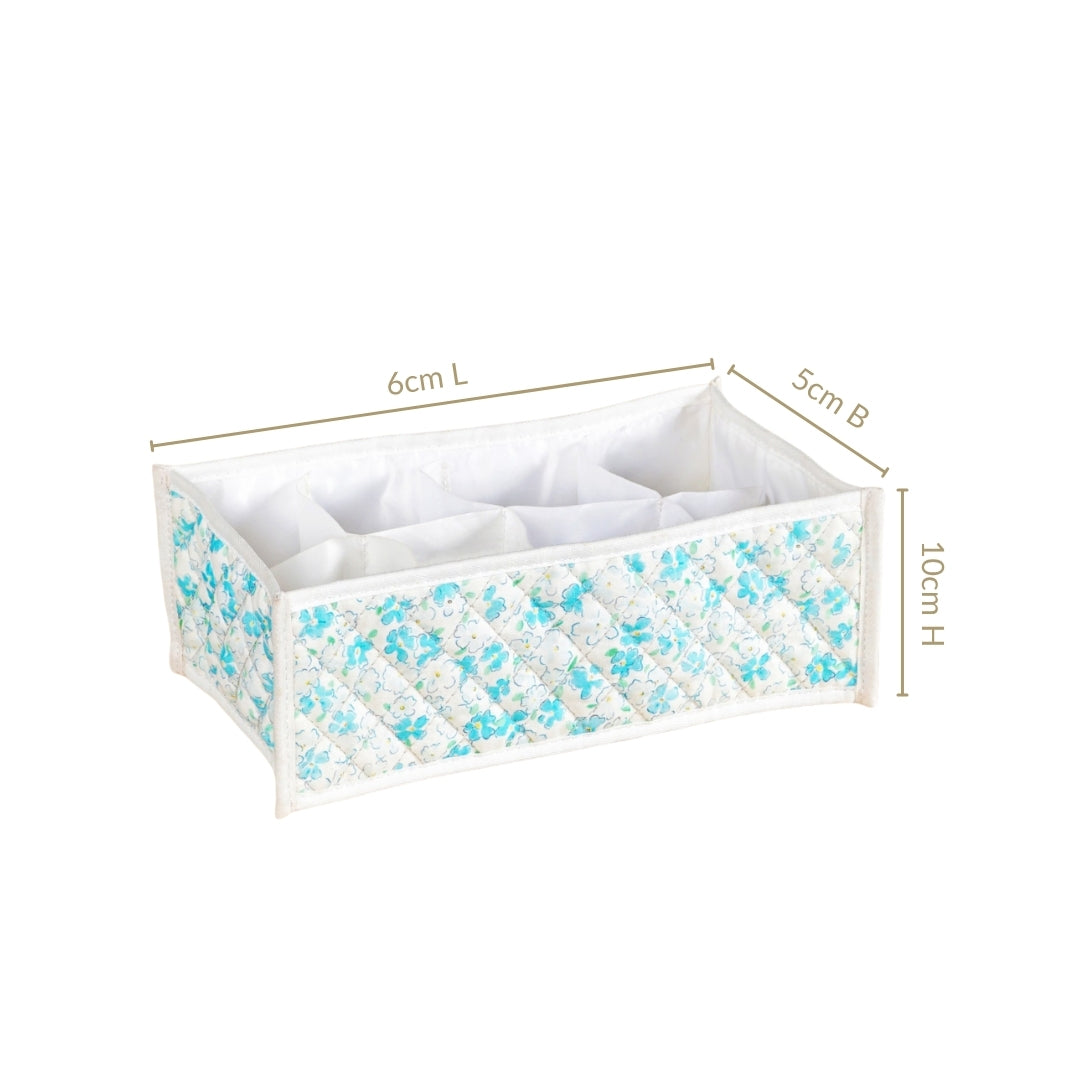 Design: This charming wardrobe organiser set is crafted with a quilted polyester fabric. It features a delicate blue floral pattern with small green leaves, all set against a soft white background. A closer look reveals a subtle hint of yellow at the centre of each blue flower. The interior is designed for maximum efficiency, featuring a seamless white base and a unique structure comprising eight individual dividers. These dividers create eight separate compartments, ensuring each item has its own dedicated space. The practical design is completed with a hidden zipper on the bottom, allowing the entire structure to be easily folded flat for compact storage.