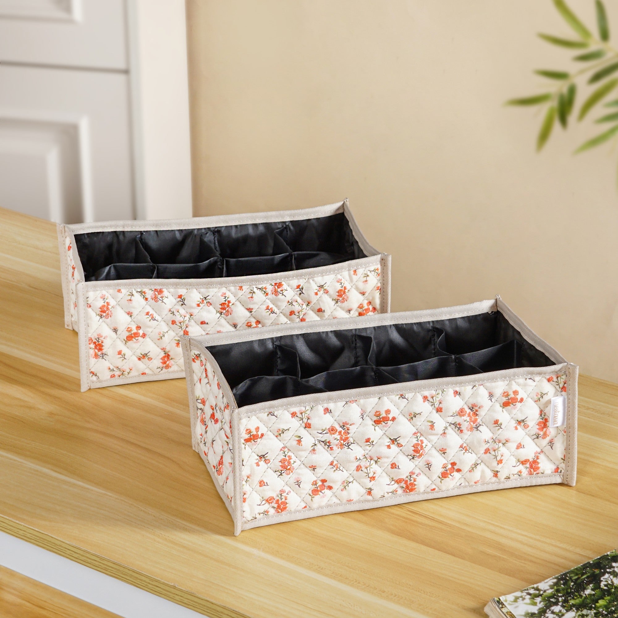 Design: Crafted from a quilted polyester fabric, this charming wardrobe organiser set showcases a delicate pattern of orange and pink flowers, highlighted by small green stems and leaves against a beige background. The interior features a sleek black base and eight individual dividers, a design that makes it one of the most efficient closet organisers you'll own. A hidden zipper on the bottom allows the entire unit to fold flat, transforming it into a compact and excellent travel organiser.