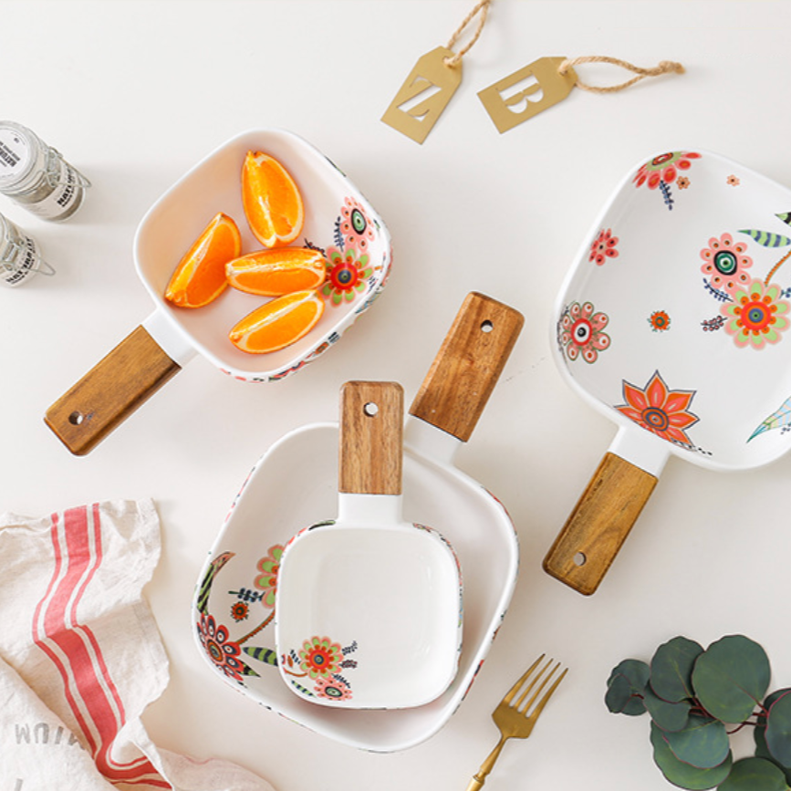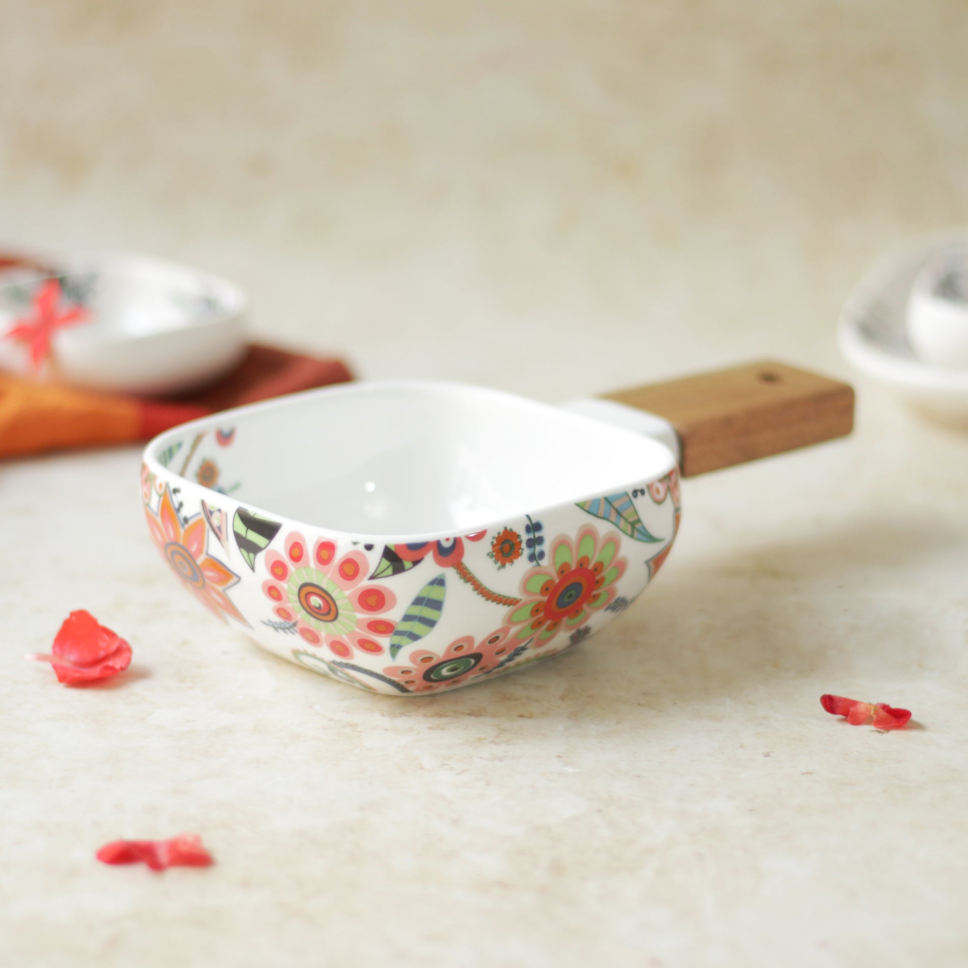 A square bowl with handle, this ceramic bowl is unique with a floral pattern on the outside as well as motifs on the inside giving it a vibrant aesthetic. The bowl has a wooden handle that helps in serving food and passing the bowl across the room to guests. The bowl can be used as a snack bowl or serving bowl