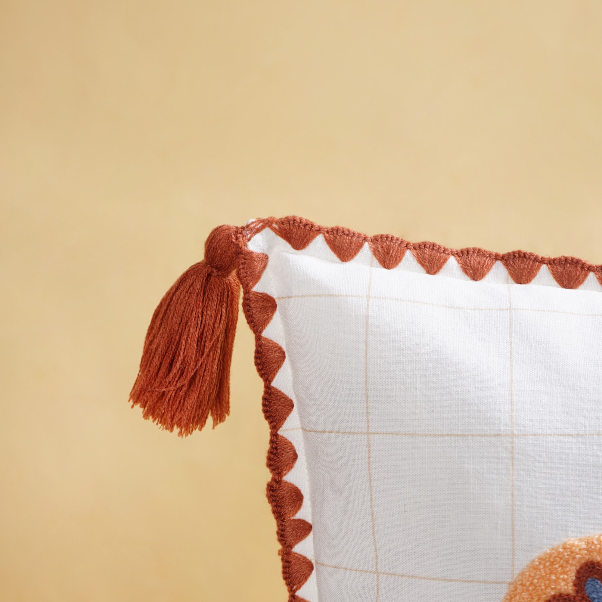 Design: Made from soft 100% cotton, this cushion cover offers a gentle and comfortable feel. The square silhouette makes it easy to place on beds, chairs, or cosy reading corners. At the centre, an intricately embroidered butterfly filled with tiny floral motifs adds a magical focal point. Dusty pink tassels trim each corner, paired with a durable embroidered border for a neat finish. Light cream tones and colourful floral accents sit over a subtle grid-patterned background. The cover features high-quality textured embroidery and is fully washable for everyday convenience. A slight post-wash shrink may occur, creating an extra snug and cosy fit. A light press with an iron will bring the cotton back to its original shape.