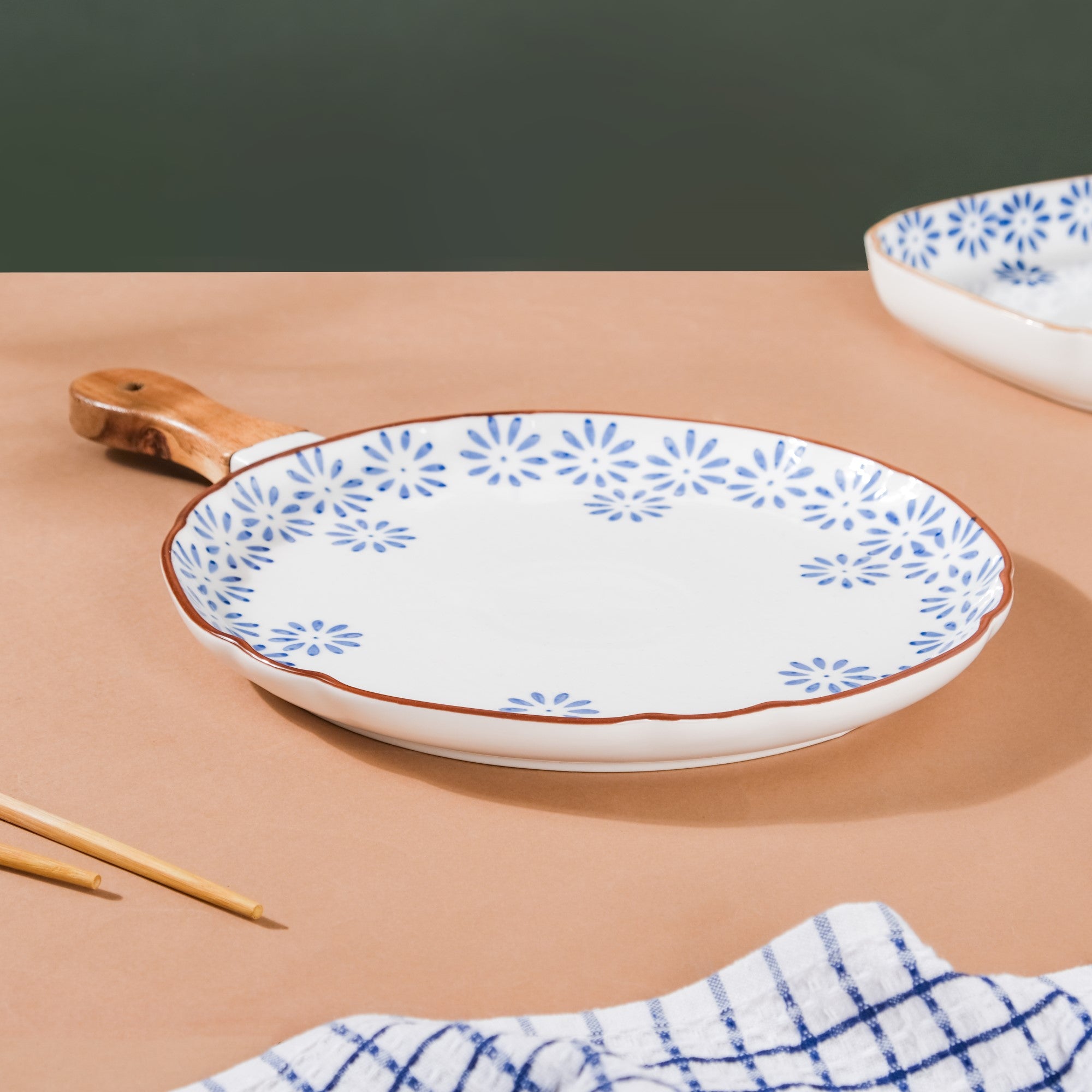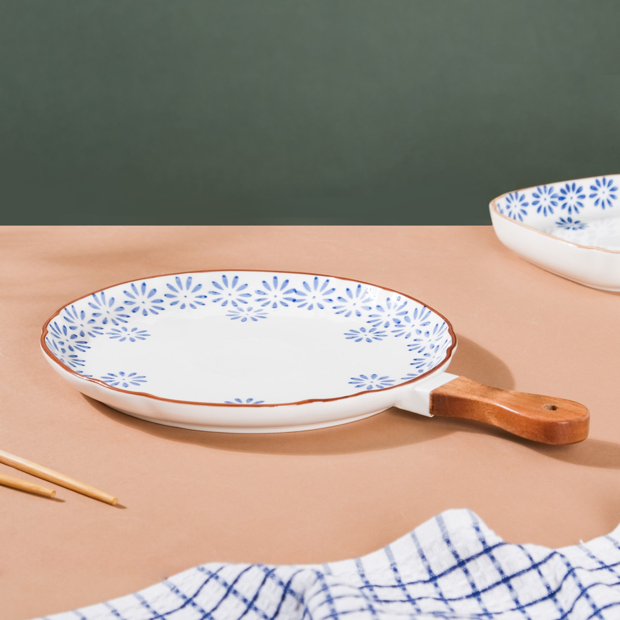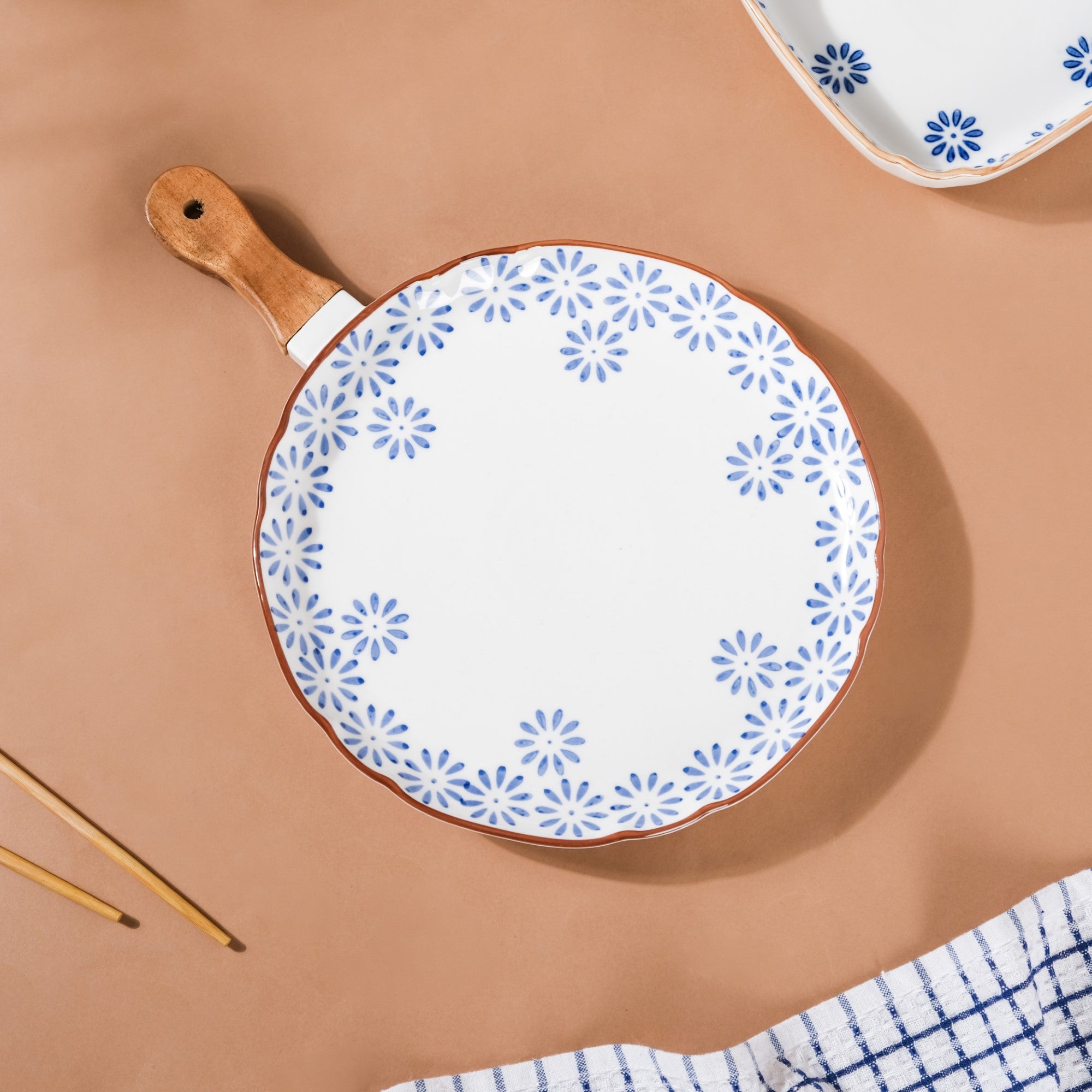 A round shape dish that comes with variant blue color flower motifs and a golden rim is made in ceramic and wood for the handle. The dishes have a different look altogether that can make a table serving pop with bright flower hues. One can use the dish for serving spaghetti, lasagna, baked rice, or grill kebabs, and vegies or toss up a salad in the circular dish with handle.