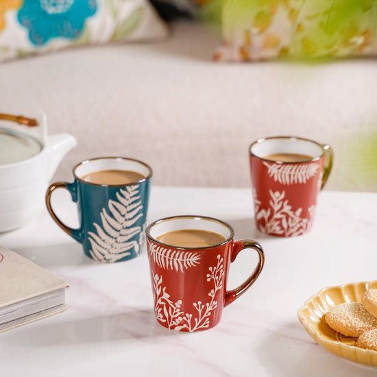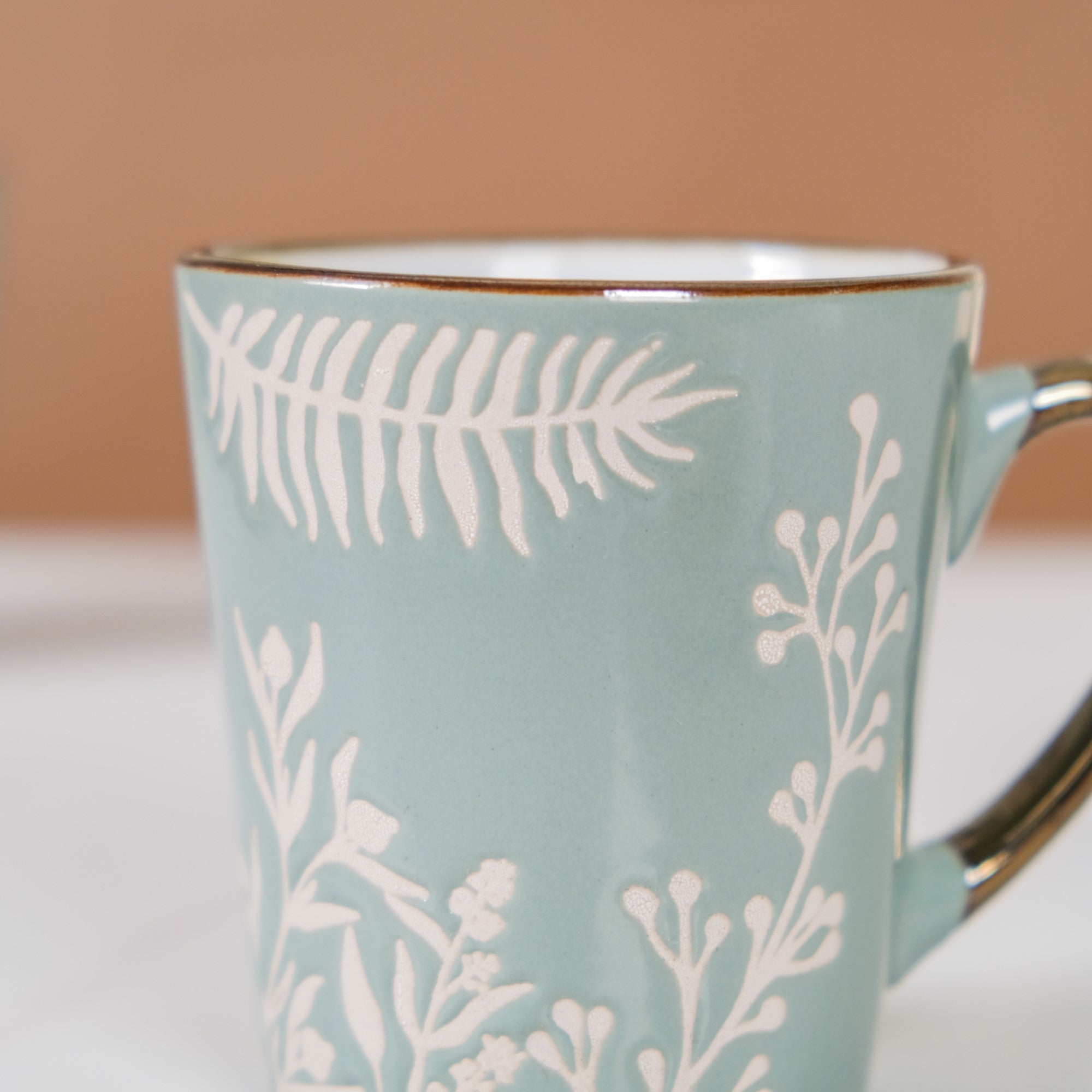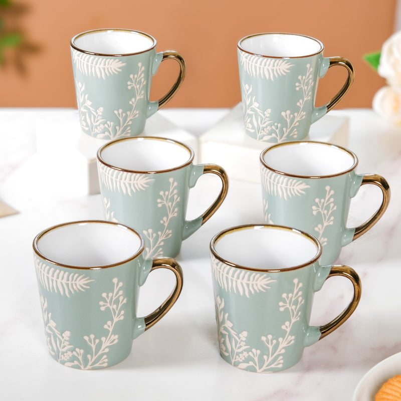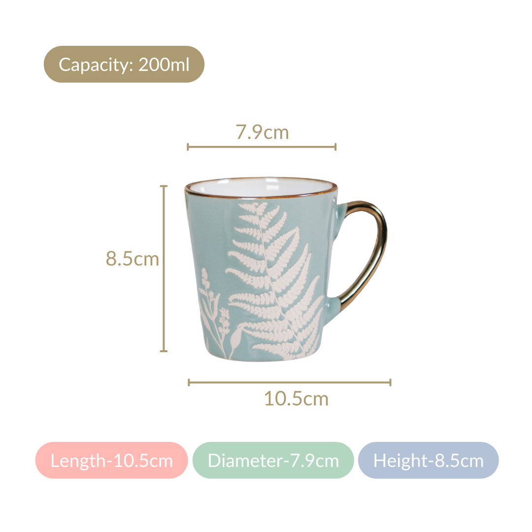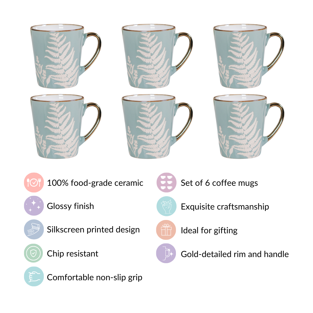Introducing the leaves and flowers coffee mug set of 6 in a captivating mint green colour. These exquisite coffee mugs showcase intricate silk-screen printed patterns featuring delicate leaves and flowers, transforming your daily coffee ritual into an artistic experience. Meticulously crafted from top-tier ceramic materials, these mugs seamlessly blend aesthetics with durability. Their opulent gold metallic rim and handle exude a sense of opulence, making them the perfect choice for passionate coffee aficionados. The ergonomic non-slip grip ensures each sip is savoured in style and comfort.
