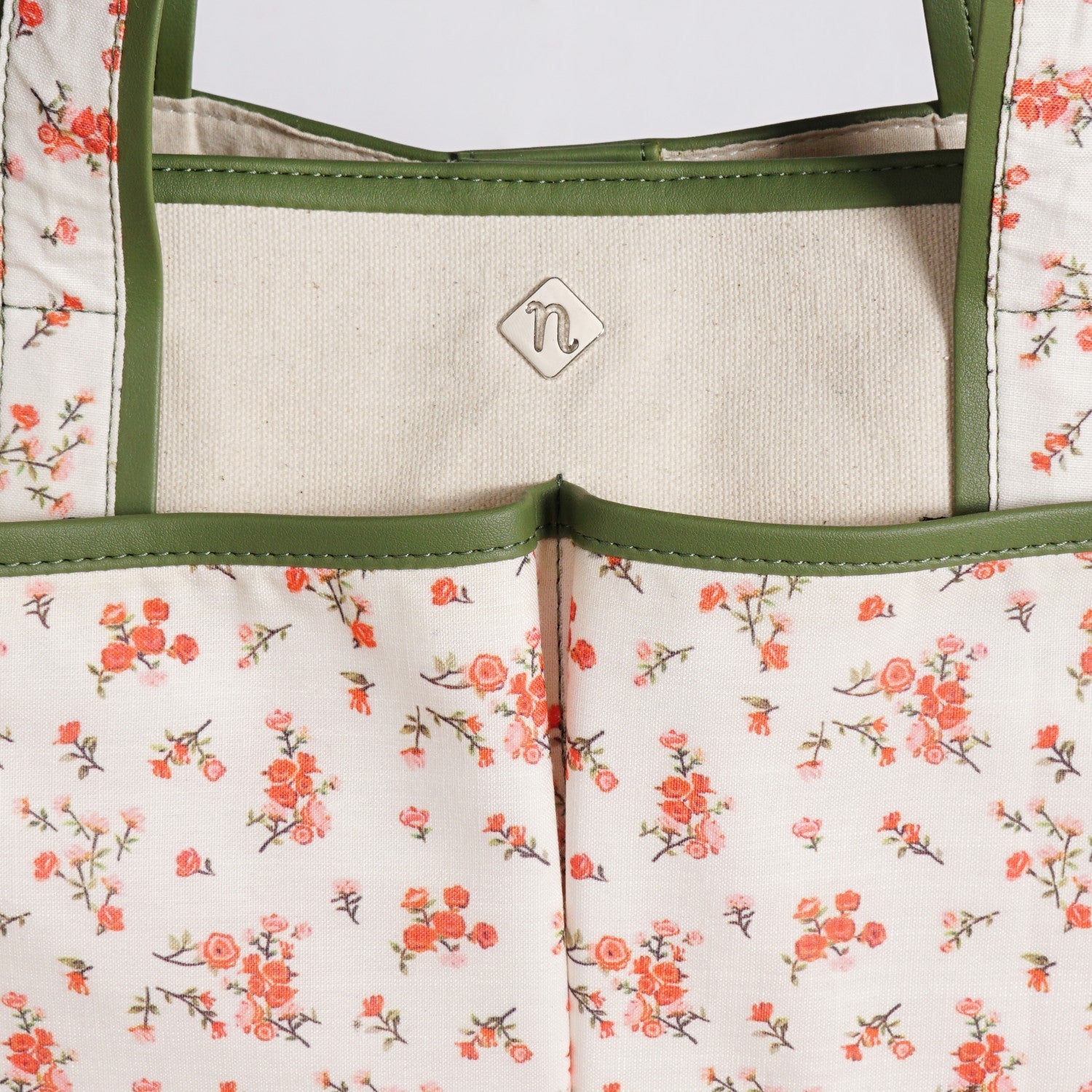 Design: Made from thick, durable canvas, this tote bag features floral front slip pockets for an easy everyday look. Solid green borders add structure, while sturdy handles ensure comfortable carrying. The rectangular shape stays upright, finished with firm stitching, a secure magnetic snap closure, and side pockets for extra utility.