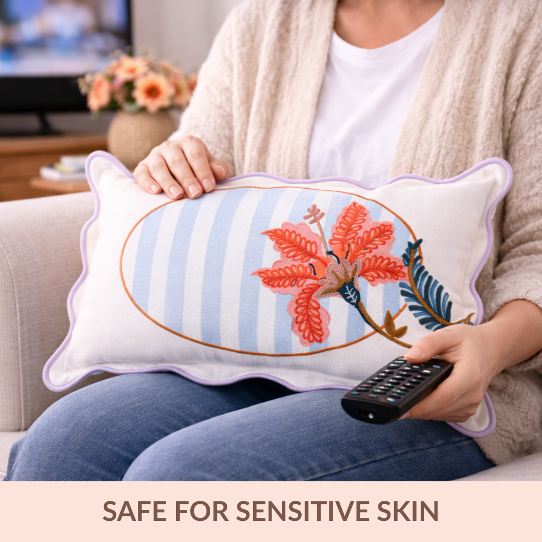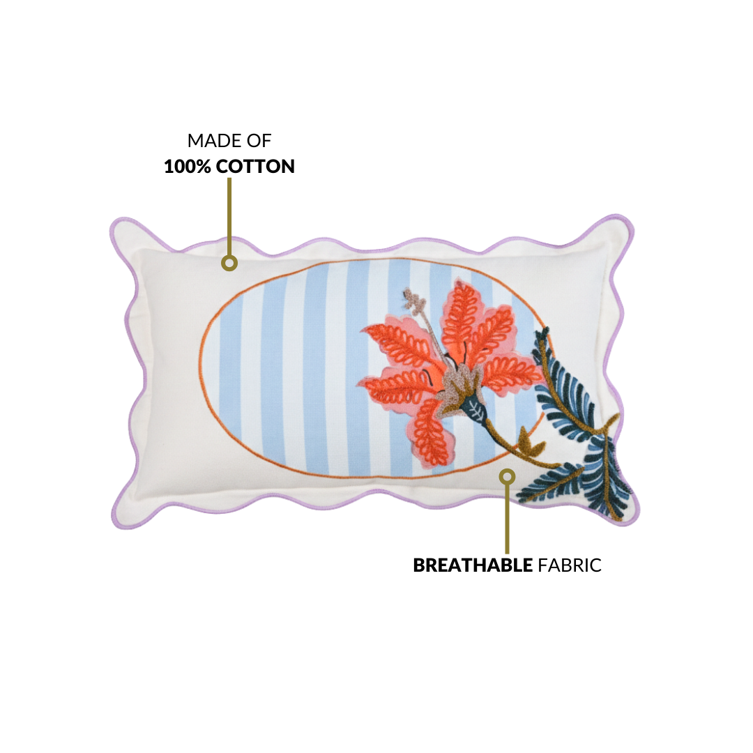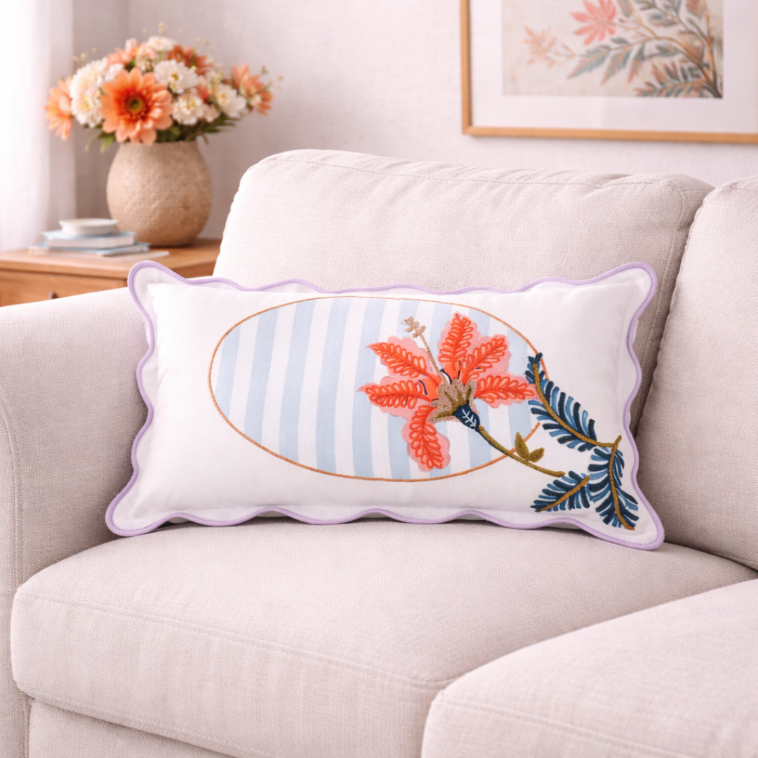 Benefits: Pure cotton offers breathable comfort that feels gentle on the skin and works well across seasons. The rectangular shape sits neatly on sofas, beds, and benches. Its cheerful embroidery and soft colour palette brighten seating areas, add visual contrast, and support easy maintenance with durable natural fibre comfort.