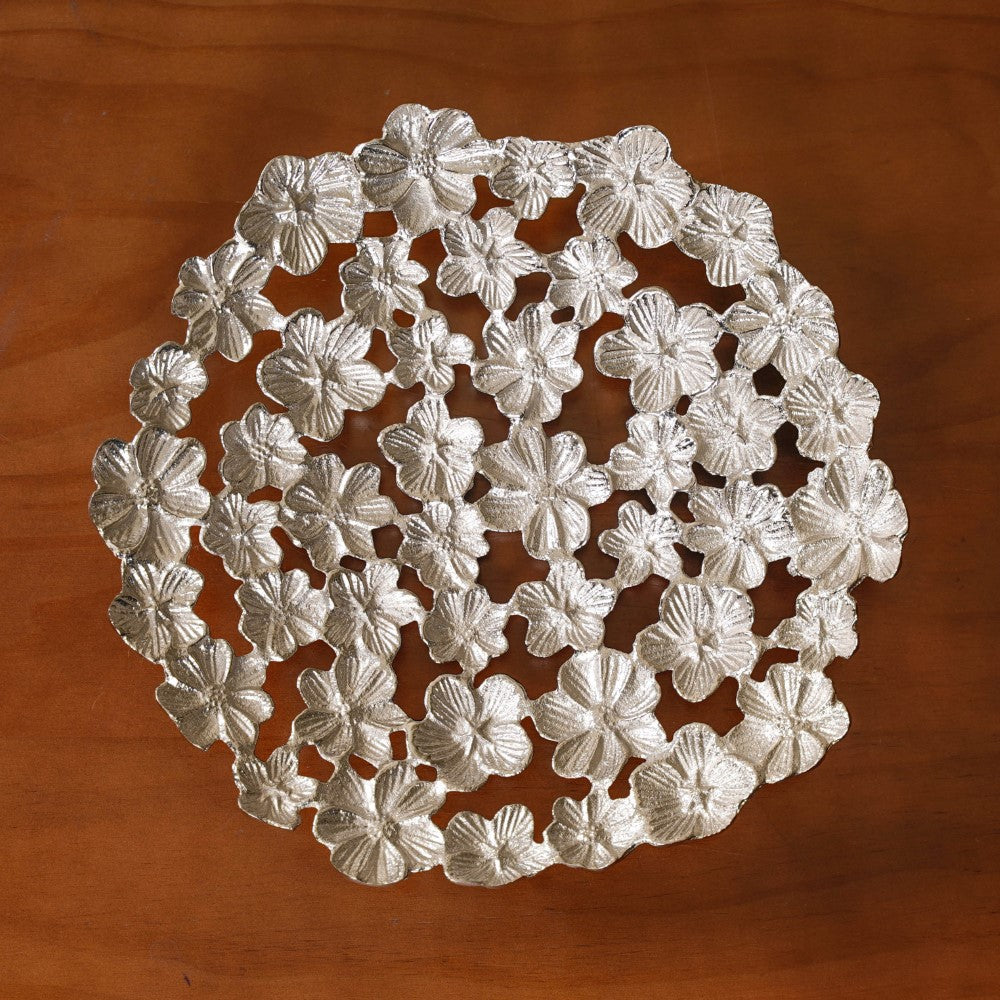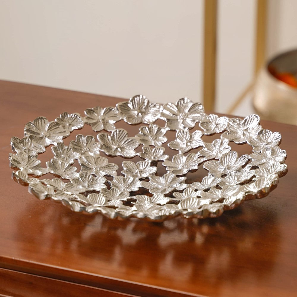 Introducing our amazing floral design decorative tray in a gorgeous silver colour, made of premium-grade, food-safe aluminium! With this platter that skillfully combines elegance and functionality, you can elevate the look of your home. It is the ideal centrepiece for any event, thanks to the exquisite floral design. The silver finish guarantees durability and low maintenance in addition to lending a hint of grandeur. This premium decorative tray ensures a touch of luxury that will leave your guests in wonder while serving exquisite sweets at gatherings or showcasing priceless treasures.