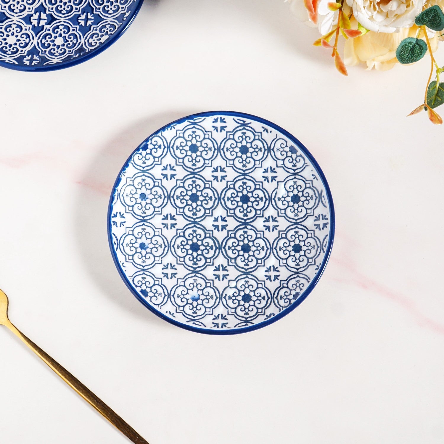 Design: Each plate is crafted from premium stoneware ceramic and finished with detailed blue and white prints inspired by classic Moroccan tile and foliage patterns. The glossy glaze brings out the richness of the colours, while the round shape keeps the overall design simple and elegant.