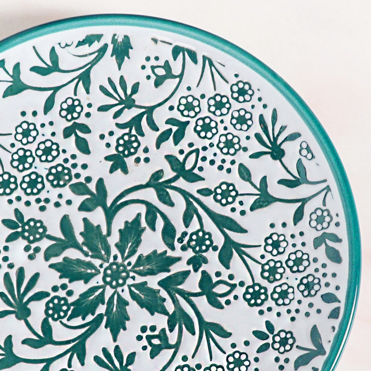 Design: The set draws inspiration from Moroccan tiles, featuring intricate teal and white patterns that balance tradition with a modern touch. Each plate shows soft transitions of colour and subtle design variations that add character without overwhelming the eye. The glossy finish accentuates the artwork, while the circular shape keeps the look elegant and balanced.