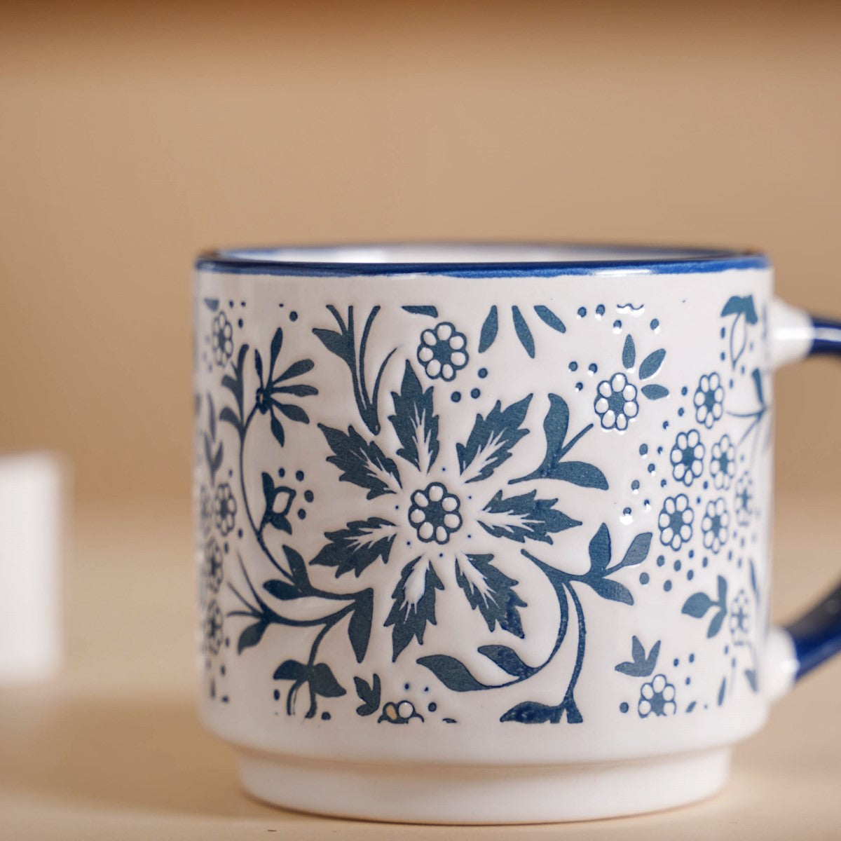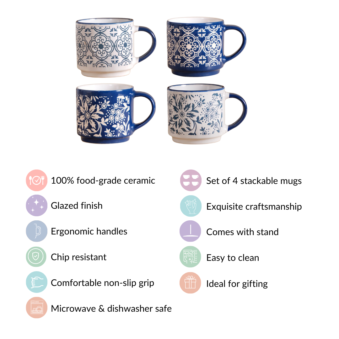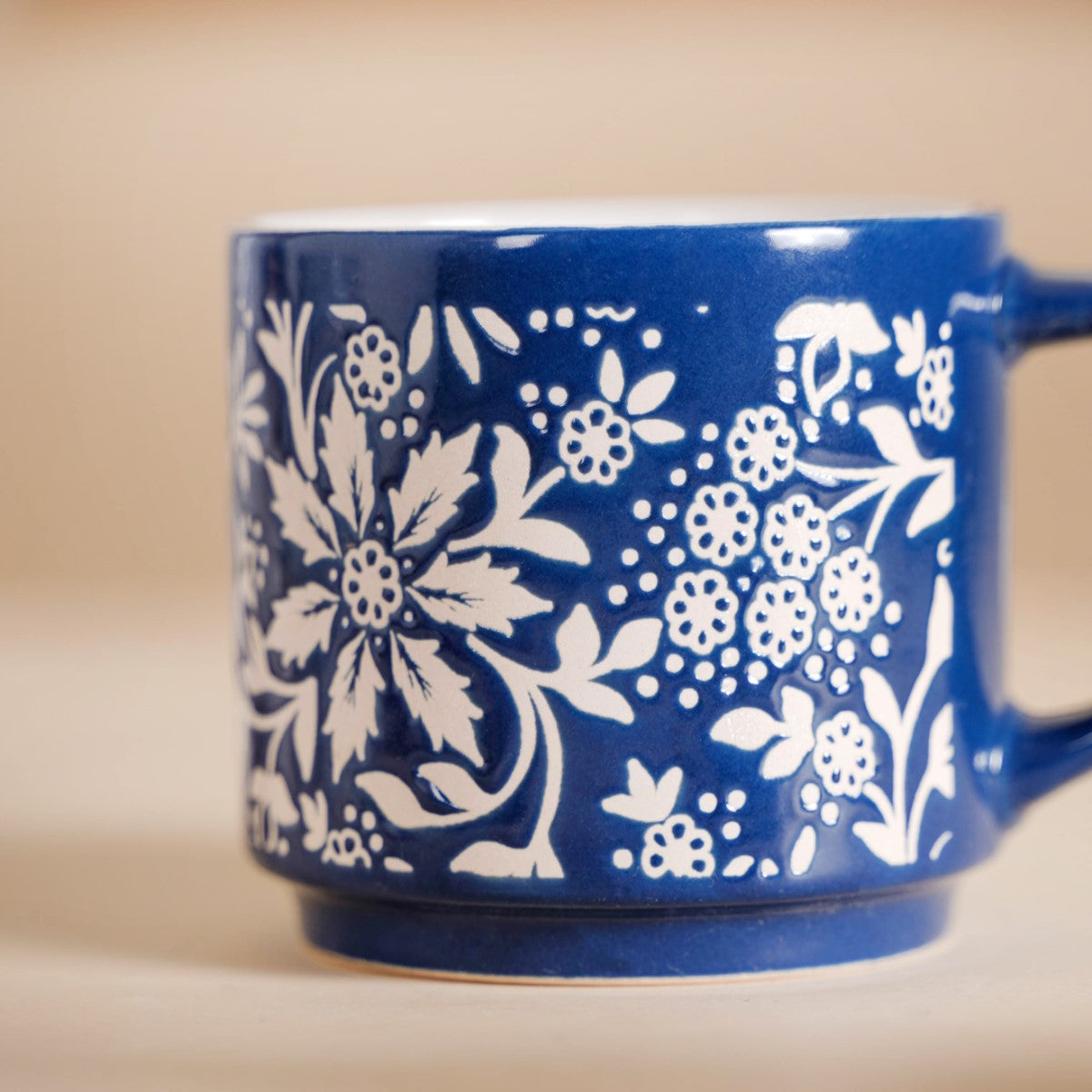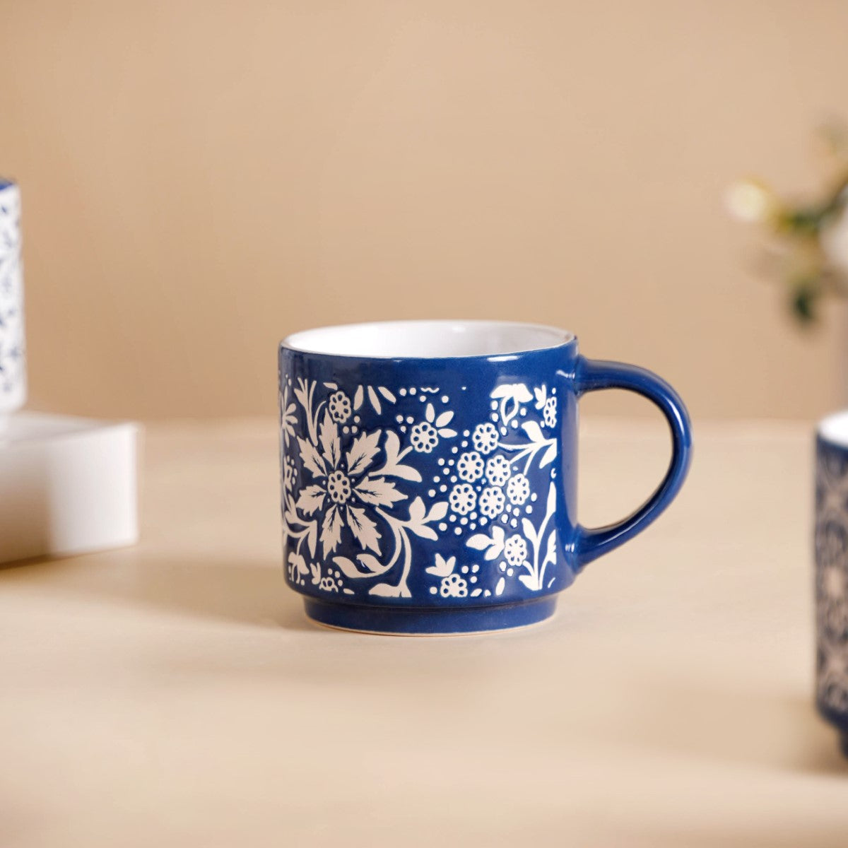 Introducing our floral relief stackable coffee mugs set of 4. This meticulously designed set comprises two pairs of dark blue and white mugs, each with floral patterns silk-screen printed in contrasting hues. The seamless interplay between the coordinating white and dark blue cups creates a visually striking contrast. Accompanied by a convenient stand for effortless storage, they boast practicality too. These mugs are sturdy, chip-resistant, microwave, and dishwasher-safe, ensuring easy maintenance. With a comfortable non-slip grip and design, savour your daily coffee without worry.