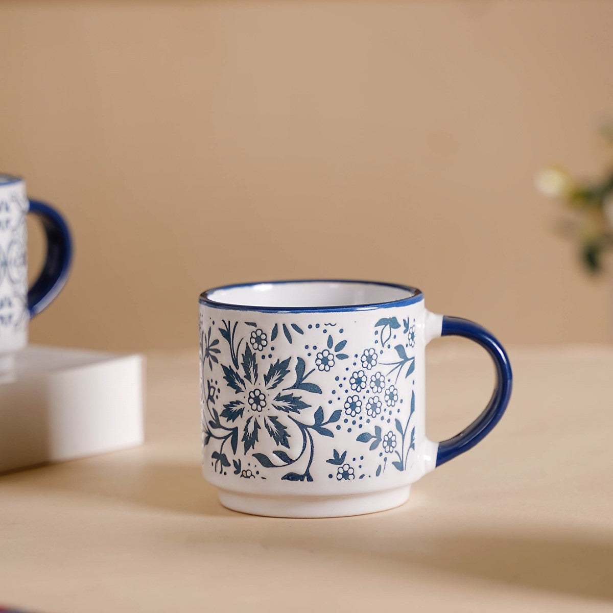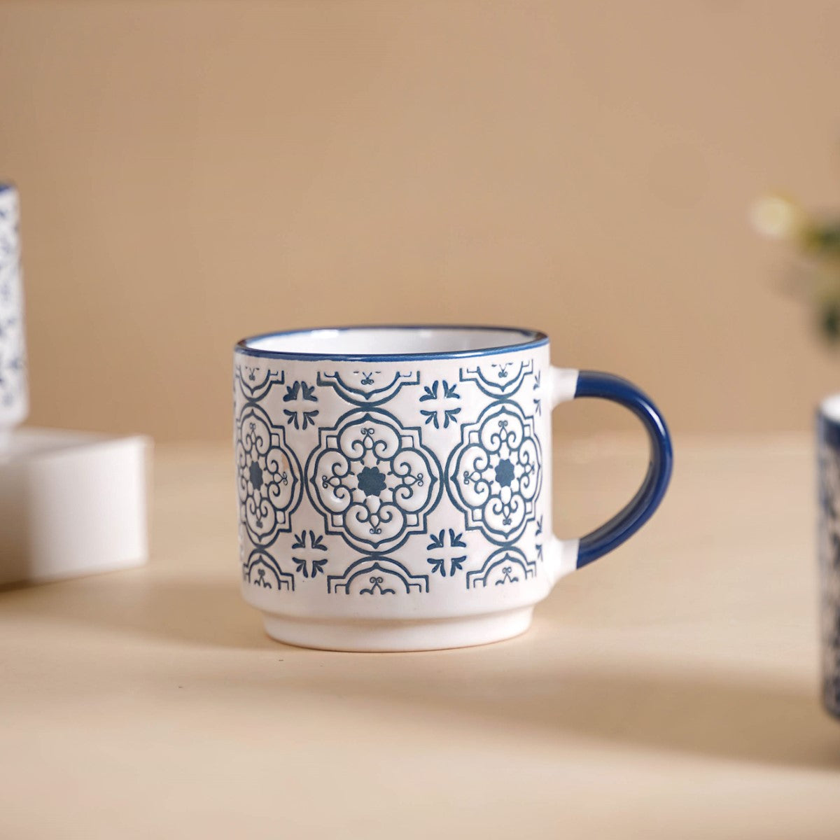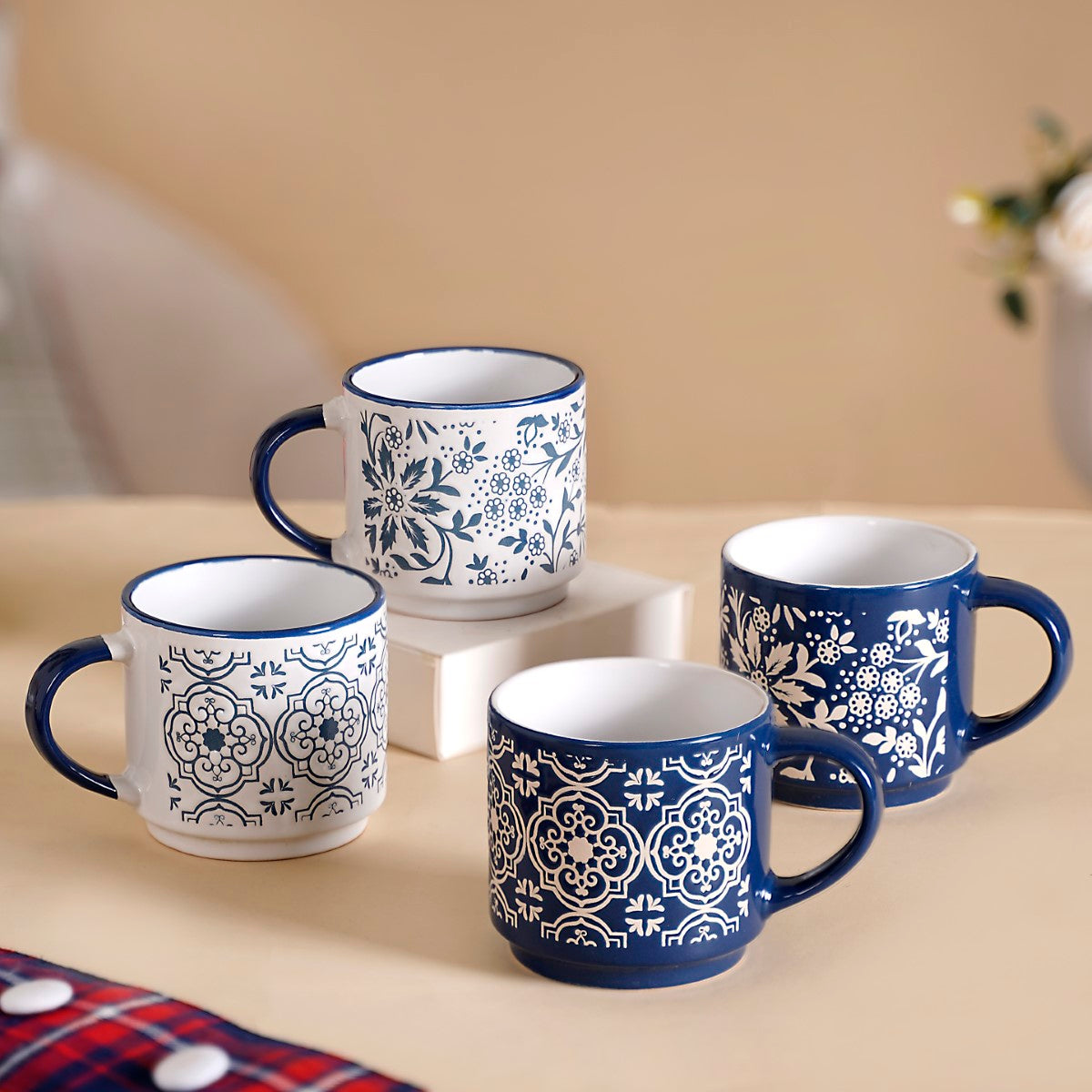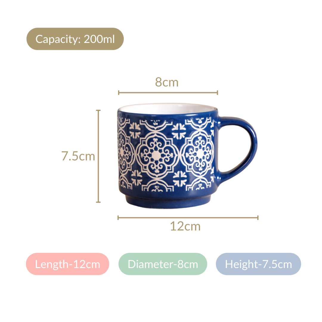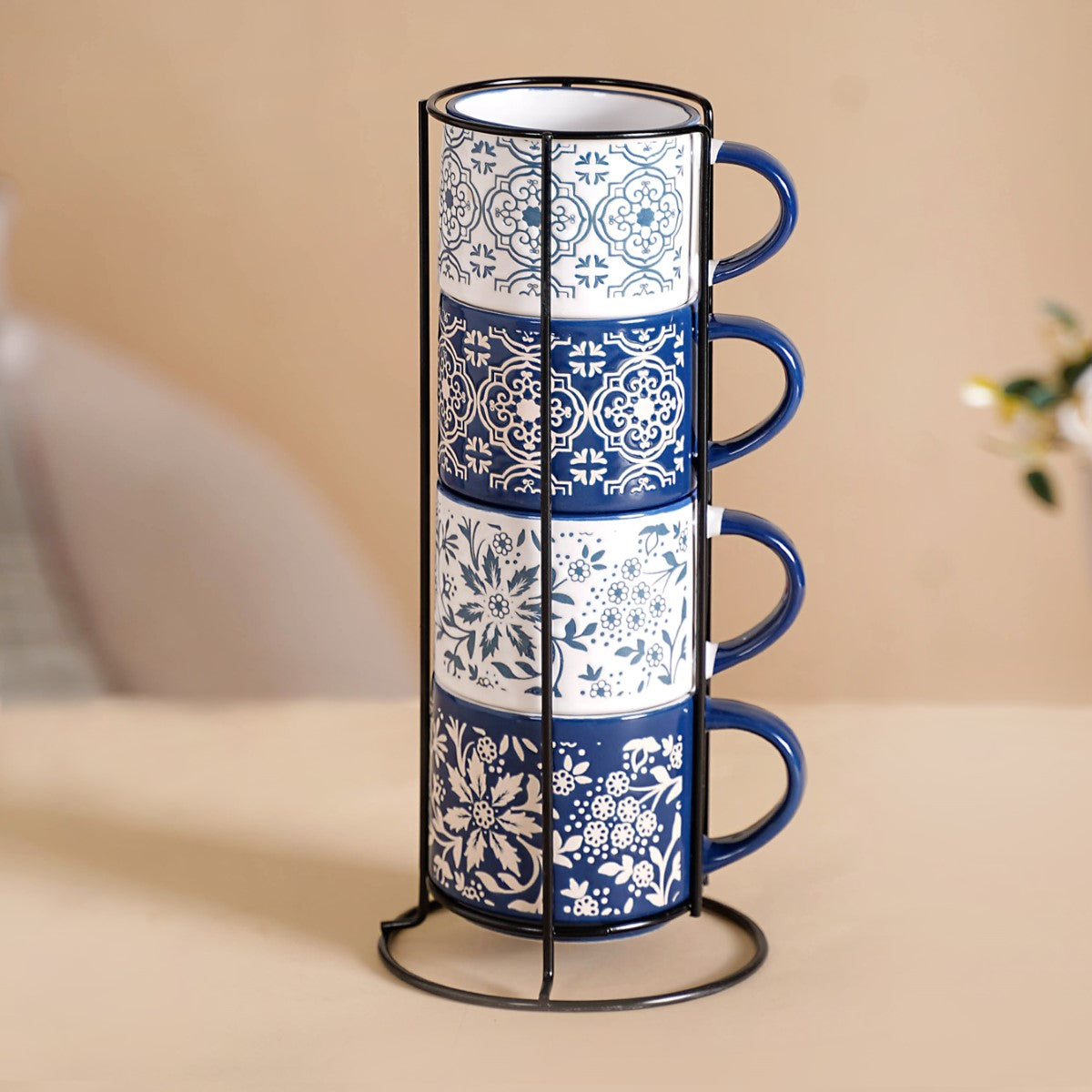 Introducing our floral relief stackable coffee mugs set of 4. This meticulously designed set comprises two pairs of dark blue and white mugs, each with floral patterns silk-screen printed in contrasting hues. The seamless interplay between the coordinating white and dark blue cups creates a visually striking contrast. Accompanied by a convenient stand for effortless storage, they boast practicality too. These mugs are sturdy, chip-resistant, microwave, and dishwasher-safe, ensuring easy maintenance. With a comfortable non-slip grip and design, savour your daily coffee without worry.