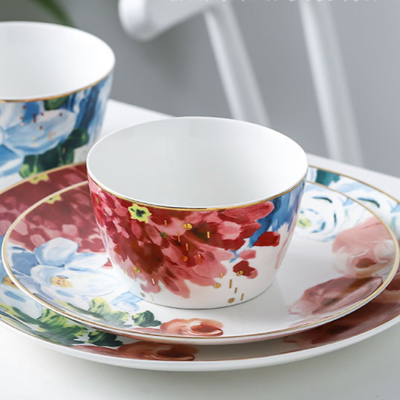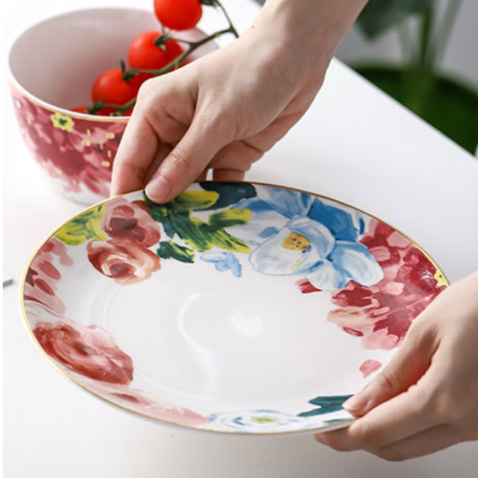Floral plate in bright looking colours with a gold lining along the rim to add luxury. The plates are available in two sizes. The floral plates can be used as as side plates for salads, starters, snacks or even desserts. The delicate floral print along the side of the plate makes for graceful table styling