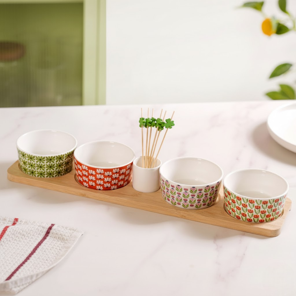 Design: The seven-piece serving set includes four patterned ceramic bowls, a natural bamboo wood tray, and a white ceramic holder cup with clover-shaped decorative picks. Each bowl showcases unique, colourful floral designs that rest securely on the slim rectangular tray. The set comes ready to gift in its own beautiful box.