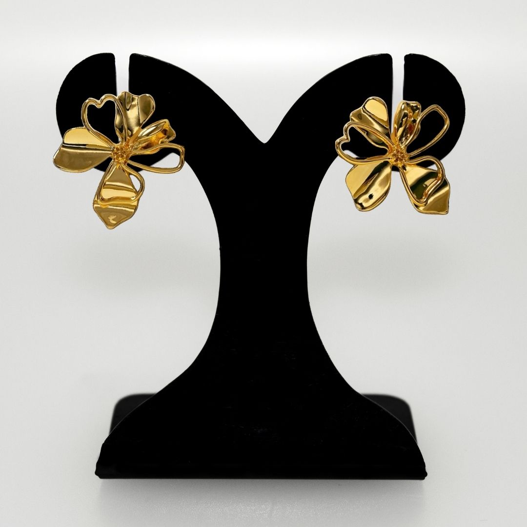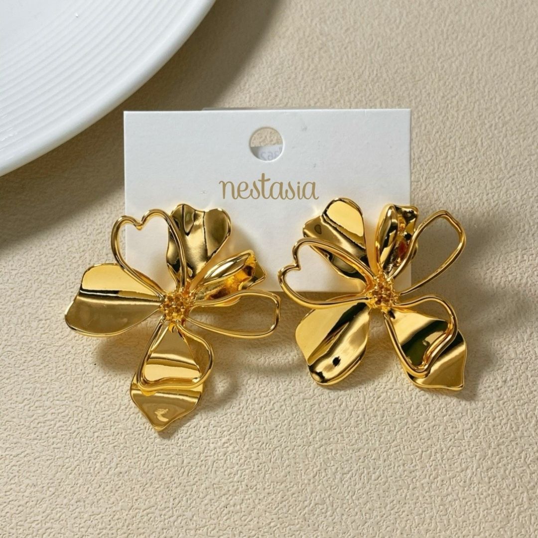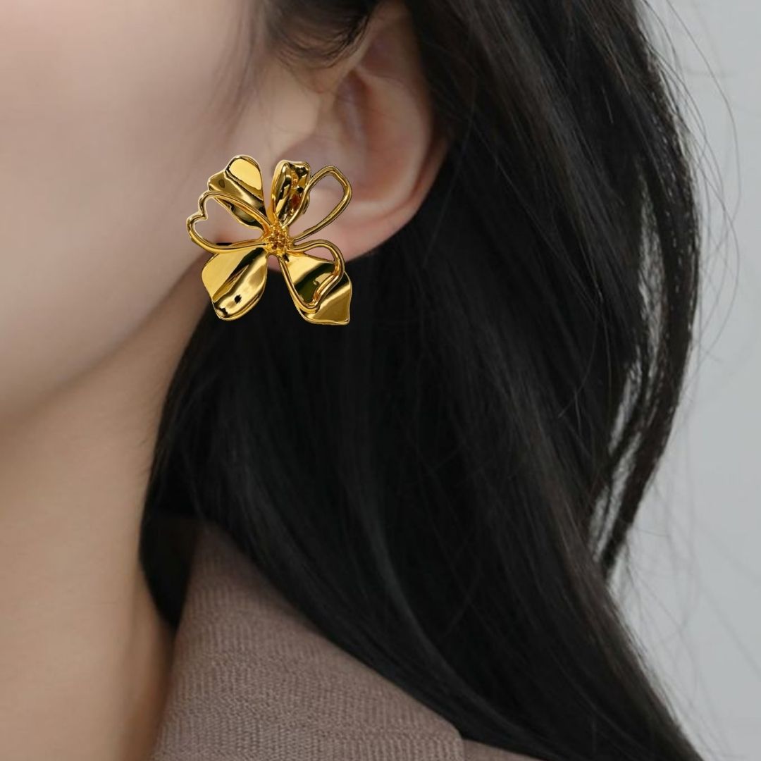 This elegant drop flower earring features six intricately designed petals, blending delicate gold outlines with solid gold petals that carry unique dents and folds for added texture. The mix of soft curves and refined detailing creates a perfect balance of femininity and modern charm.