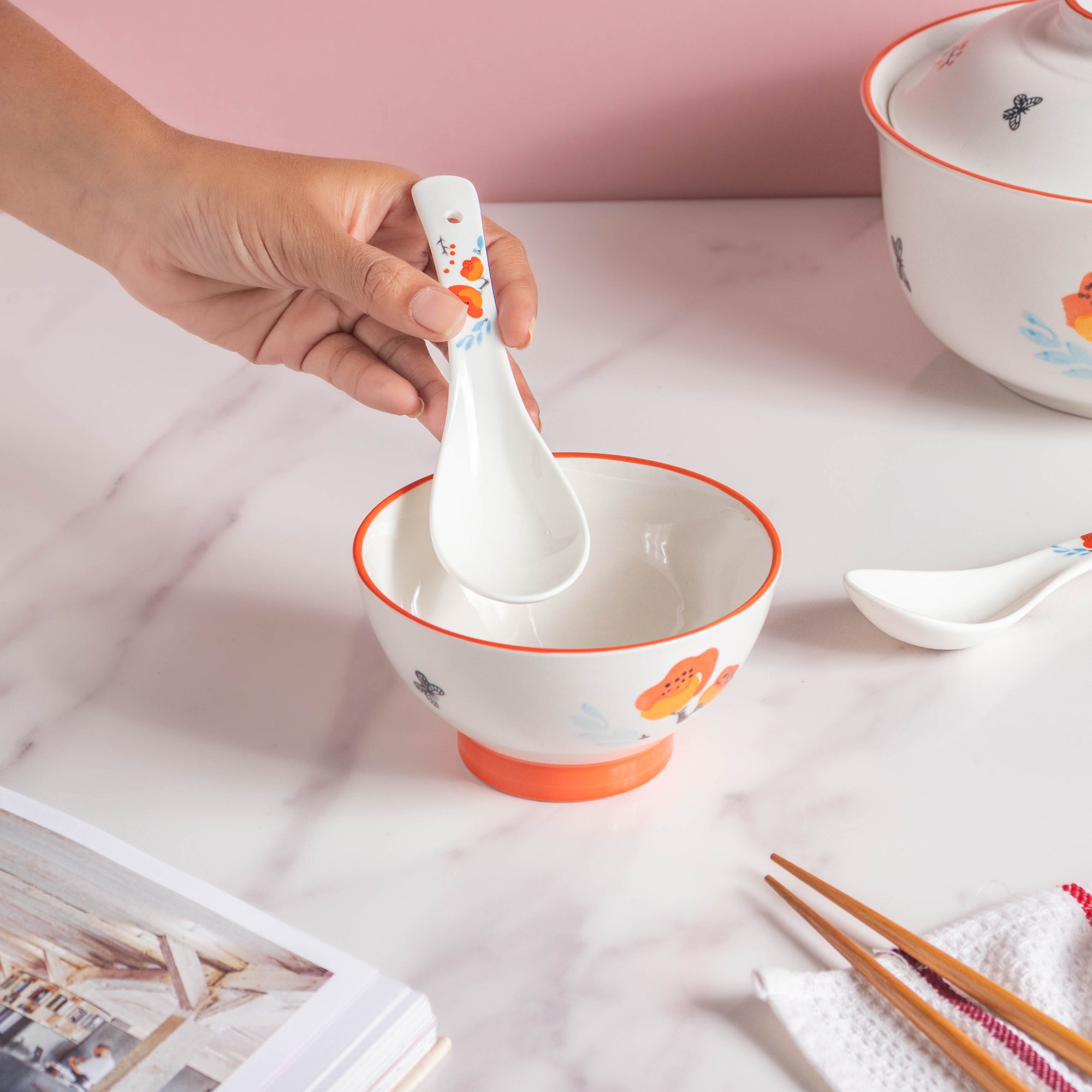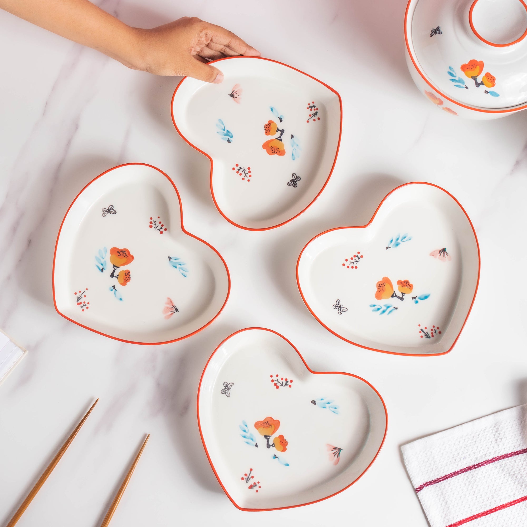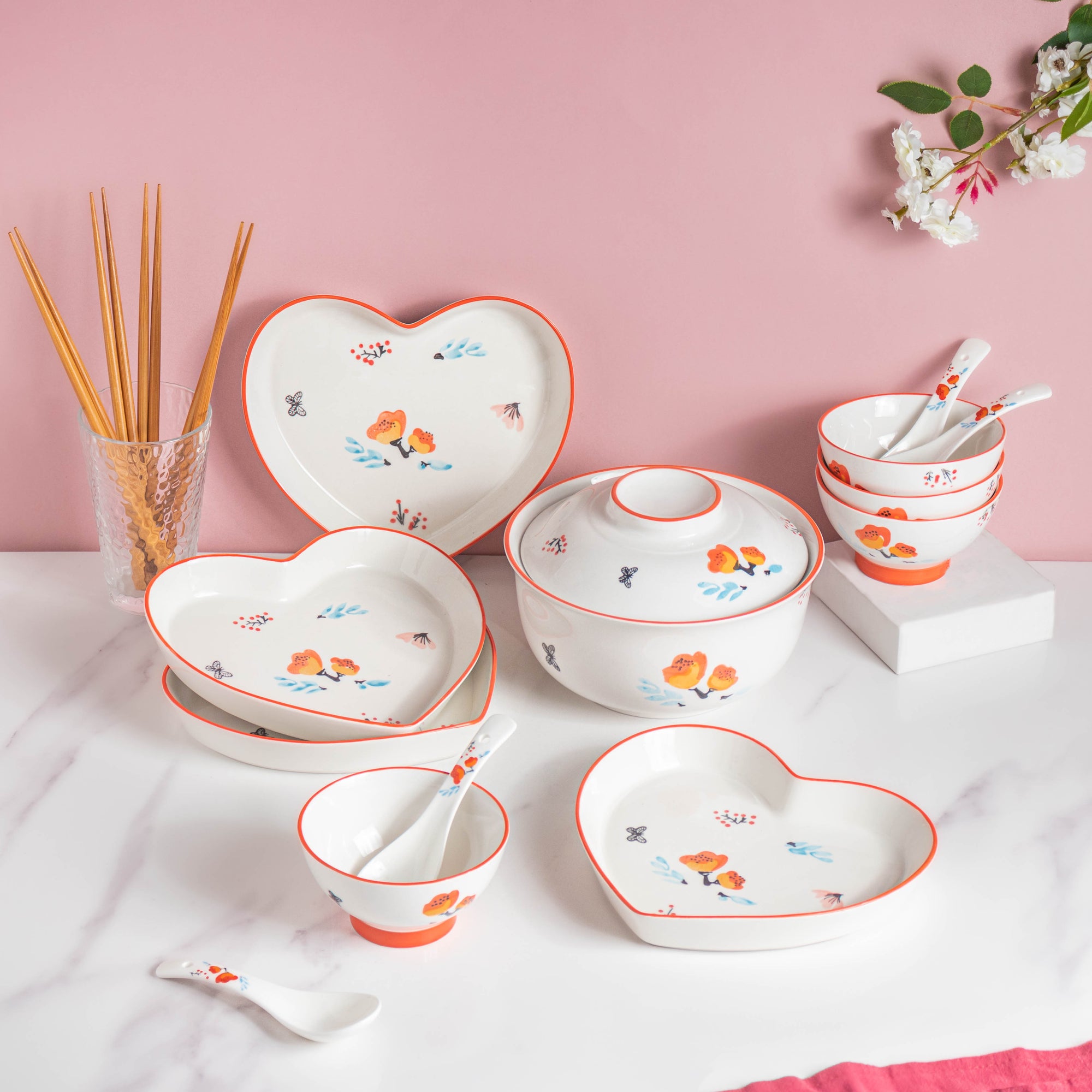 Adding some quirk to the table can become hard, one doesn't want to come off as overbearing. The perfect and easiest way is to get a set that is minimal while also being unique and colorful. The thirteen-piece set is exactly that, with minimal floral prints on a pristine white backdrop. The ceramic set has four heart plates, a pot with a lid, four bowls, four soup spoons, and four pairs of chopsticks. Dim sums can be served on the heart-shaped plates, while soups and dips can be served in the little bowls. The plates can be used separately or in a creative way to serve snacks, fruits, and other items. The plates also offer a splash of color to the table, making it appear more trendy and appealing. Nestip: The pot with lid in the ceramic set can be used as a serving bowl separately. Color: White and redCapacity:Serving Bowl: 1200mlSmall Bowl: 300 ml Material: Ceramic Style: B17MA21B251
