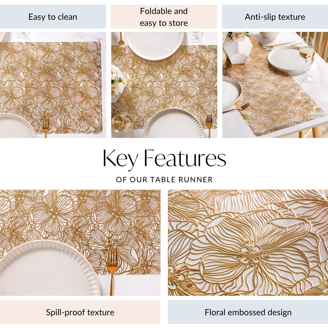 Design: Add a touch of elegance to your table setting with this beautifully crafted PVC table runner. Featuring an embossed floral design in a radiant golden finish, the intricate pattern stands out against a transparent backdrop, creating a sophisticated and modern look. Whether for a formal dinner or casual brunch, this runner brings charm and refinement to any dining space.