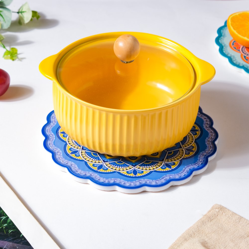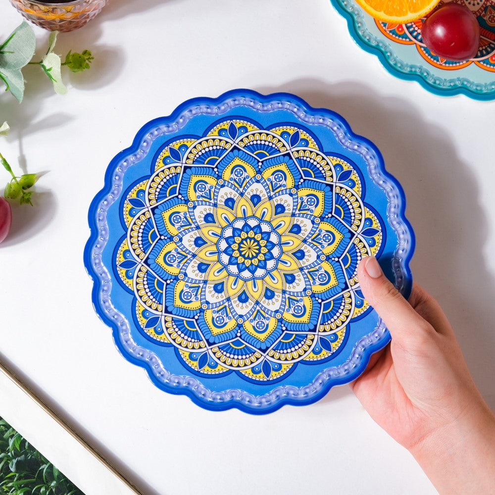 The traditional Moroccan tile pattern and Persian style art are well-known throughout the world. They can be called the “world’s eighth wonder” for their intricacy, vibrant hues, and harmonious blend of mandalas. Our collection of ceramic coaster/trivet is a gateway to incorporate this eighth wonder into your living room, dining table or as a beautiful decor piece. While the trivets are the quintessential companion of your ceramic, earthen, copper, clay, glass pots, hotpots, pans, bowls and plates, other cookware, the coasters can be the new best friends of serveware, wine glasses, cocktail glasses, and glass coffee mugs or cups.