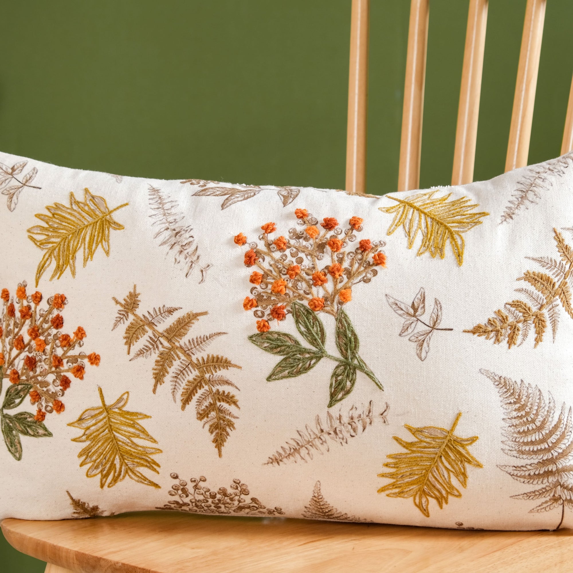 Design: Crafted from cotton slub, this cushion cover features embroidered floral and fern patterns in earthy orange, brown, and green tones. The soft white base enhances the natural theme, while the rectangular silhouette fits standard cushions easily. A concealed zipper offers a clean closure, and the medium-weight fabric with natural texture ensures the cushion holds its shape beautifully over time.