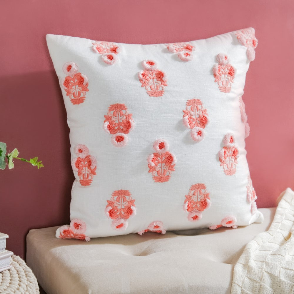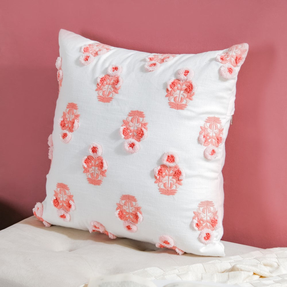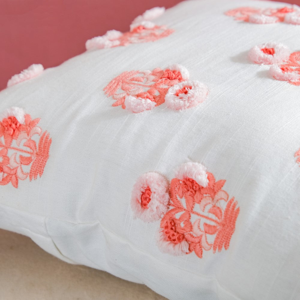 Adorn the lovely abode with a burst of peachy florals on a white surface, to enliven the living room or bedroom corners. One can use the cushion cover to deck up the balcony or garden seating area. The surface ornamentation on the cushion cover with 3D embroidery is sure to be a show-stealer. From minimal to modern decor, the cushion can be placed in any setting.