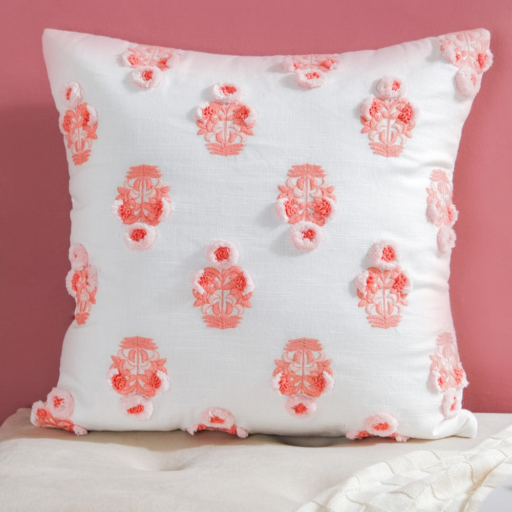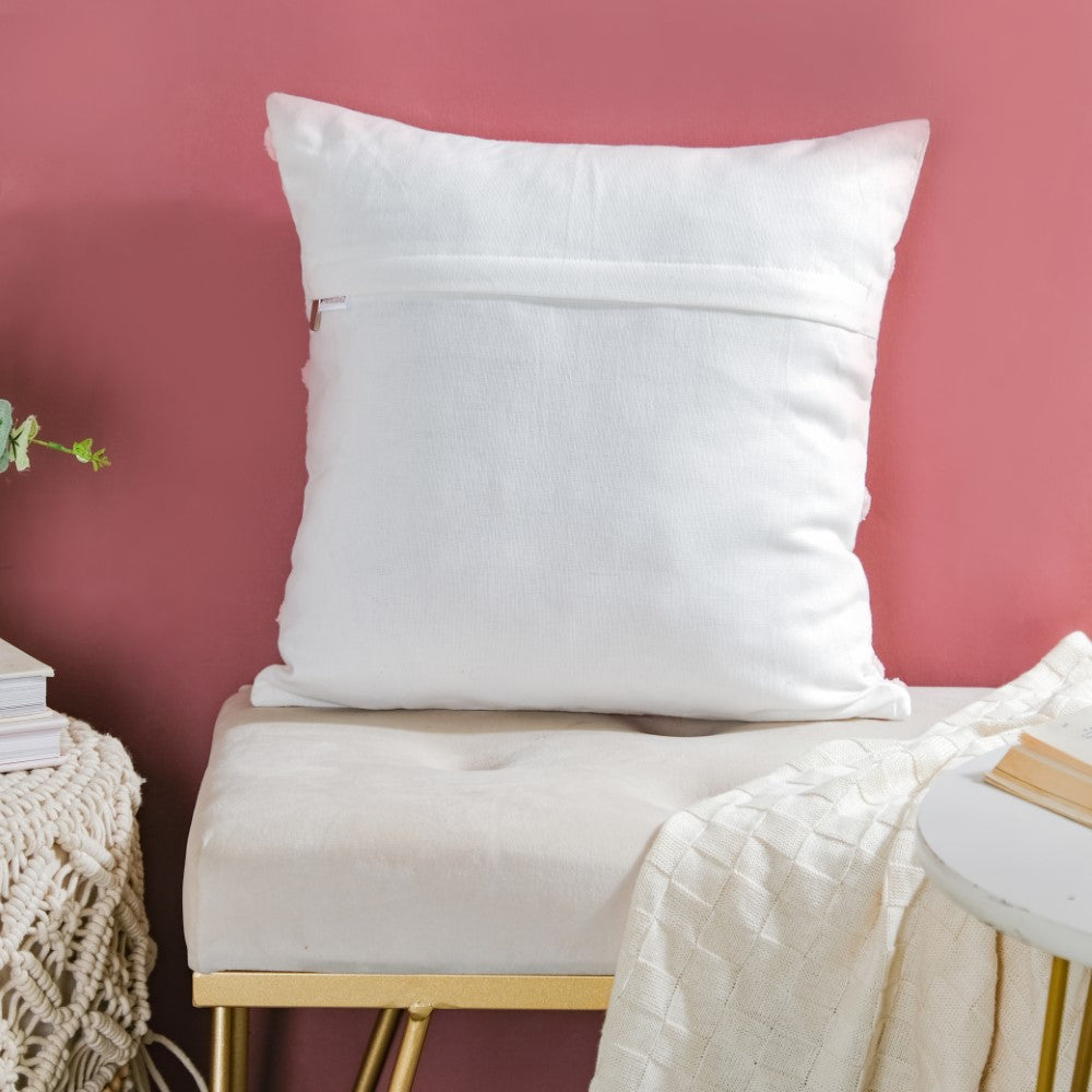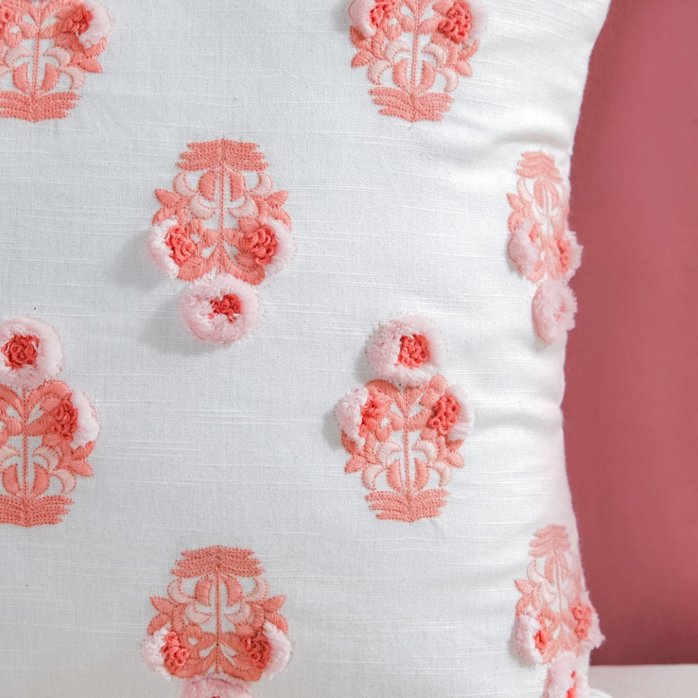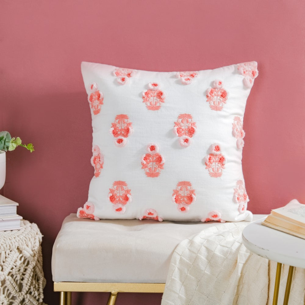 Adorn the lovely abode with a burst of peachy florals on a white surface, to enliven the living room or bedroom corners. One can use the cushion cover to deck up the balcony or garden seating area. The surface ornamentation on the cushion cover with 3D embroidery is sure to be a show-stealer. From minimal to modern decor, the cushion can be placed in any setting.