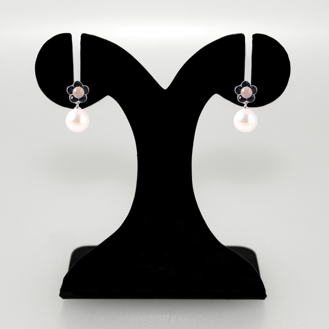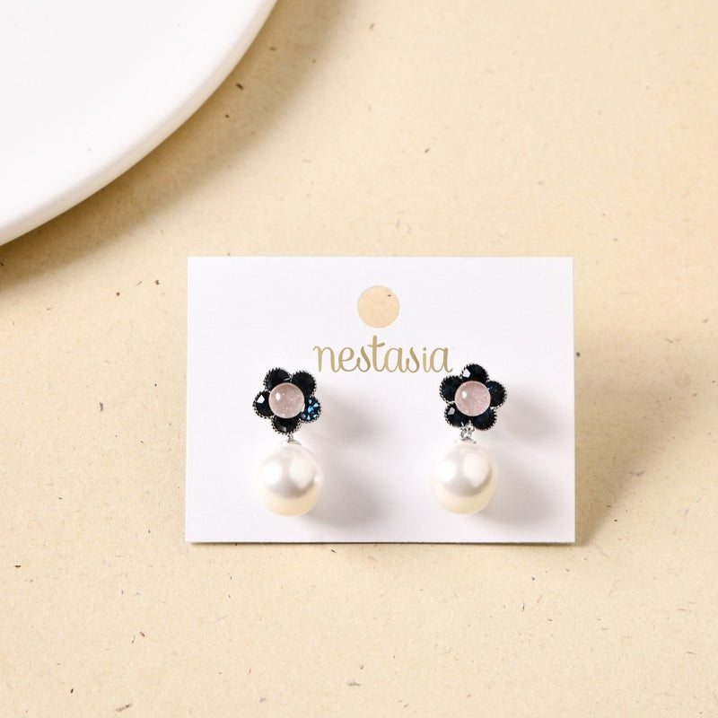 A beautiful fusion of nature and elegance, these drop earrings are a testament to timeless charm. Inspired by the delicate allure of blooming flowers, the earrings feature a small flower with black petals, its silver-edged rim framing a translucent pink ball at the center. The drop gracefully extends into a lustrous faux pearl, creating a perfect balance of sophistication and subtle femininity. Ideal for those who seek a refined touch, these earrings add a gentle, yet striking elegance to any occasion.