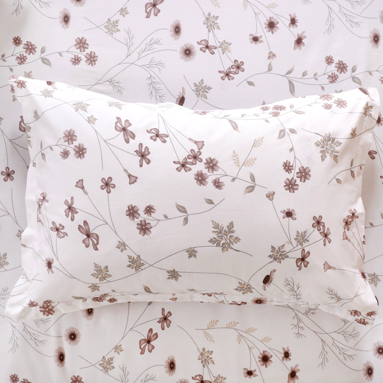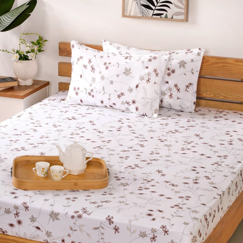 Design: Meticulously crafted, this printed bedsheet exudes all things comfort, simplicity, and elegance. Adorned with taupe flowers completed by earthy stems and soft green leaves against a crisp white base, creates a subtle yet eye-catching contrast that feels both calming and elegant. The matching cotton pillowcases complete the look, ensuring your bedding feels as coordinated as it looks beautiful. Whether styled minimally or layered with textured throws, this set brings effortless charm to any bedroom.