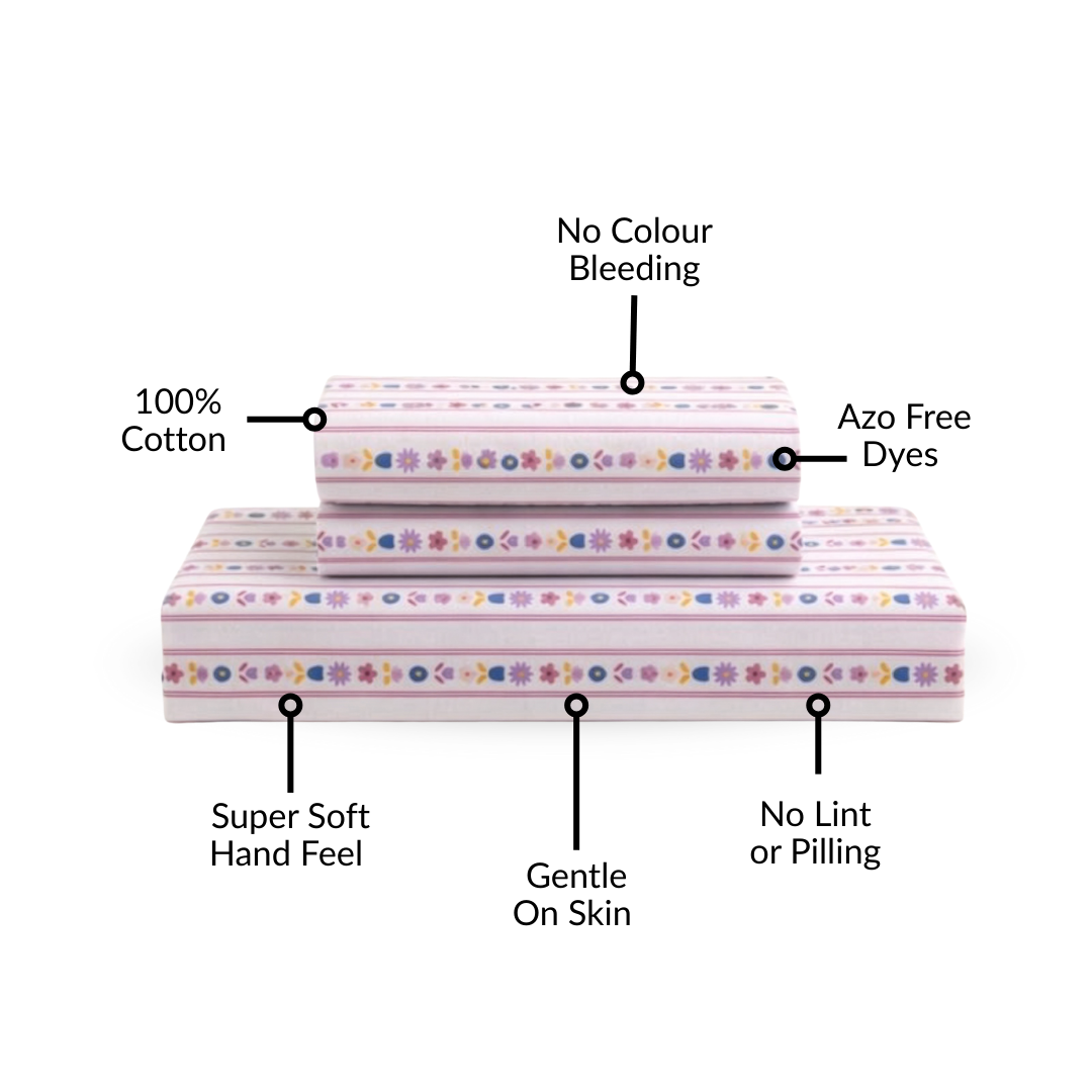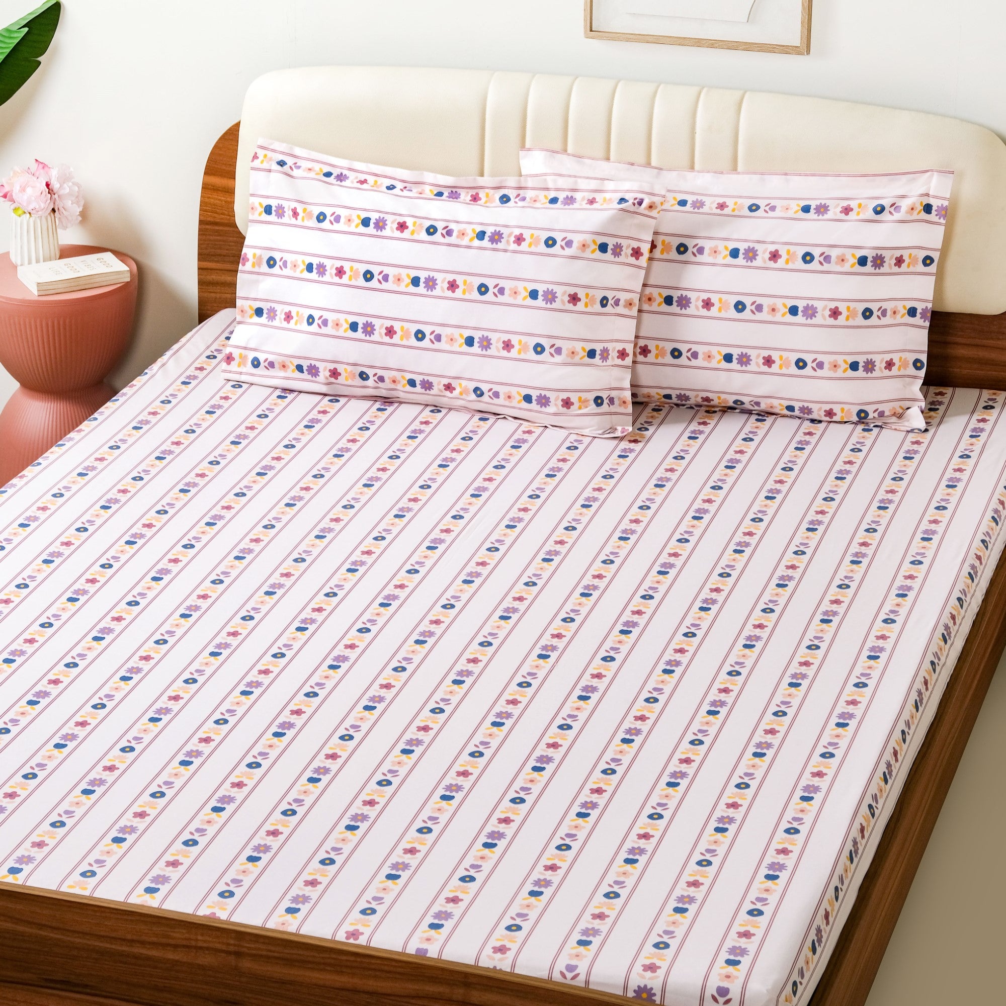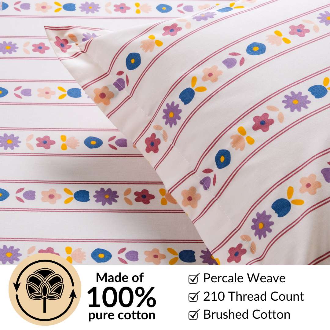 Design: This premium bedding set features a soft pink base with slim vertical stripes, decorated with charming floral motifs in red, yellow, purple, and blue tones. The repeating flower and leaf pattern runs in neat stripes, giving your room a fresh, botanical vibe with a calm, modern twist. The set includes one Queen-size bedsheet and two matching pillowcases.