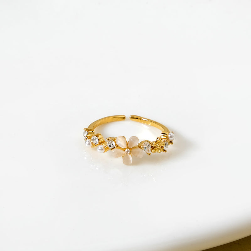 Charming yet effortlessly stylish, this gold-toned ring is all about celebrating elegance. Imagine a beautiful arrangement of sparkling stones and lustrous pearls playfully intertwining in a zig-zag pattern, catching the light at every turn. At the center, a delicate white PVC flower blooms, with its soft yet structured petals gently cradling a radiant iridescent stone that glimmers as you move. This ring strikes the perfect balance between grace and shine, making it a delightful addition to any jewellery collection.