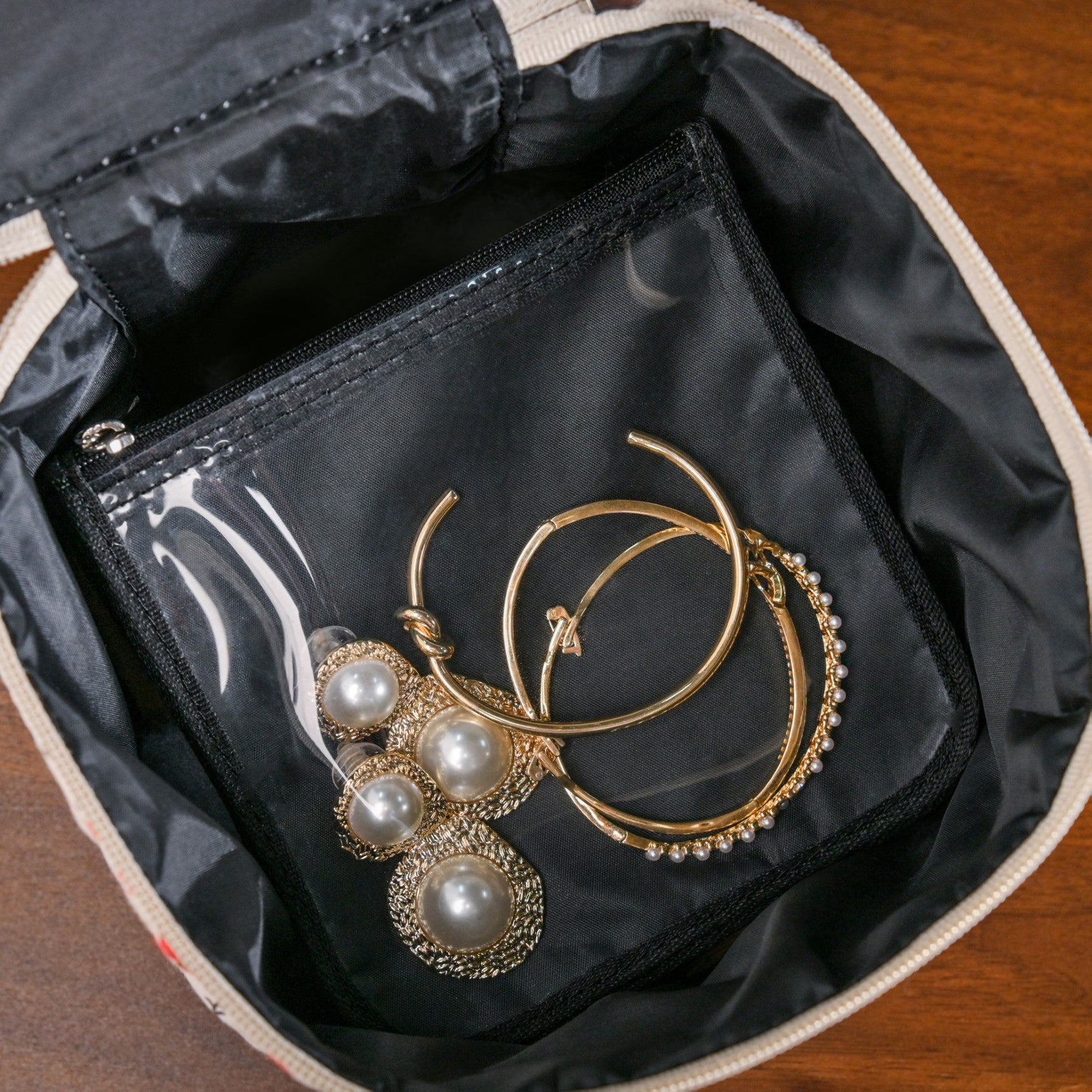 Design: Ideal for daily use or travel, this multi-utility set offers a stylish solution to clutter. Whether you're storing cosmetics, skincare, or cords and cables, the pouches keep everything neatly in place. Made from quilted poly slub fabric with an inner black polyester lining, the bag is perfect for storing your makeup essentials. The exterior features delicate orange floral motifs on a cream base, paired with a smooth zipper and minimal branding for an understated aesthetic. The 6 included transparent pouches add extra utility for separating tiny items such as cards and bills.