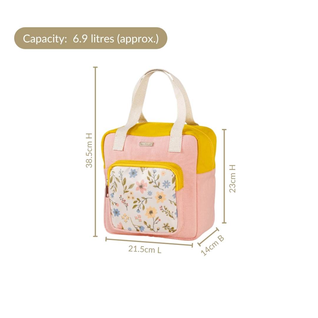 Design: The lunch bag features a bright yellow and soft pink canvas cotton body. It has a sturdy and structured design that looks modern and clean. The front has a printed nylon pocket with a lovely floral pattern. A secure metal zipper and sturdy white handles add a stylish look.