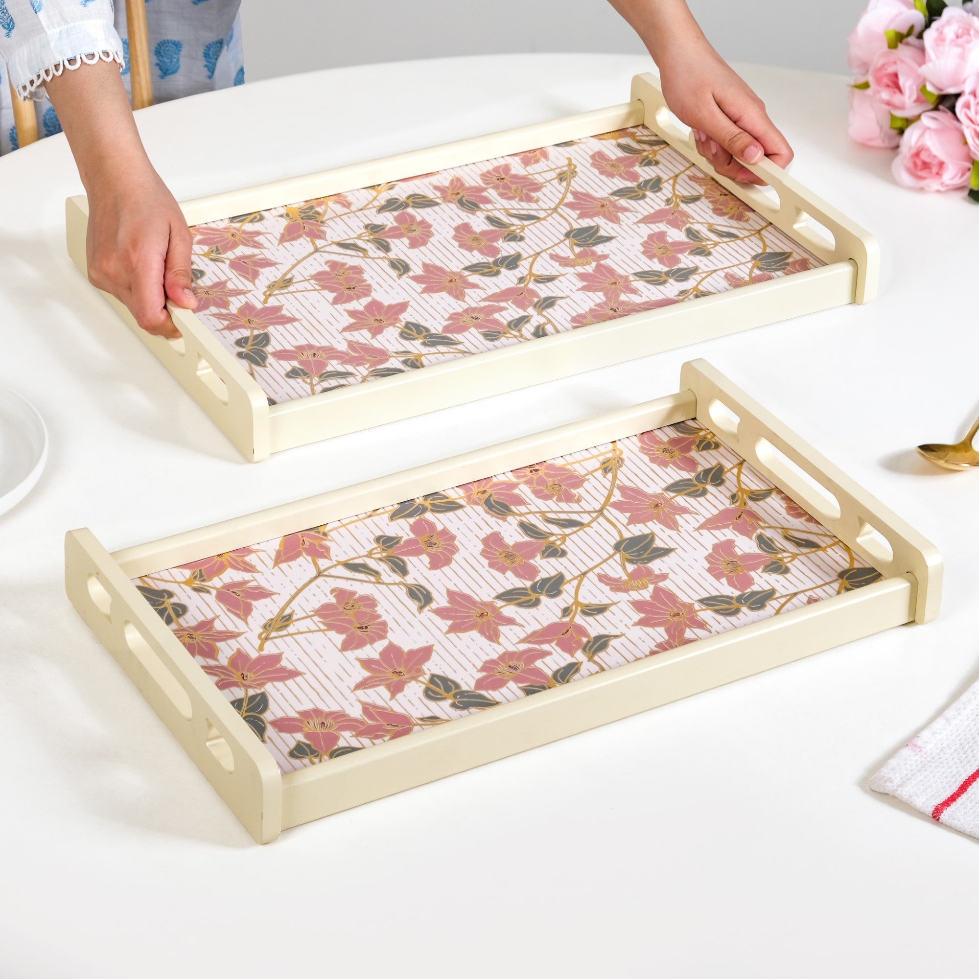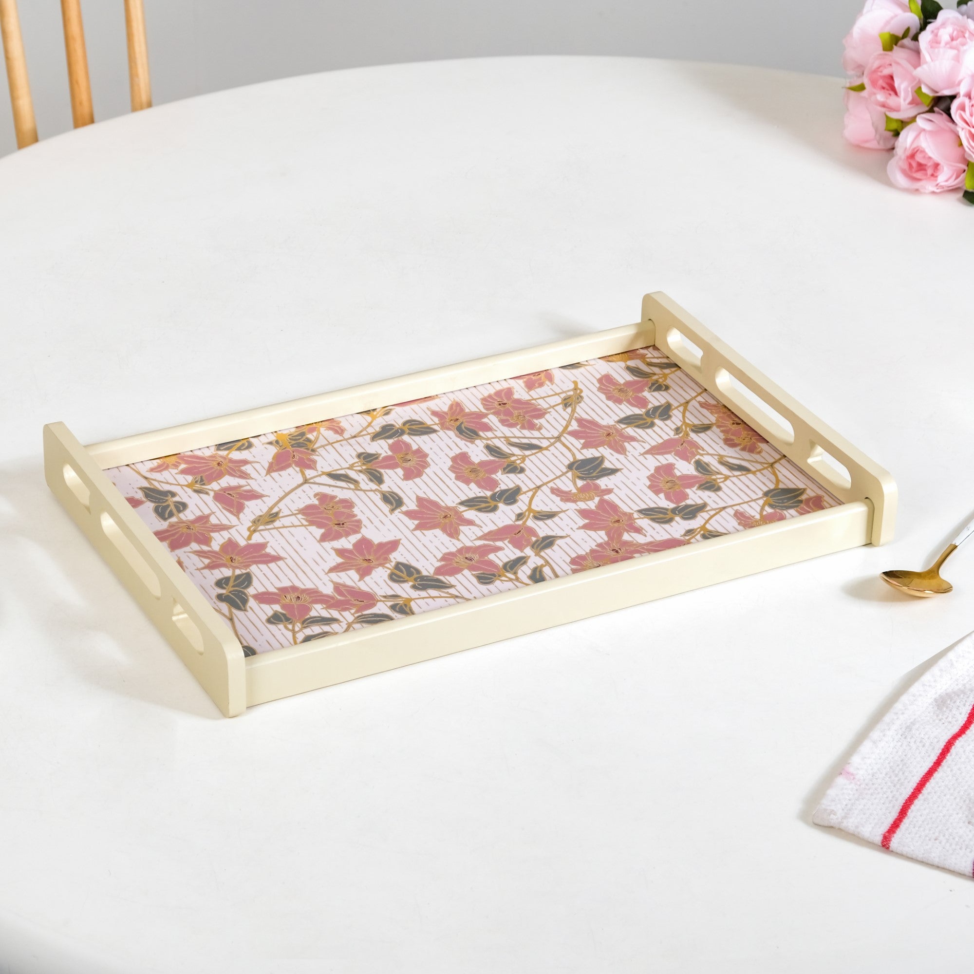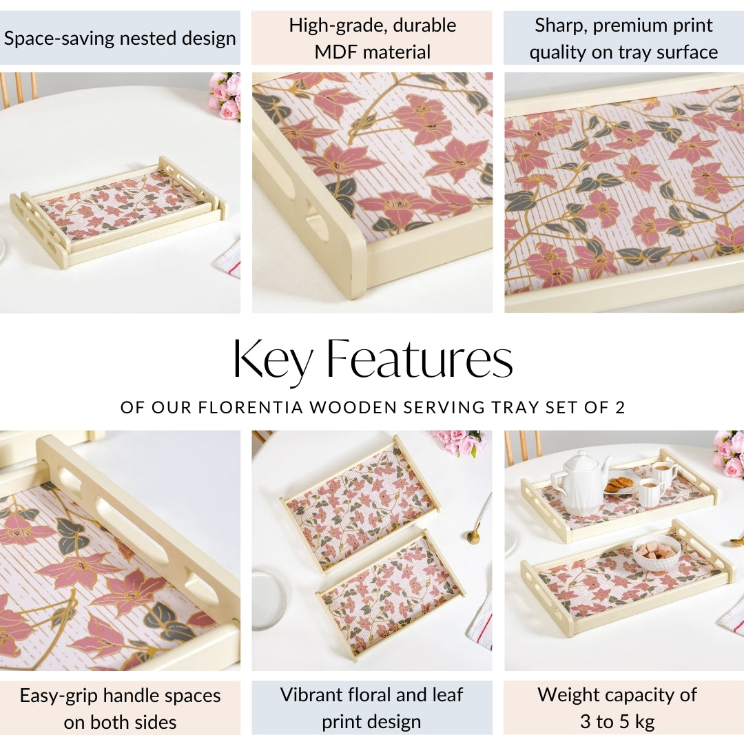Design: Named Florentia, the Latin word for "blooming" and "flourishing," this wooden tray set embodies beauty and refinement. The trays feature a sturdy base, slightly risen from the tabletop, ensuring stability while preventing spills or heat marks on delicate surfaces. The white base, adorned with lush floral and leaf designs in bold, striking colours, creates a visually appealing contrast. The ergonomic handle spaces at both ends provide a firm and comfortable grip, making serving effortless.