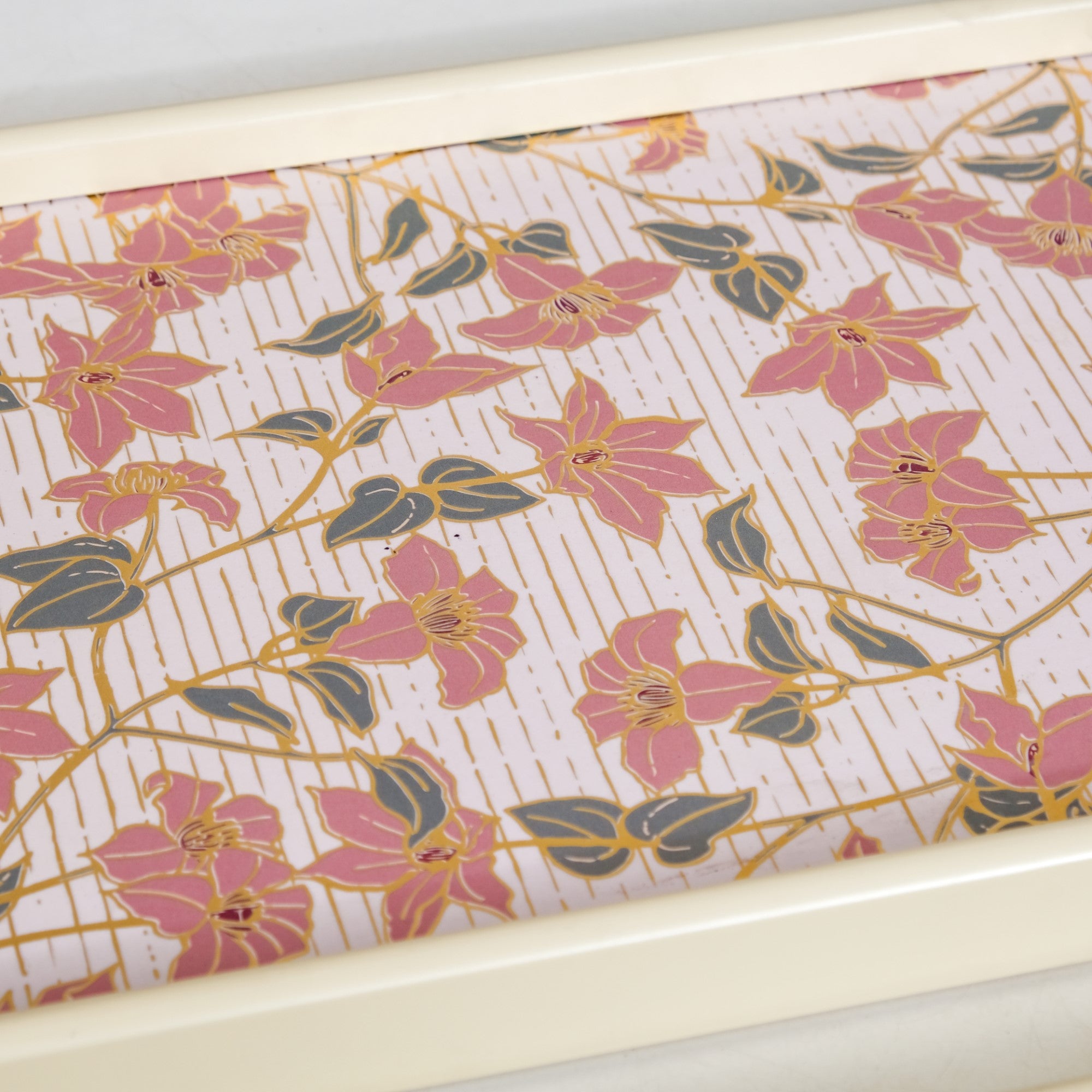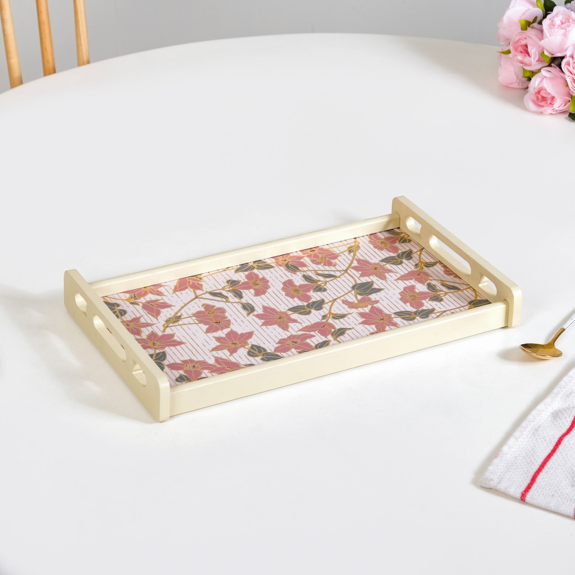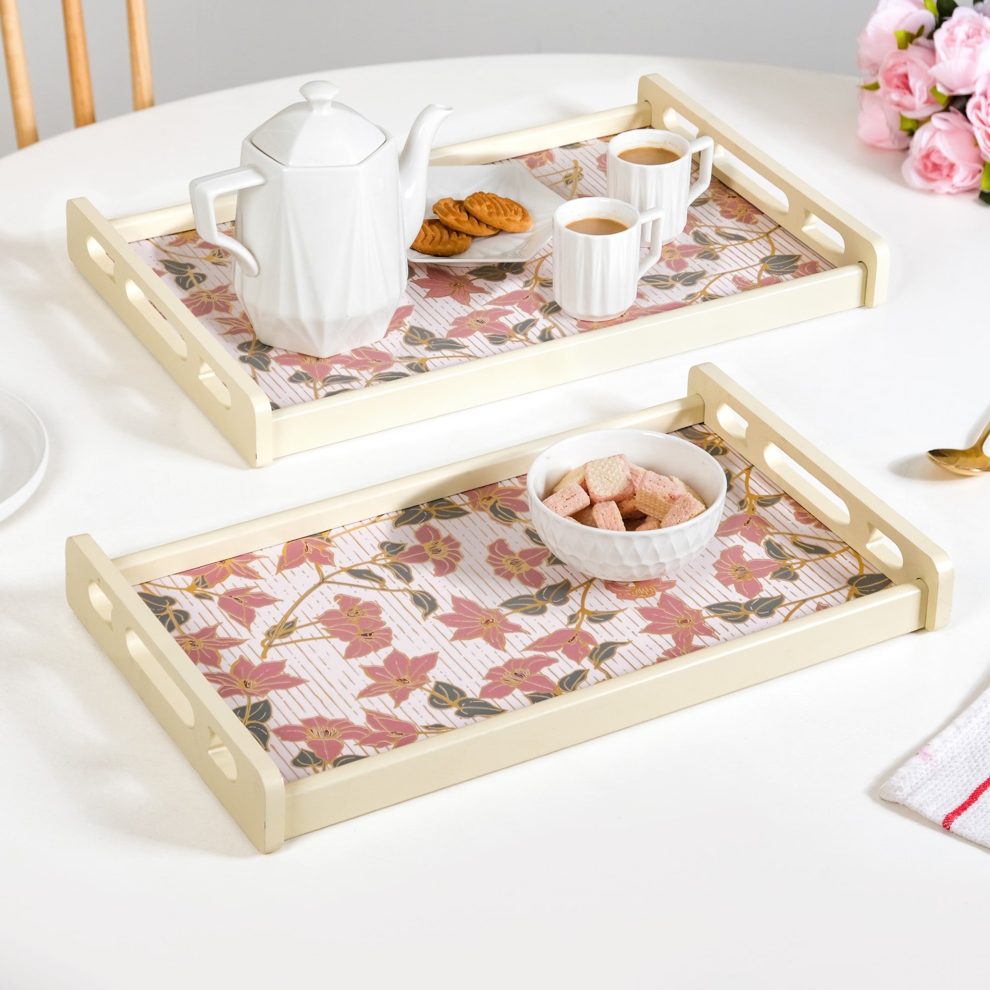 Design: Named Florentia, the Latin word for "blooming" and "flourishing," this wooden tray set embodies beauty and refinement. The trays feature a sturdy base, slightly risen from the tabletop, ensuring stability while preventing spills or heat marks on delicate surfaces. The white base, adorned with lush floral and leaf designs in bold, striking colours, creates a visually appealing contrast. The ergonomic handle spaces at both ends provide a firm and comfortable grip, making serving effortless.