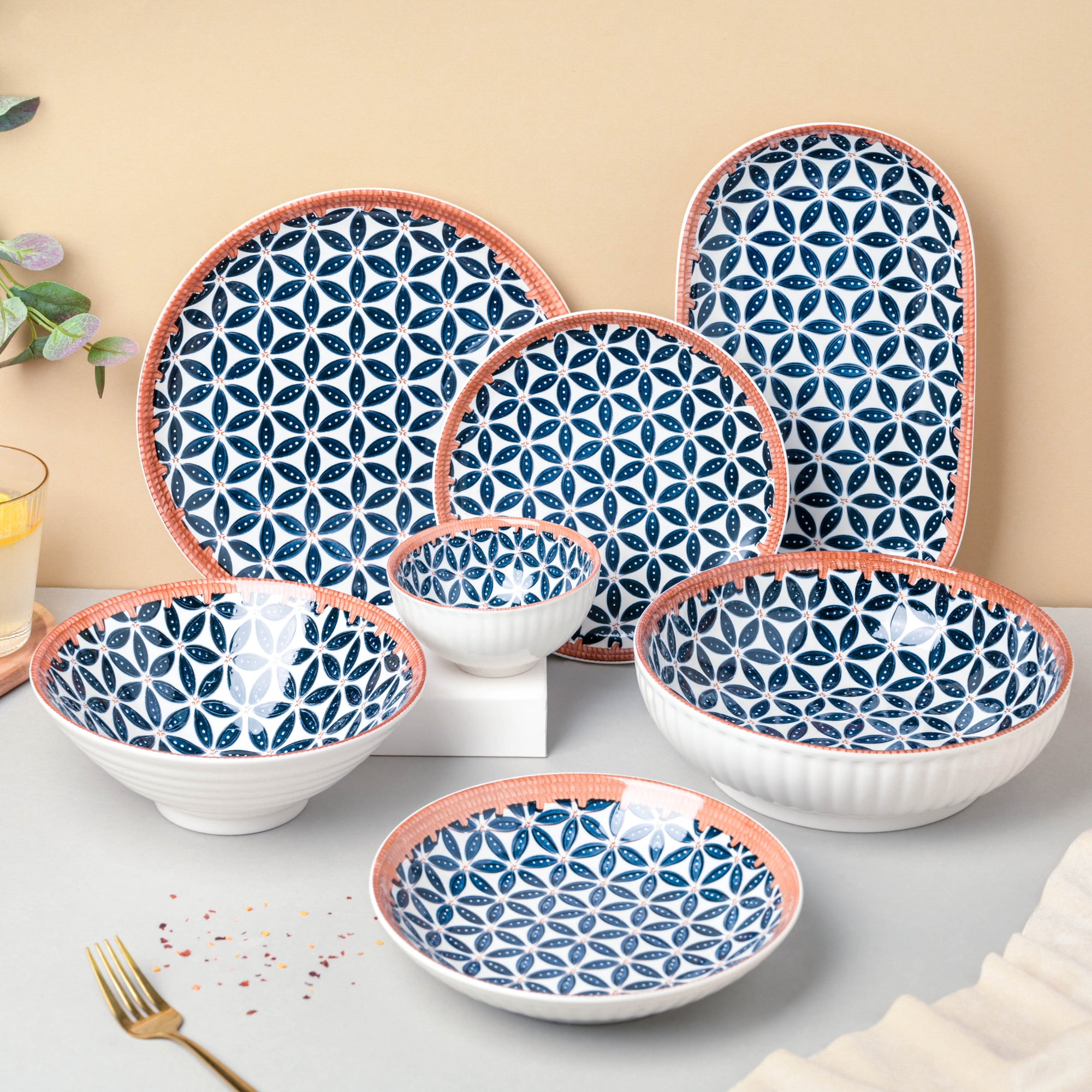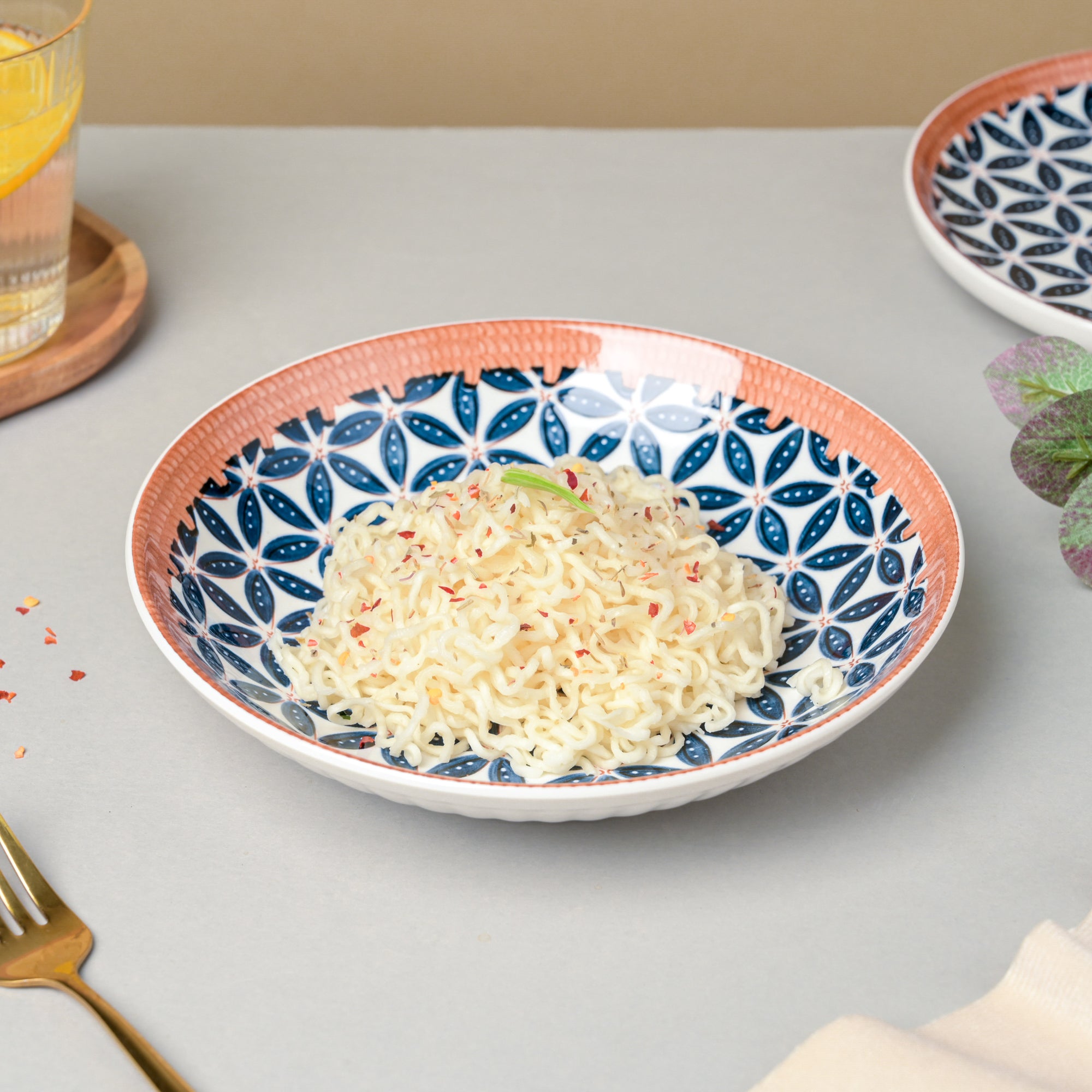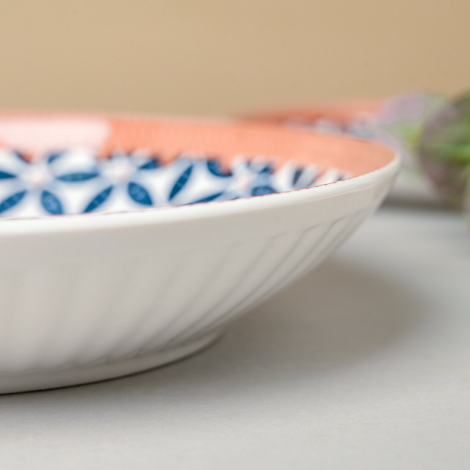 The ceramic snack dish in white and blue with its distinctive flower pattern stands out among other crockery. The deep dish can be used for serving fries and fritters or quick mixed fruit salad or vegetable salad. Serve appetisers on the ceramic dish or serve some spaghetti and meatballs. The sleek ceramic bowl with a textured exterior surface is ideal for presenting snacks during parties and has a contemporary appearance.