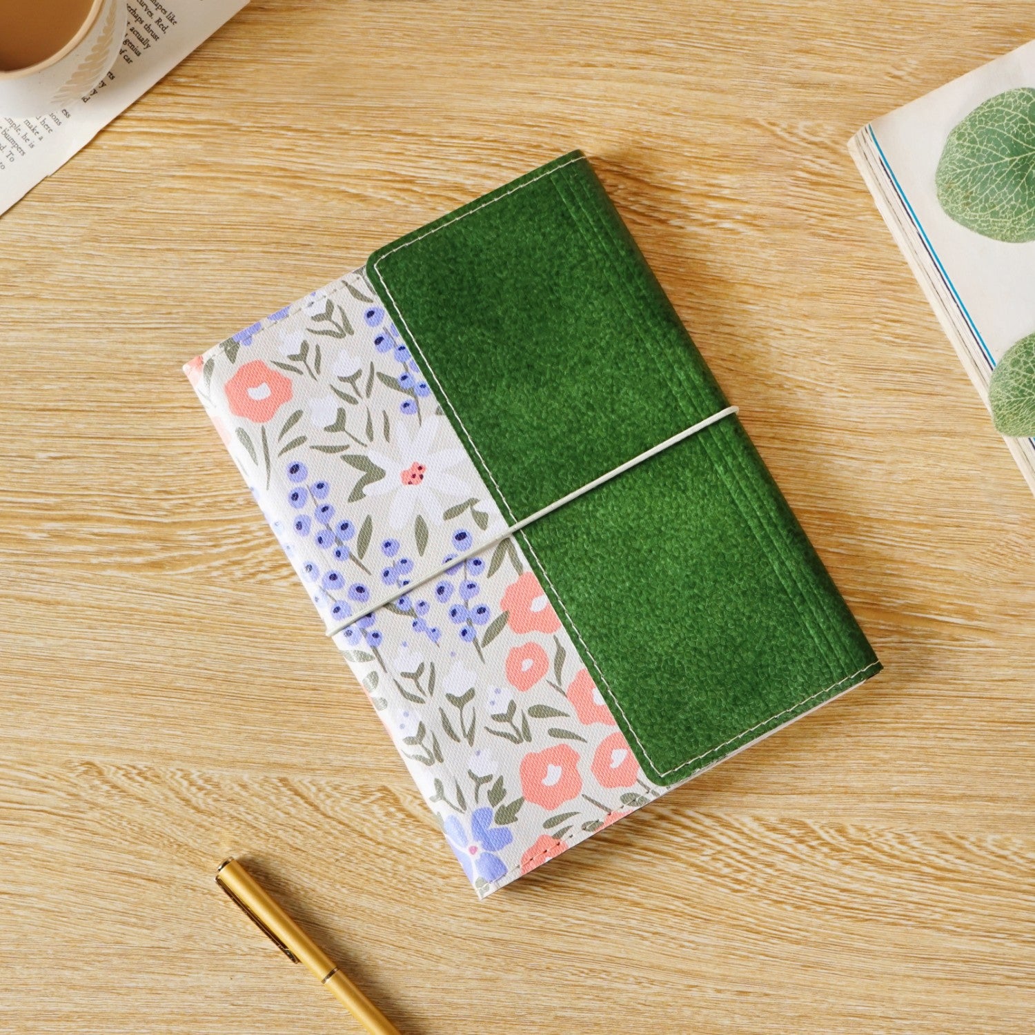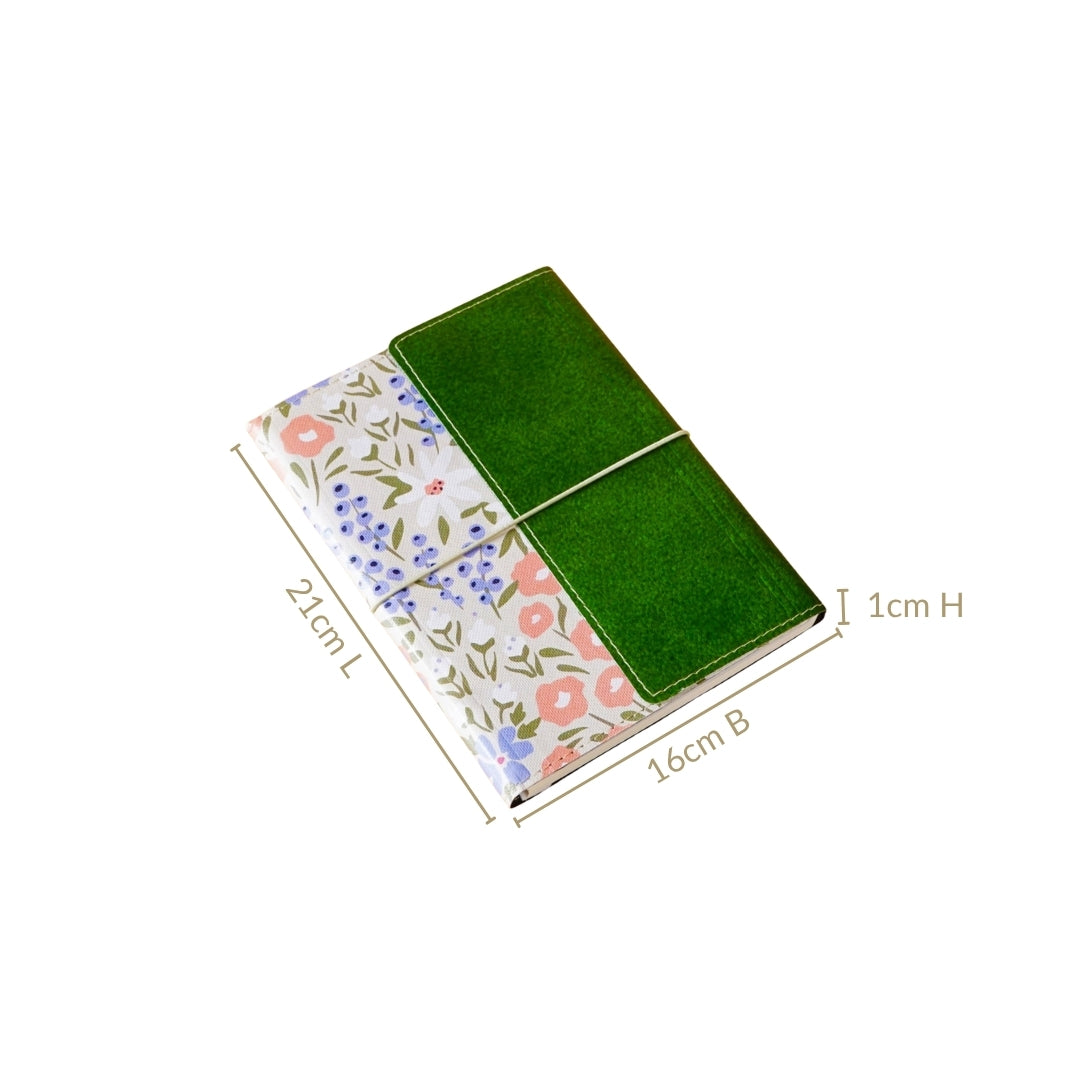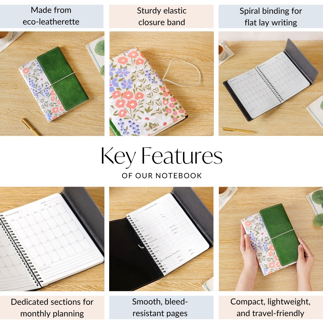 Design: This notebook boasts a stunning design that pairs structure with softness. One half is wrapped in deep green eco-leatherette, featuring a textured, pebbled finish and clean white stitch detailing, exuding elegance. The main cover blooms with delicate florals in pastel tones, soft whites, peach, dusky blues, and muted greens, all painted on a subtly textured cream base, echoing a happy garden. The notebook is secured with a slim white elastic band that gently hugs the cover, giving it a tied-journal charm while keeping your pages safe. The premium paper inside feels smooth under any ink. A strong black spiral binding allows the notebook to lie flat, making writing effortless, while the flap pocket inside securely holds quick-access items like notes and tickets. The inside includes structured sections for personal information, emergency contacts, monthly plans, and plenty of lined pages for free-form writing.