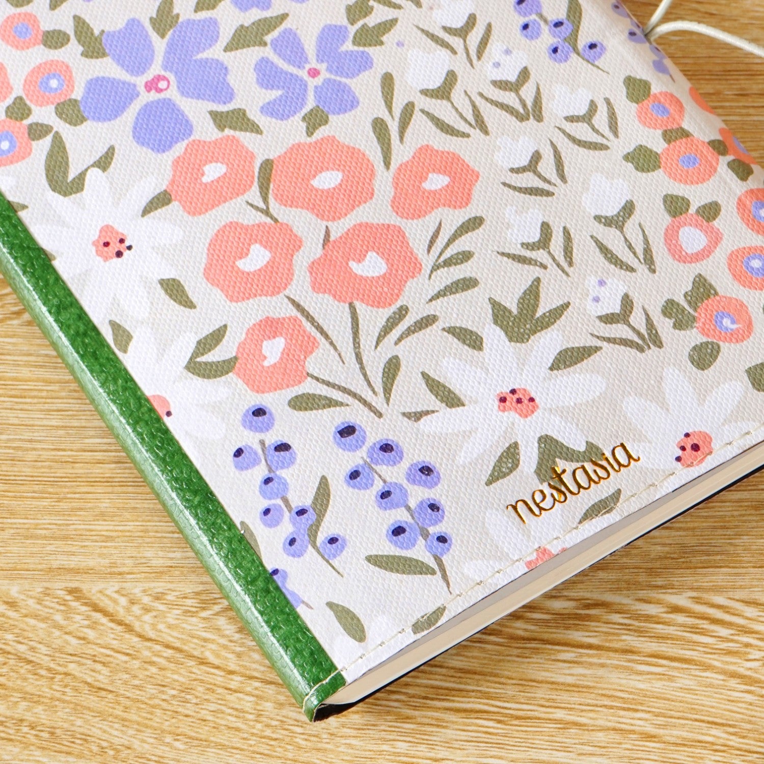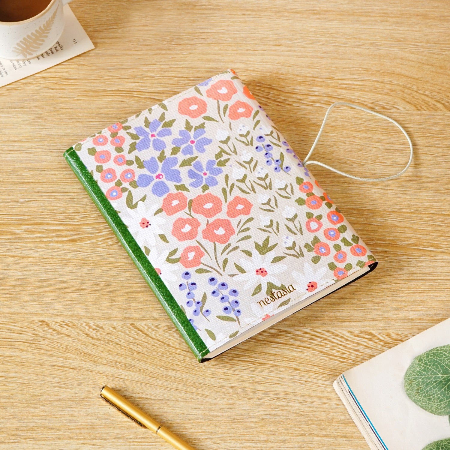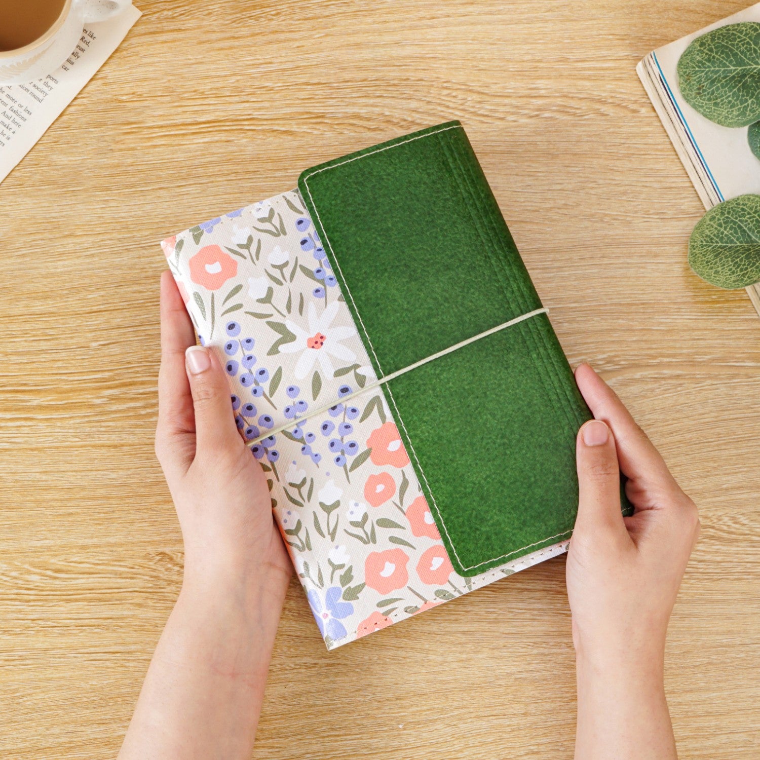 Design: This notebook boasts a stunning design that pairs structure with softness. One half is wrapped in deep green eco-leatherette, featuring a textured, pebbled finish and clean white stitch detailing, exuding elegance. The main cover blooms with delicate florals in pastel tones, soft whites, peach, dusky blues, and muted greens, all painted on a subtly textured cream base, echoing a happy garden. The notebook is secured with a slim white elastic band that gently hugs the cover, giving it a tied-journal charm while keeping your pages safe. The premium paper inside feels smooth under any ink. A strong black spiral binding allows the notebook to lie flat, making writing effortless, while the flap pocket inside securely holds quick-access items like notes and tickets. The inside includes structured sections for personal information, emergency contacts, monthly plans, and plenty of lined pages for free-form writing.